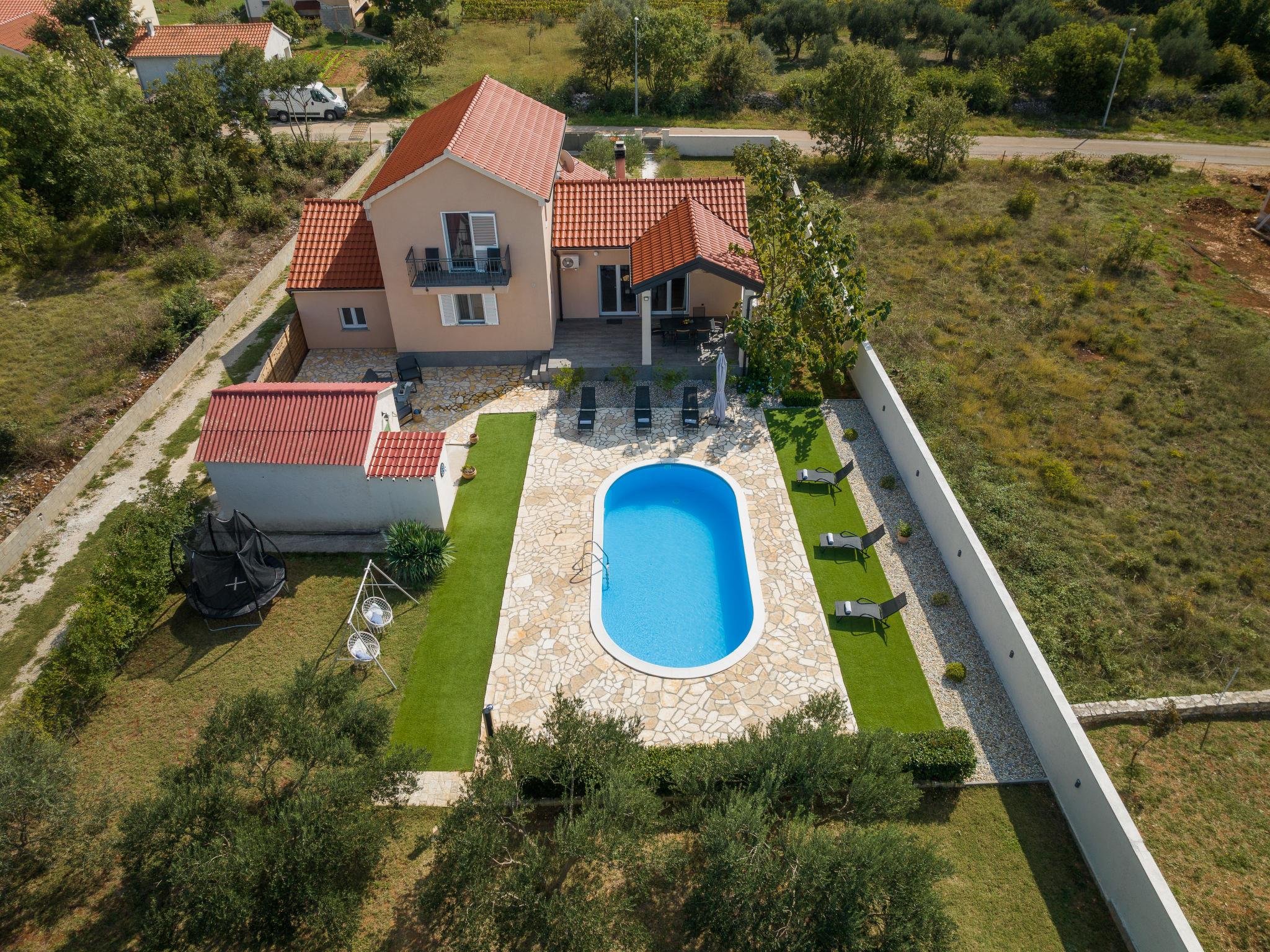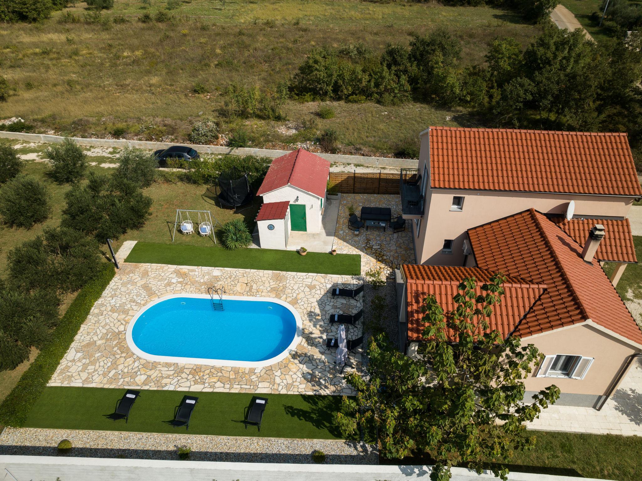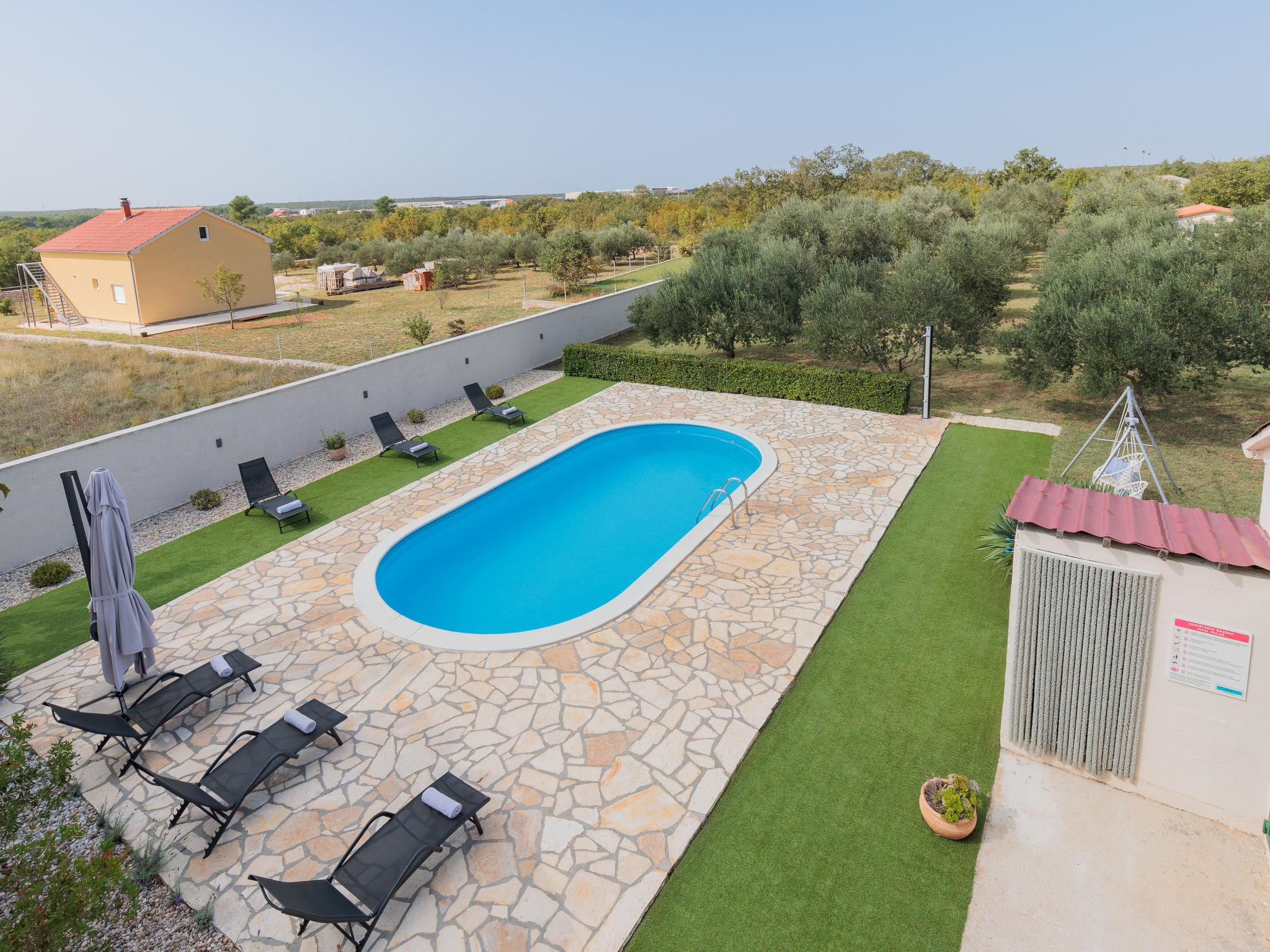 Policnik 12 km from Zadar: Beautiful single-family house "Josipa", 2 storeys. In a quiet, sunny position, 13 km from the sea. For shared use: property 2'000 m2 (fenced), trees. Private: swimming pool round (8 x 4 m, depth 150 cm, seasonal availability: 01.Apr. - 01.Oct.) with internal staircase. Outdoor shower, garden furniture, barbecue. In the house: internet access, washing machine. Shop 800 m, restaurant 12 km, bus stop 750 m, sandy beach 11 km pebble beach 13 km. Tennis 13 km. The owner does not accept any youth groups. Please note: airfield 10 km from the property.