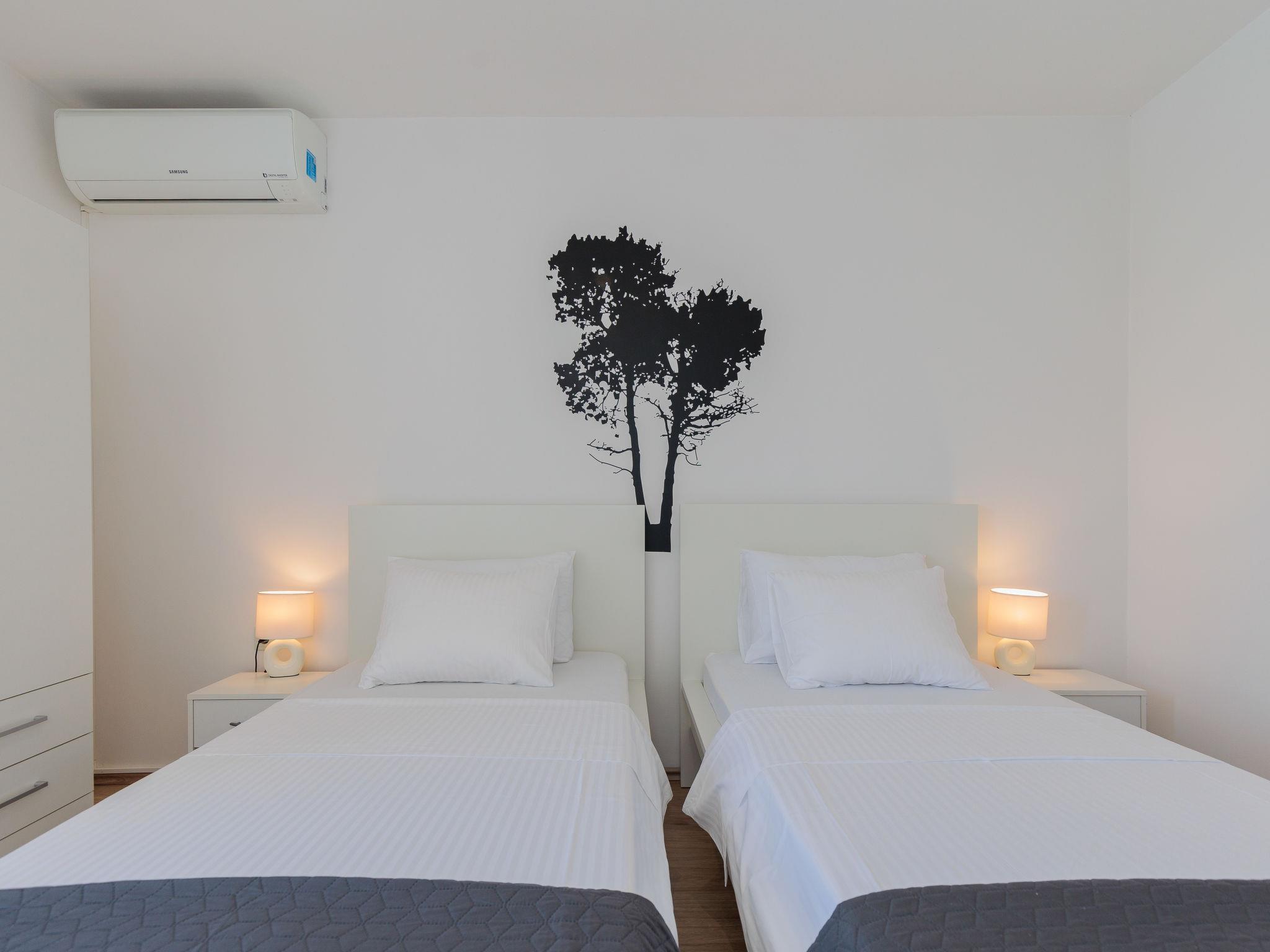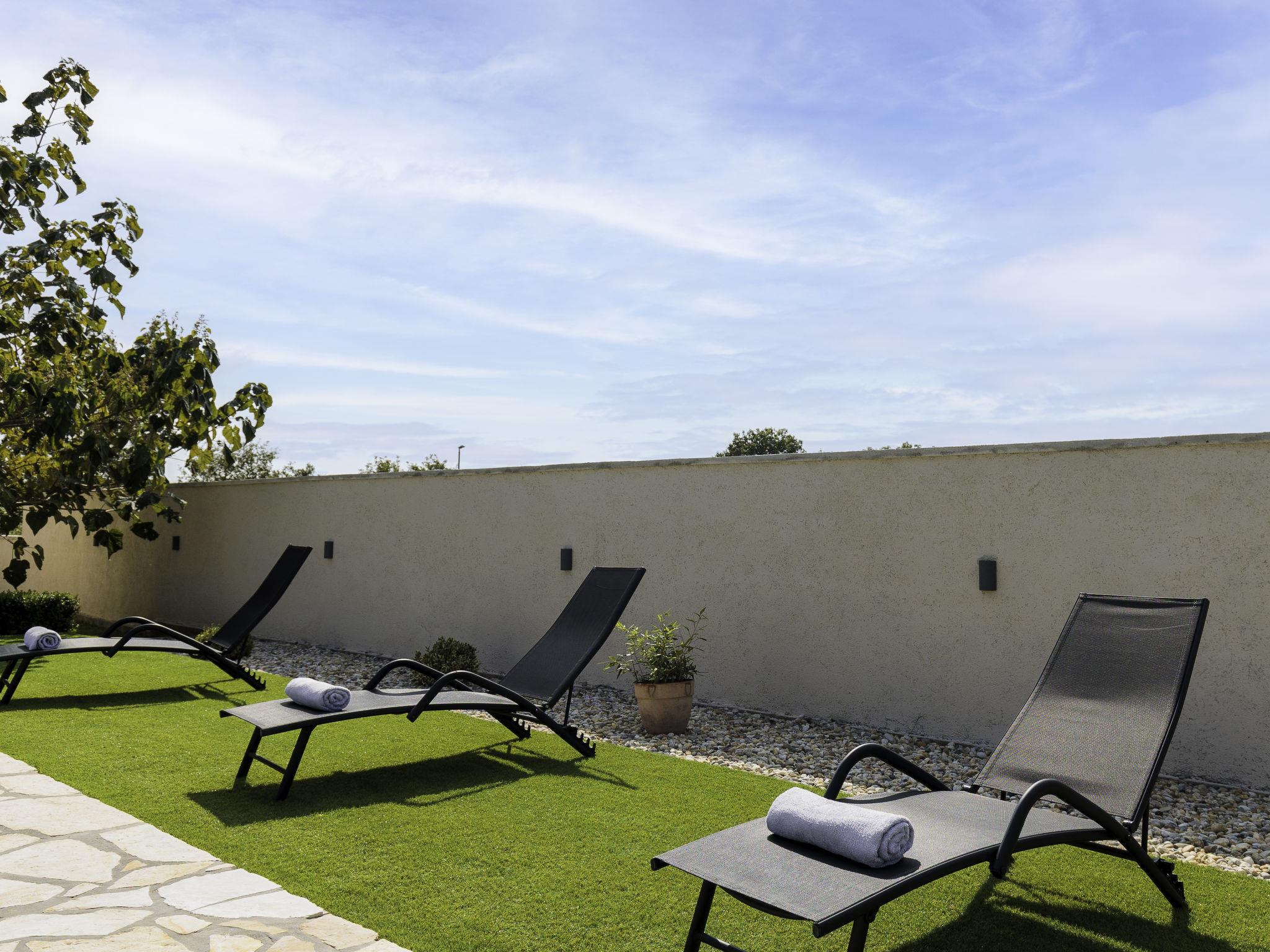 4-room house 140 m2 on 2 levels. Tasteful furnishings: living/dining room 30 m2 with satellite TV (flat screen). Exit to the terrace. 1 room with 1 french bed (160 cm, length 200 cm). Open kitchen (1 hot plate, oven, dishwasher, 3 gas rings, microwave, freezer, electric coffee machine) with air conditioning. Shower/WC. Upper floor: 1 room with 1 double bed (2 x 90 cm, length 200 cm), air conditioning. Exit to the terrace. 1 room with 2 beds (90 cm, length 200 cm), air conditioning. Bath/bidet/WC. No heating option. Terrace 4 m2, roofed. Terrace furniture. View of the garden. Facilities: safe, iron, hair dryer. Internet (WiFi, free).