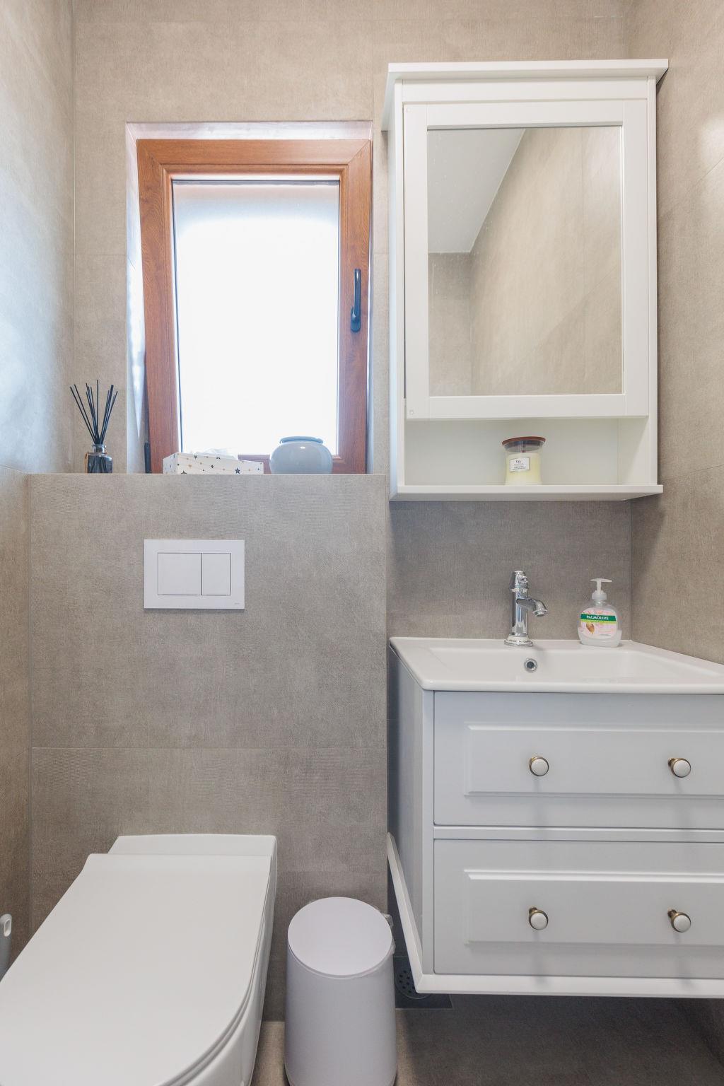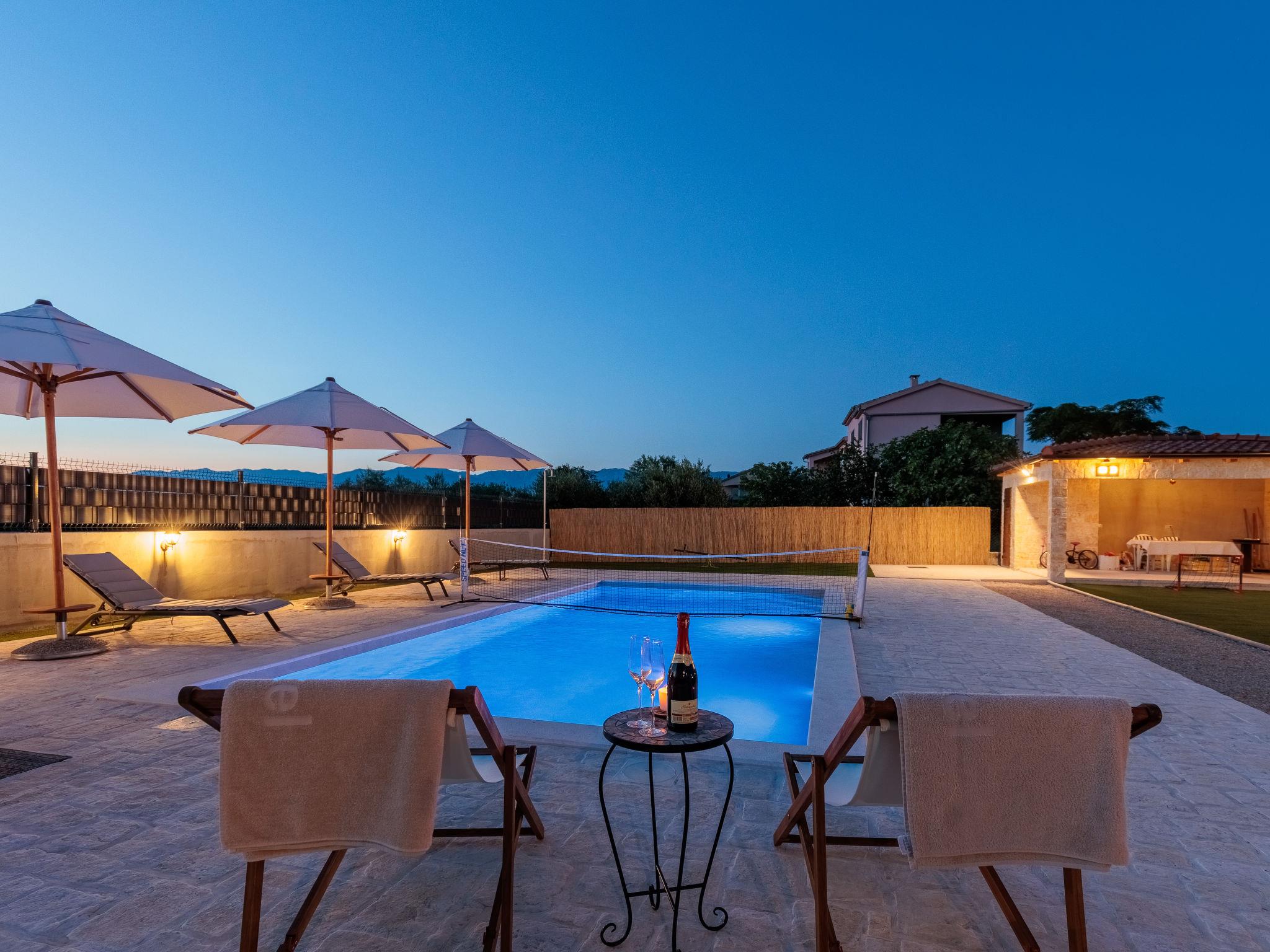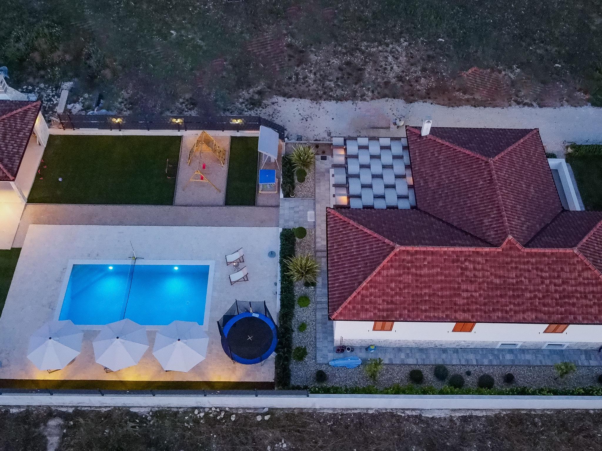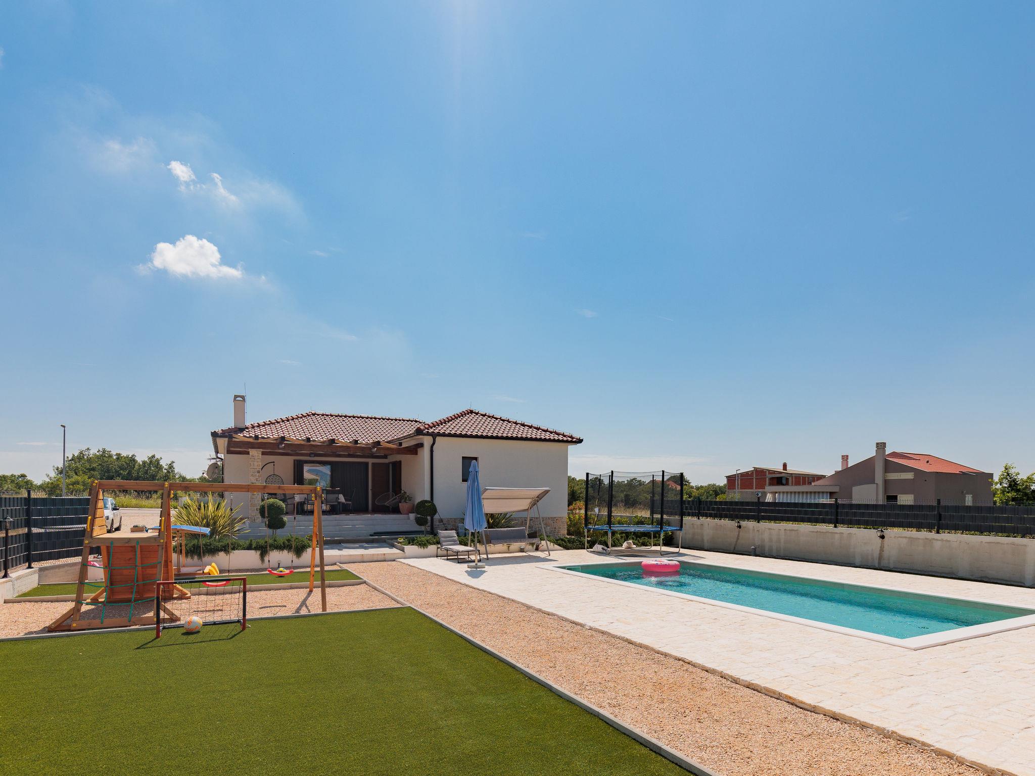 Beautiful, cosy single-family house "KLM", built in 2023. In the hamlet Rupalj 3.2 km from the centre of Policnik, 7.3 km from the centre of Posedarje, 16 km from the centre of Zadar, in a sunny position, 7 km from the sea. Private: property 1'000 m2 (fenced) with wildlife garden, swimming pool angular (8 x 4 m, 32 m2, depth 150 cm, seasonal availability: 01.Apr. - 01.Oct.) with internal staircase. Outdoor shower, volleyball, badminton, arbour (20 m2), barbecue (swing), pool maintenance by the owner/gardener. In the house: internet access, trampoline, washing machine. Parking (for 3 cars) at the house on the premises. Shop 300 m, restaurant 500 m, bus stop 750 m, sandy beach 7 km. Please note: airfield 21 km from the property.