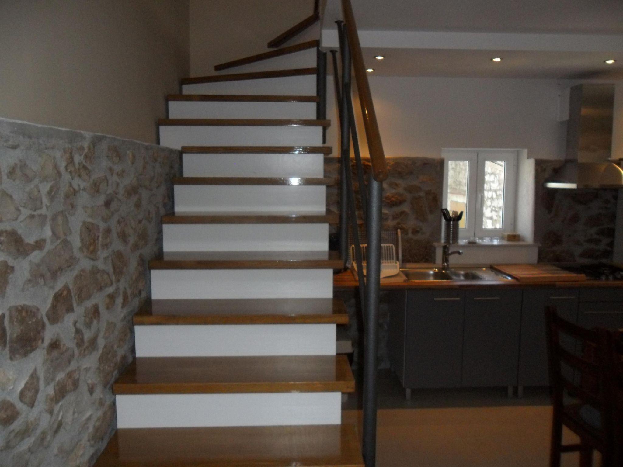 This fully air conditioned (hot/cold), 45 m² mezzanine apartment occupies the upper level of the three-storey house. An outer staircase leads up to your apartment with its own separate entrance, guaranteeing privacy. It features a living-/dining area with integrated open plan kitchen and a mezzanine bedroom with an en-suite bathroom. Rustic stone walls combined with contemporary furnishings create a modern country house atmosphere. The living area is furnished with a stylish metal frame sofa, cable and satellite TV, a radio and a wooden dining table with four matching chairs. The top modern fitted kitchen is complete with four hob cooker, oven, fridge with freezer compartment, electric kettle, a toaster and a coffee machine. A wide wooden staircase leads from the living area up to the mezzanine level where you will find a 140 cm x 200 cm double bed. The bright and airy modern bathroom has a generous shower cabin, a wash basin, wall mirror and a toilet. Reliable wireless internet access is available free of charge.