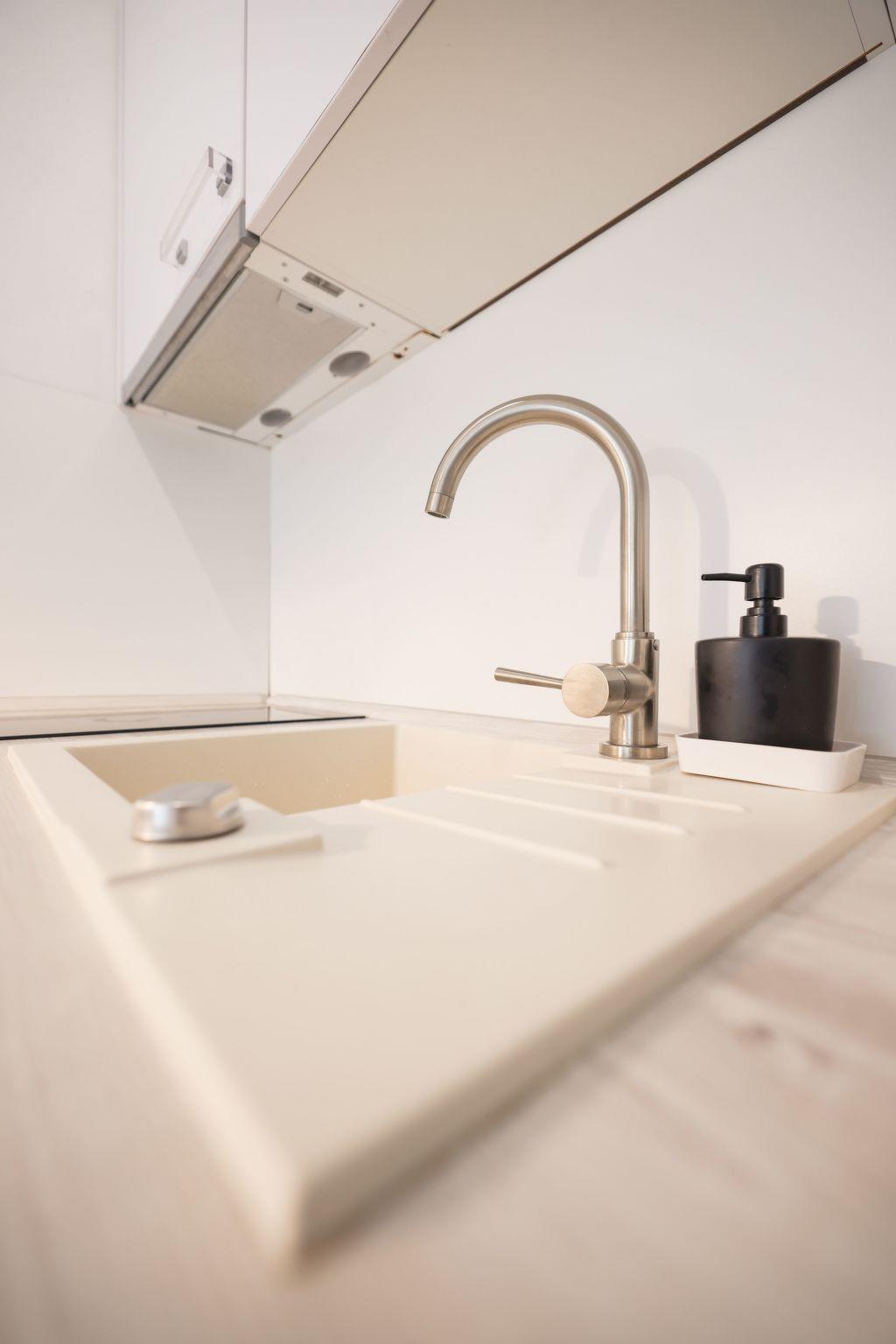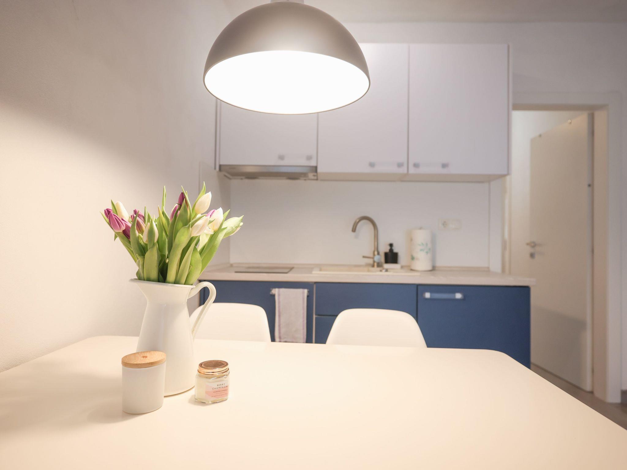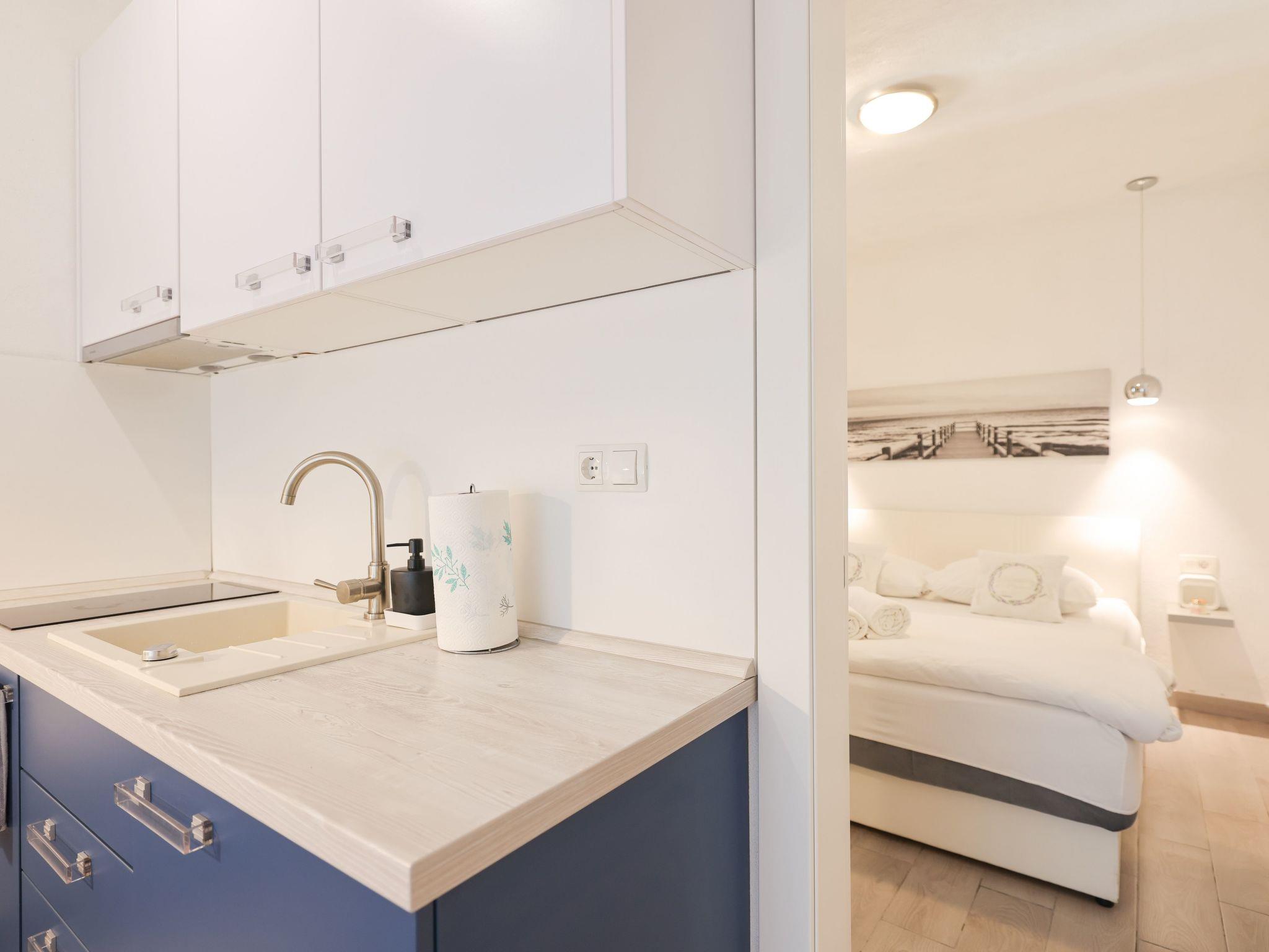 It is equipped to accommodate up to three persons and features a living area, fully equipped kitchen unit, a bright and modern bathroom and one double bedrooms. The bedrooms has a 160cm x 180cm king size bed. The living room enjoys air conditioning (hot/cold) and is furnished with a sofa, cable and satellite TV. The sofa can be converted into a bed, providing a comfortable additional sleeping space for one more persons. The kitchen is complete with Ceran cooktop, microwave fridge and large freezer compartment, electric kettle, coffee machine and a toaster. The modern bathroom is equipped with a shower, a wash basin with large walled mirror, and a toilet. WLAN internet access, inside the apartment and in the garden area, is available free of charge.