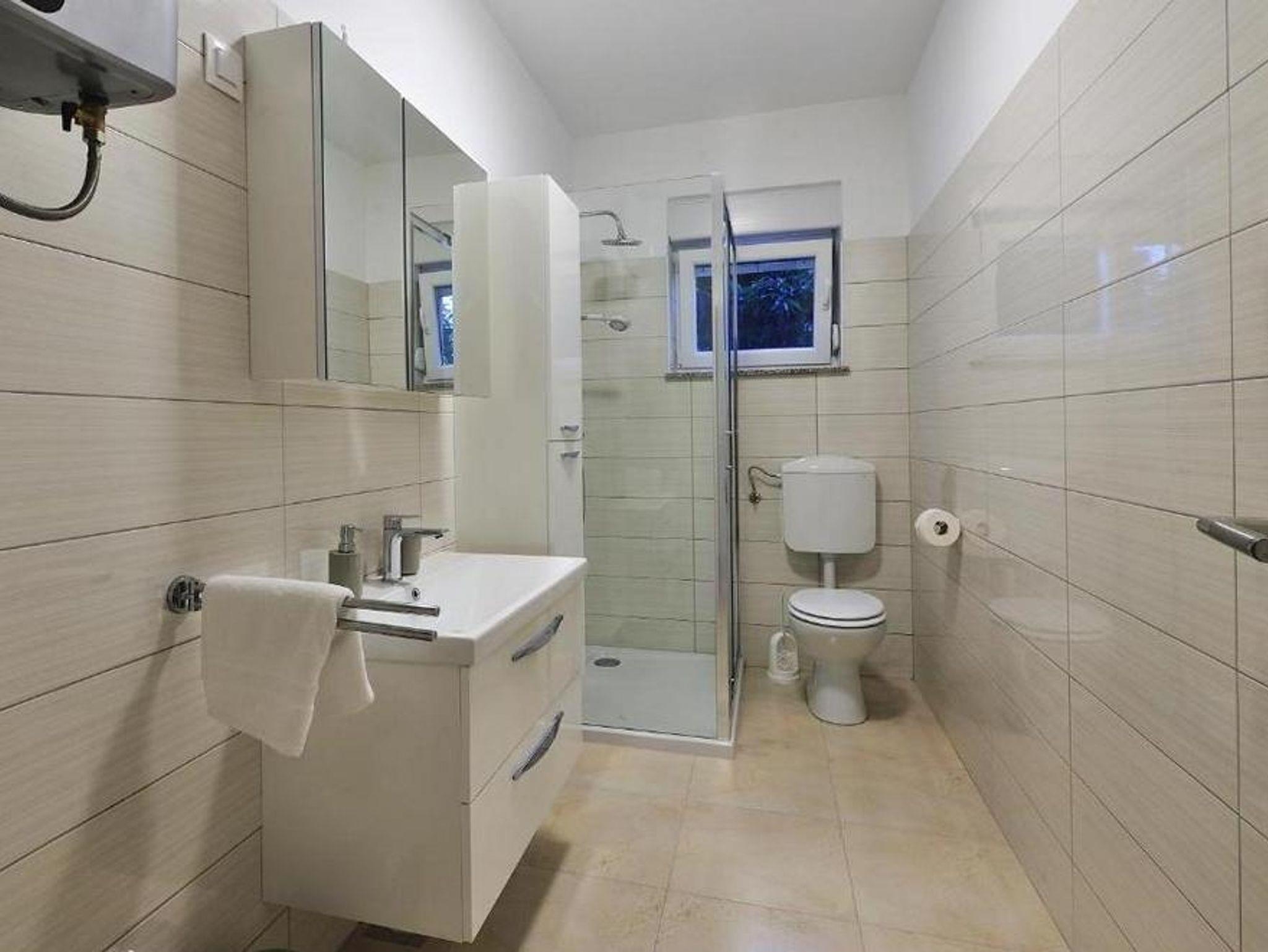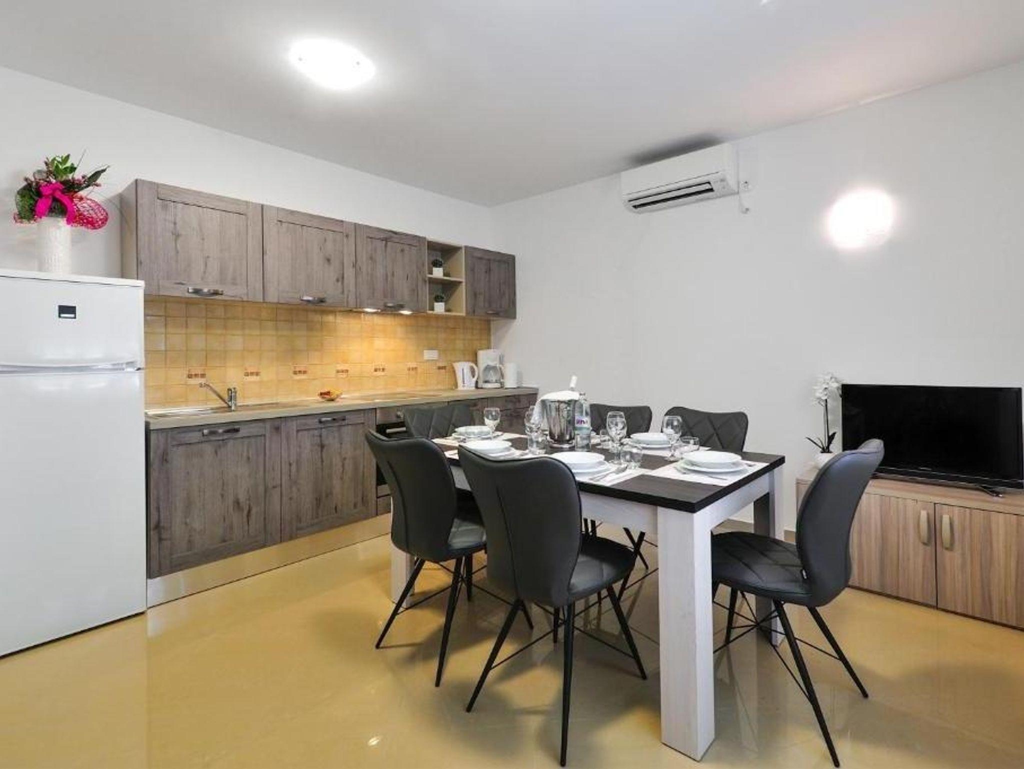 Ferienwohnung bietet Platz für 4 Gäste. Die Betten sind in Schlafzimmern, die es 1 gibt, und in Wohnzimmer, innerhalb einer Gesamtfläche von 46m2, angeordnet. Die Gäste haben eine eigene Terrasse zur Verfügung, auf der sie in warmen Sommernächten genießen können. Das Apartment bietet Meerblick. Es ist erlaubt, Speisen auf dem Gemeinschafts-Grill vorzubereiten. IM PREIS INBEGRIFFEN: Kurtaxe, Endreinigung, Klimatisierung, Parkplatz, Internet, Kinderbett, Bügeleisen, Bügelbrett, Föhn, tragbarer Grill. VERBINDLICHE ZUSÄTZLICHE KOSTEN: Aufzahlung für Kurzaufenthalte (prozentualer Zuschlag pro Nächtigungsanzahl: 30% - 1, 20% - 2, 10% - 3). Die Verfügbarkeit zusätzlicher Dienstleistungen in Ihrem reservierten Termin und die Preise derselben (falls nicht aufgeführt) müssen im Voraus überprüft werden. Zusätzliche Dienstleistungen die in der Zahlungsaufforderung nicht aufgeführt sind werden direkt beim Vermieter bezahlt, angenommen der Gast nutzt auch diese. Ermäßigung auf den Grundpreis: Gratistag 14=13 (bei einem Aufenthalt von 14 Tagen oder mehr erhalten Sie einen Gratistag für den Aufenthalt bis 31.12.26).