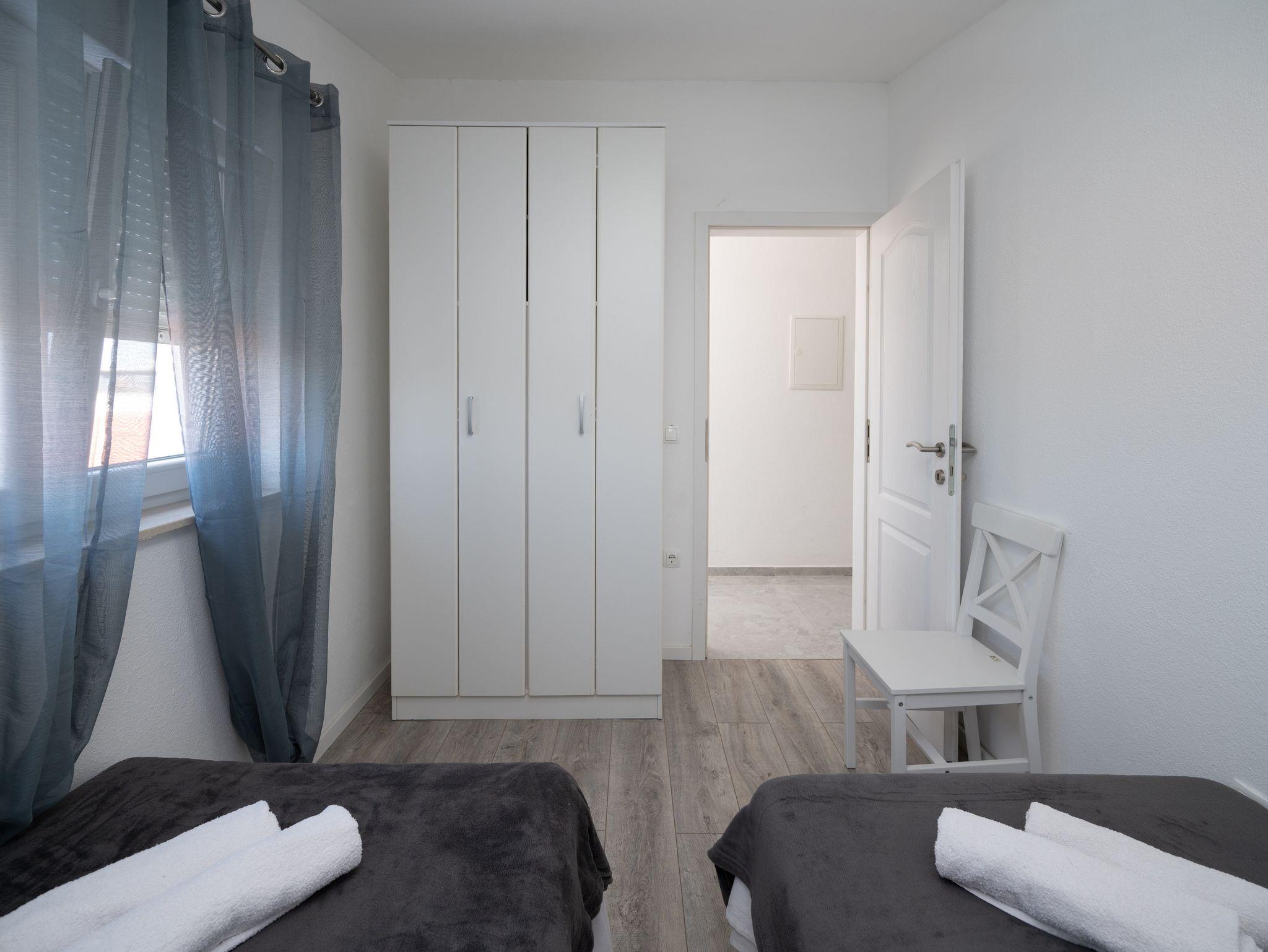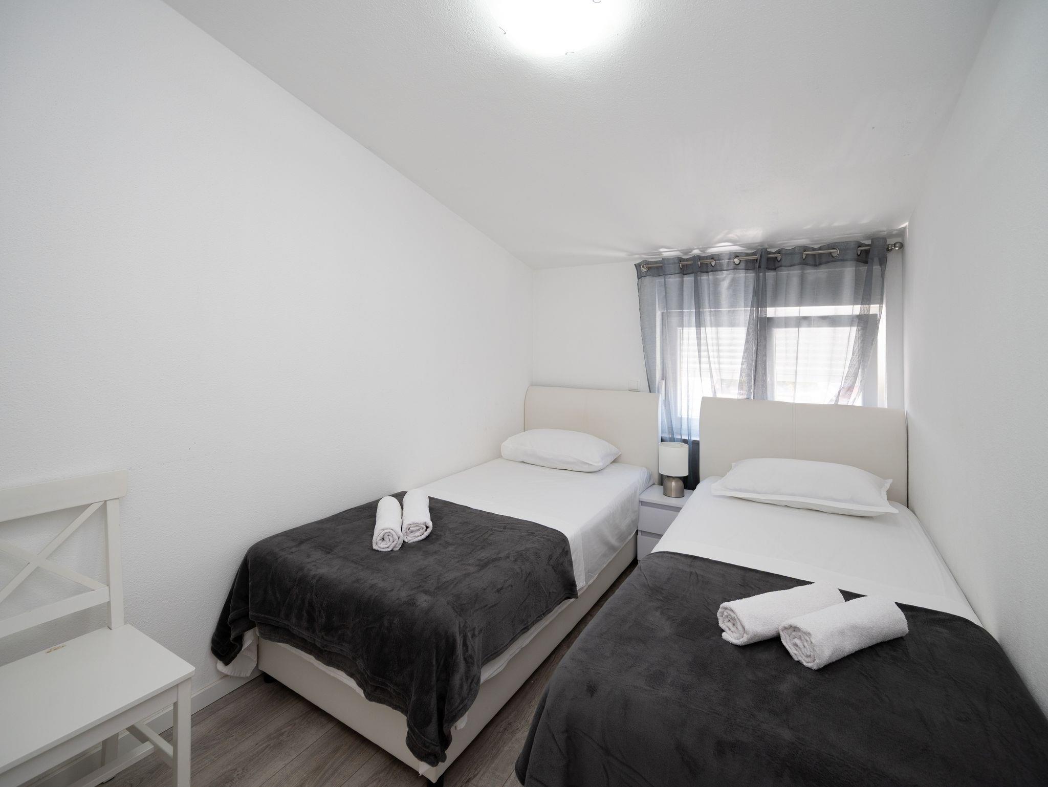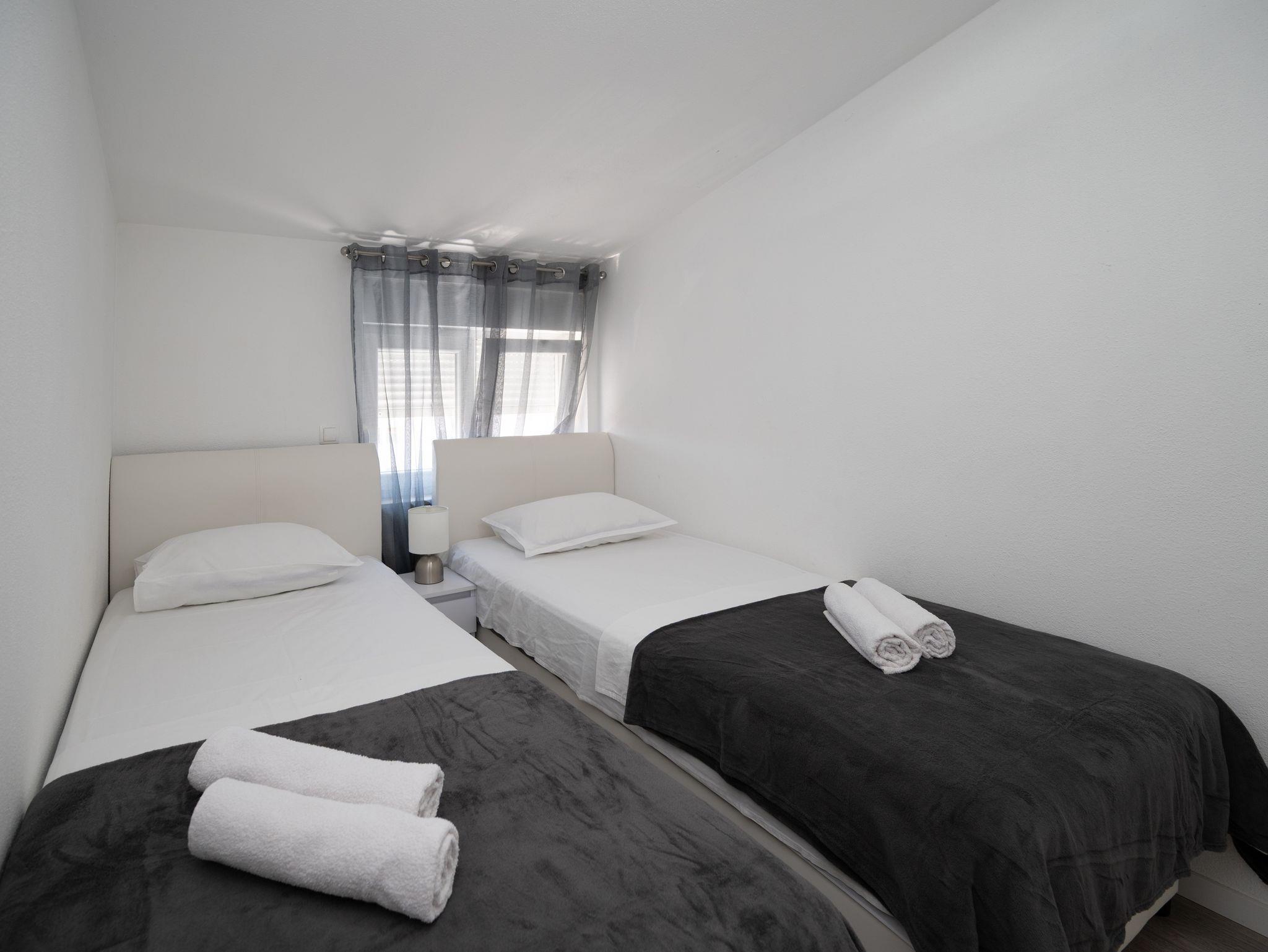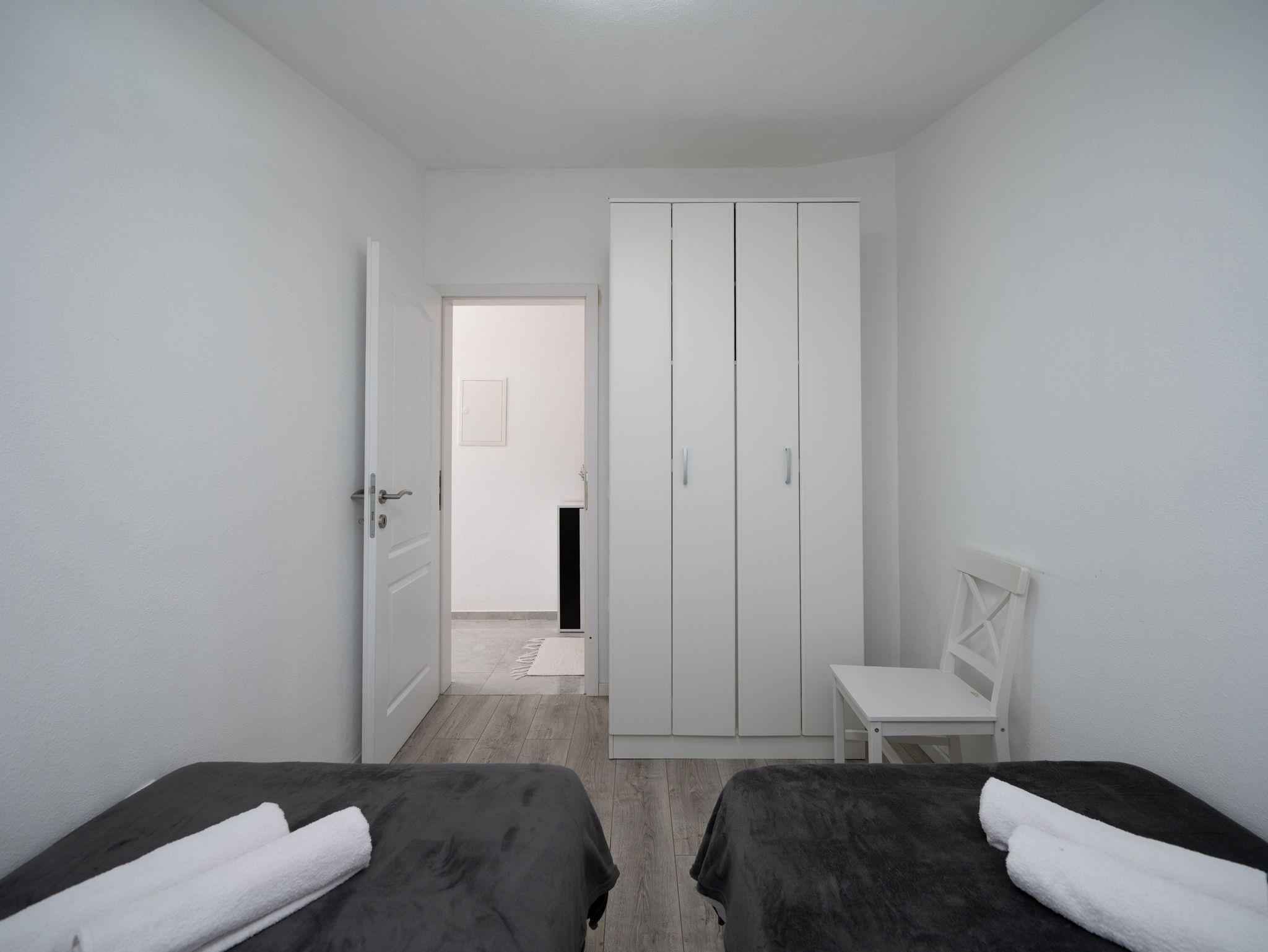 Ferienwohnung bietet Platz für 6 Gäste. Die Betten sind in Schlafzimmern, die es 2 gibt, und in Wohnzimmer, innerhalb einer Gesamtfläche von 45m2, angeordnet. Die Gäste haben einen eigenen Balkon zur Verfügung, auf der sie in warmen Sommernächten genießen können. Es ist erlaubt, Speisen auf dem Gemeinschafts-Grill vorzubereiten. Räume der gebuchten Unterkunftseinheit werden nicht in eine Ganze verbunden. IM PREIS INBEGRIFFEN: Kurtaxe, Endreinigung, Klimatisierung, Parkplatz, Internet, Bügeleisen, Bügelbrett, Föhn. VERBINDLICHE ZUSÄTZLICHE KOSTEN: Aufzahlung für Kurzaufenthalte (prozentualer Zuschlag pro Nächtigungsanzahl: 30% - 1, 20% - 2, 10% - 3). Die Verfügbarkeit zusätzlicher Dienstleistungen in Ihrem reservierten Termin und die Preise derselben (falls nicht aufgeführt) müssen im Voraus überprüft werden. Zusätzliche Dienstleistungen die in der Zahlungsaufforderung nicht aufgeführt sind werden direkt beim Vermieter bezahlt, angenommen der Gast nutzt auch diese. Ermäßigung auf den Grundpreis: Gratistag 14=13 (bei einem Aufenthalt von 14 Tagen oder mehr erhalten Sie einen Gratistag für den Aufenthalt bis 31.12.26).
