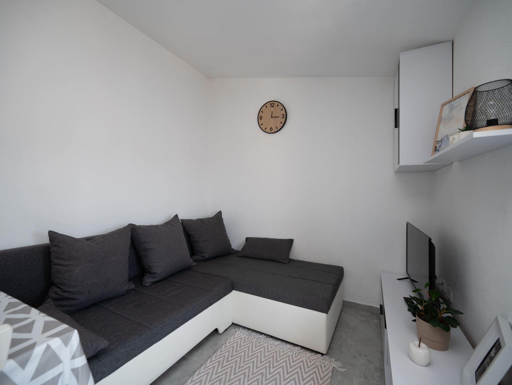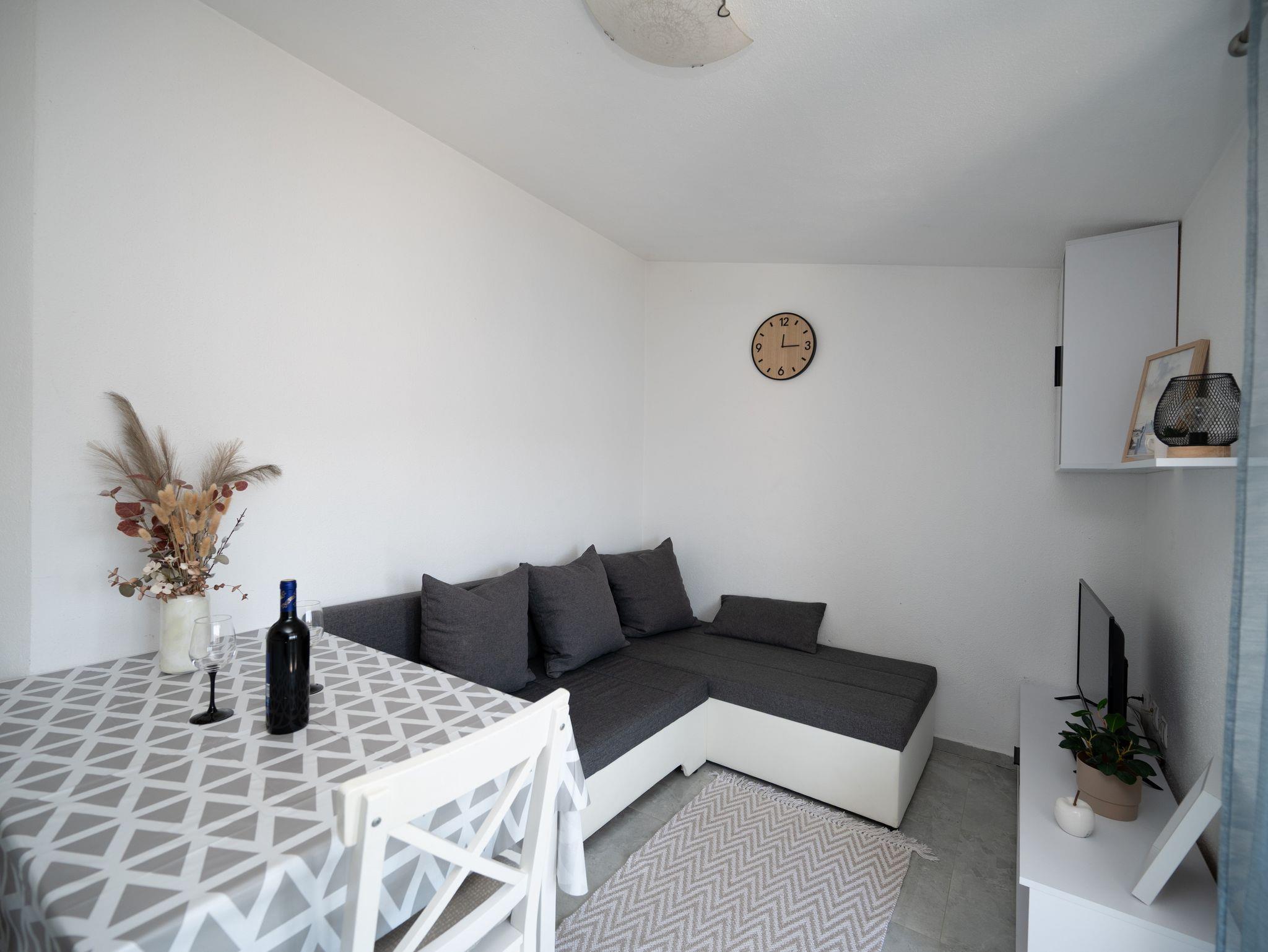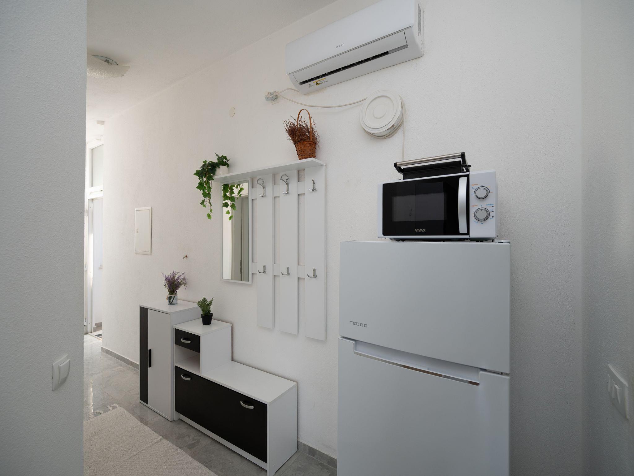 Ferienwohnung bietet Platz für 6 Gäste. Die Betten sind in Schlafzimmern, die es 2 gibt, und in Wohnzimmer, innerhalb einer Gesamtfläche von 45m2, angeordnet. Die Gäste haben einen eigenen Balkon zur Verfügung, auf der sie in warmen Sommernächten genießen können. Es ist erlaubt, Speisen auf dem Gemeinschafts-Grill vorzubereiten. Räume der gebuchten Unterkunftseinheit werden nicht in eine Ganze verbunden. IM PREIS INBEGRIFFEN: Kurtaxe, Endreinigung, Klimatisierung, Parkplatz, Internet, Bügeleisen, Bügelbrett, Föhn. VERBINDLICHE ZUSÄTZLICHE KOSTEN: Aufzahlung für Kurzaufenthalte (prozentualer Zuschlag pro Nächtigungsanzahl: 30% - 1, 20% - 2, 10% - 3). Die Verfügbarkeit zusätzlicher Dienstleistungen in Ihrem reservierten Termin und die Preise derselben (falls nicht aufgeführt) müssen im Voraus überprüft werden. Zusätzliche Dienstleistungen die in der Zahlungsaufforderung nicht aufgeführt sind werden direkt beim Vermieter bezahlt, angenommen der Gast nutzt auch diese. Ermäßigung auf den Grundpreis: Gratistag 14=13 (bei einem Aufenthalt von 14 Tagen oder mehr erhalten Sie einen Gratistag für den Aufenthalt bis 31.12.26).