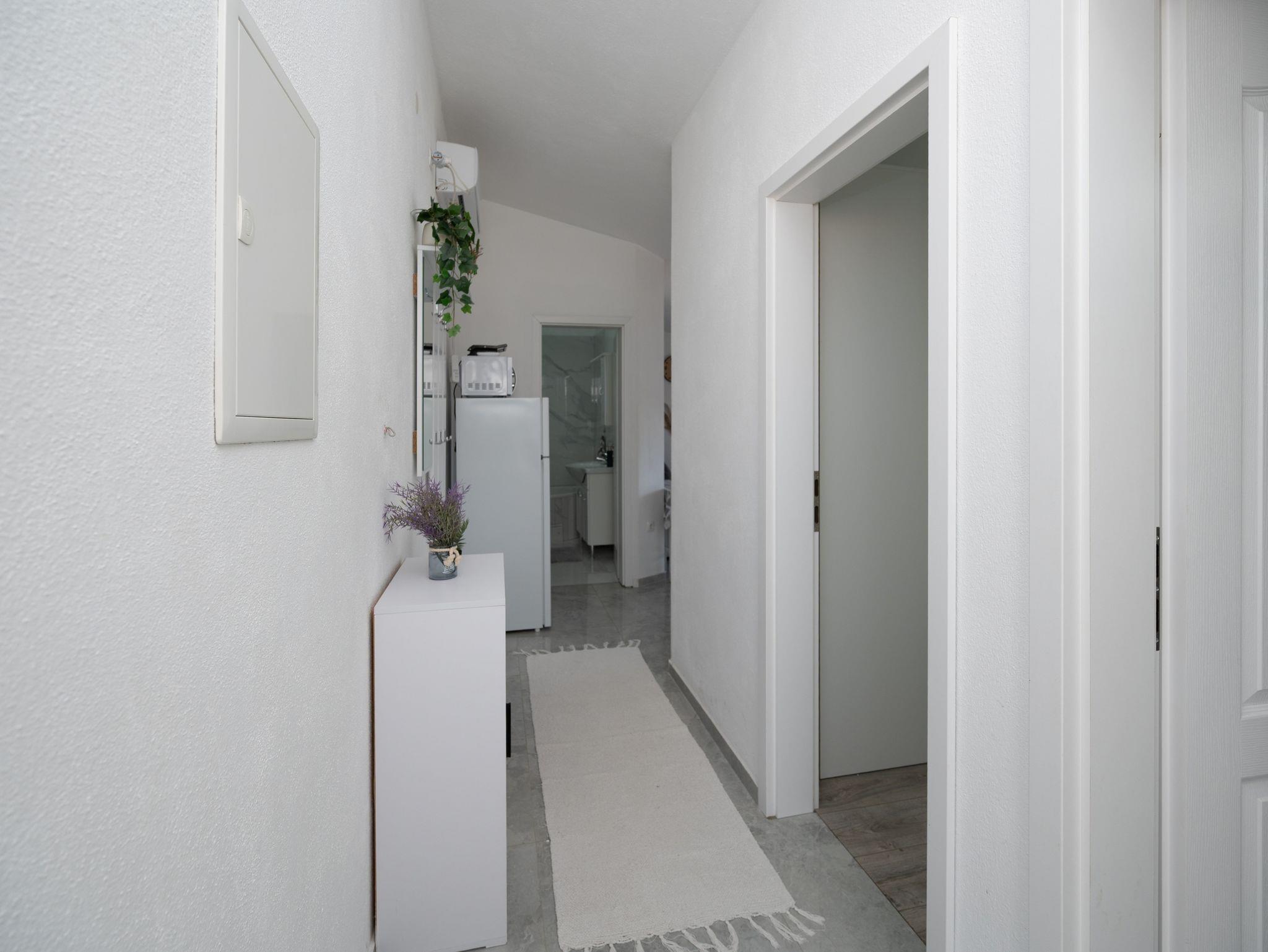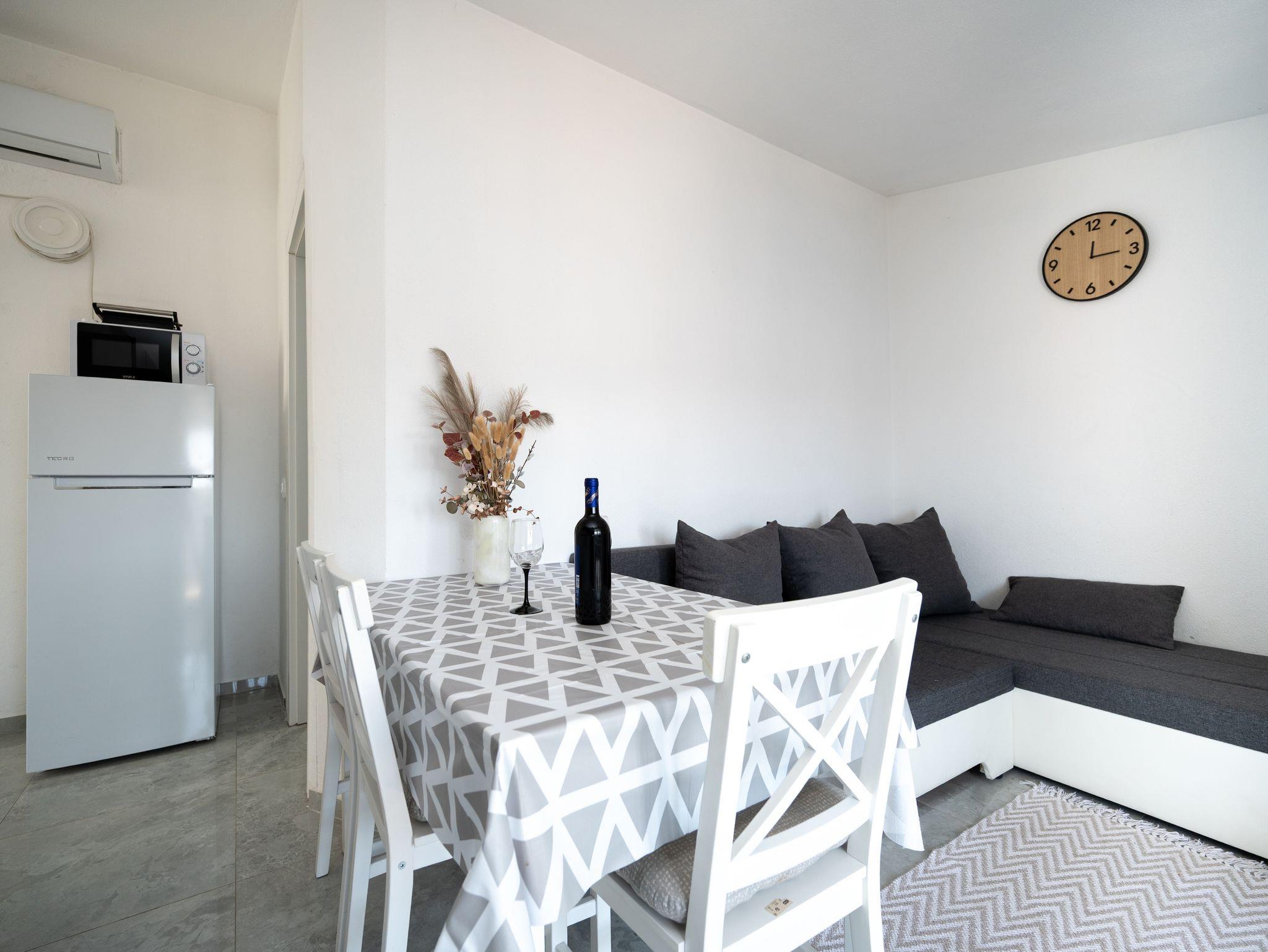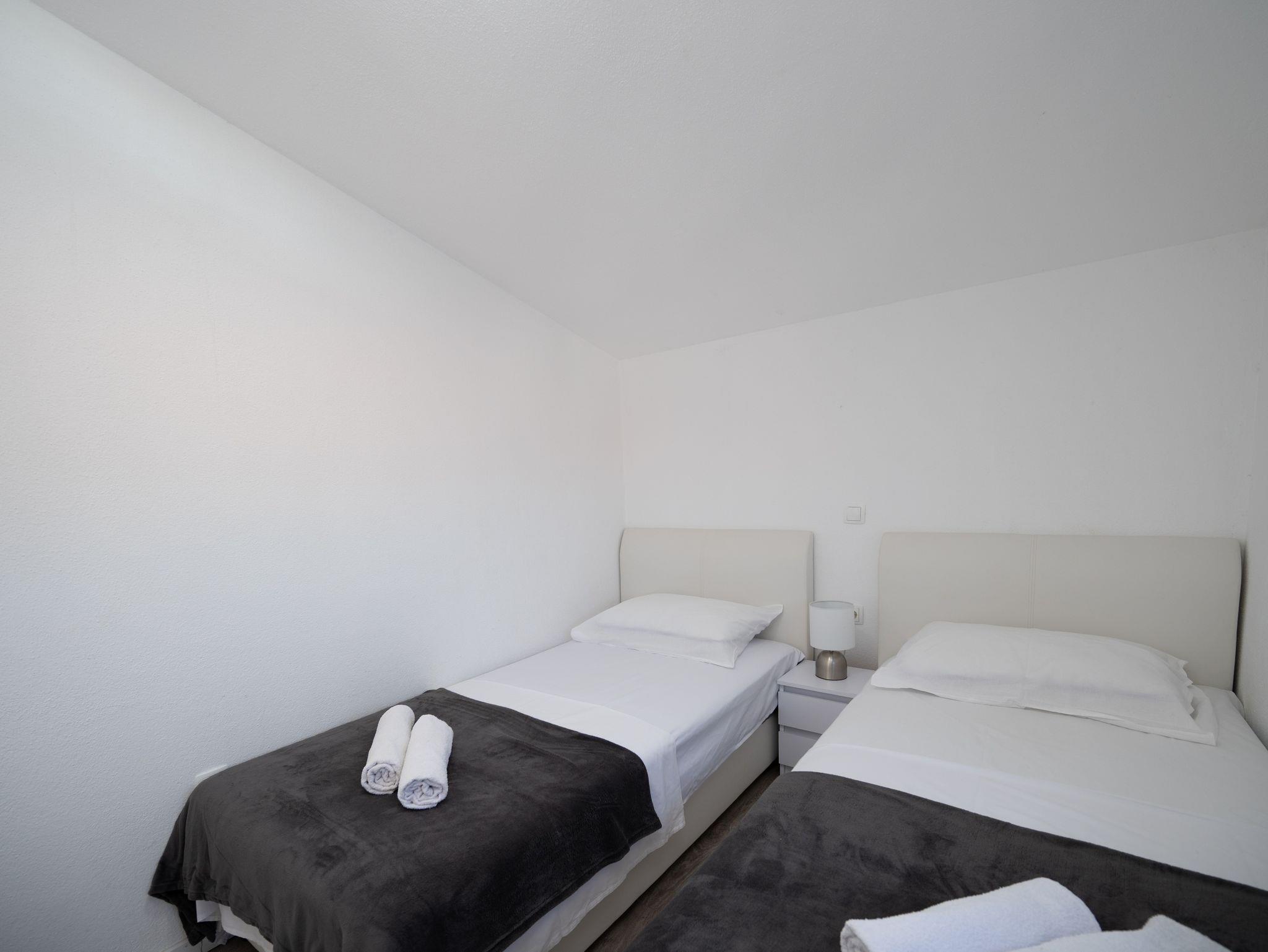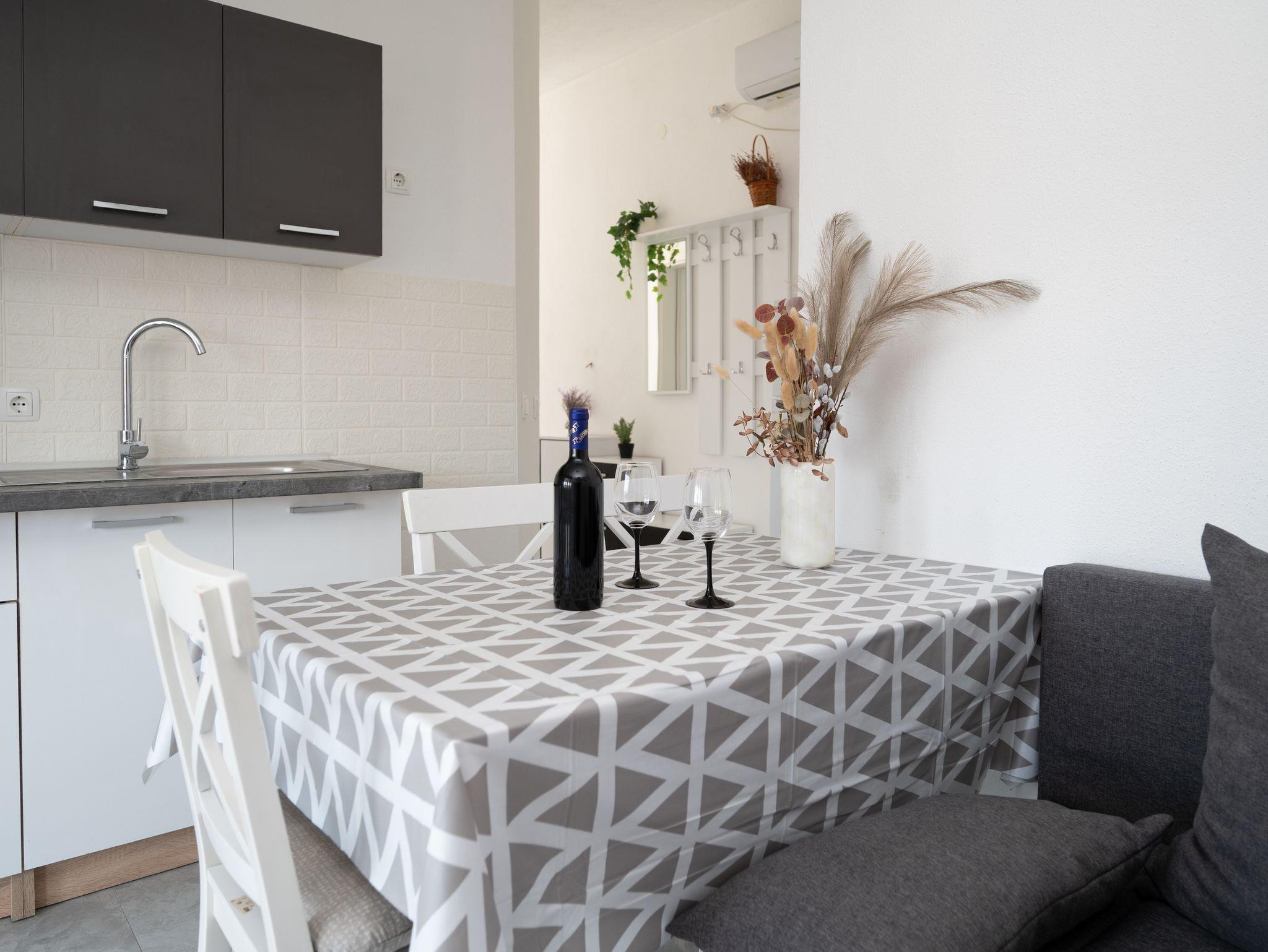 Ferienwohnung bietet Platz für 6 Gäste. Die Betten sind in Schlafzimmern, die es 2 gibt, und in Wohnzimmer, innerhalb einer Gesamtfläche von 45m2, angeordnet. Die Gäste haben einen eigenen Balkon zur Verfügung, auf der sie in warmen Sommernächten genießen können. Es ist erlaubt, Speisen auf dem Gemeinschafts-Grill vorzubereiten. Räume der gebuchten Unterkunftseinheit werden nicht in eine Ganze verbunden. IM PREIS INBEGRIFFEN: Kurtaxe, Endreinigung, Klimatisierung, Parkplatz, Internet, Bügeleisen, Bügelbrett, Föhn. VERBINDLICHE ZUSÄTZLICHE KOSTEN: Aufzahlung für Kurzaufenthalte (prozentualer Zuschlag pro Nächtigungsanzahl: 30% - 1, 20% - 2, 10% - 3). Die Verfügbarkeit zusätzlicher Dienstleistungen in Ihrem reservierten Termin und die Preise derselben (falls nicht aufgeführt) müssen im Voraus überprüft werden. Zusätzliche Dienstleistungen die in der Zahlungsaufforderung nicht aufgeführt sind werden direkt beim Vermieter bezahlt, angenommen der Gast nutzt auch diese. Ermäßigung auf den Grundpreis: Gratistag 14=13 (bei einem Aufenthalt von 14 Tagen oder mehr erhalten Sie einen Gratistag für den Aufenthalt bis 31.12.26).