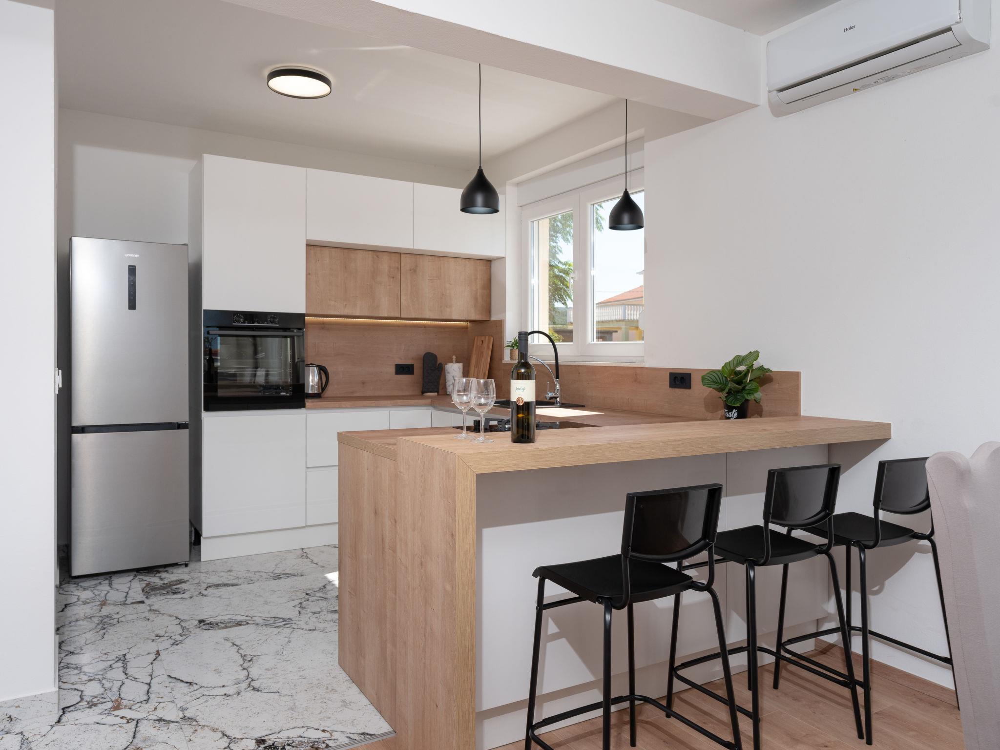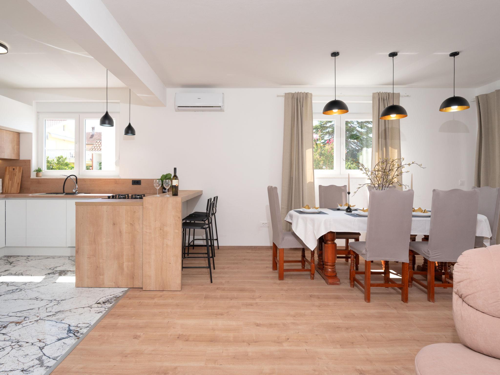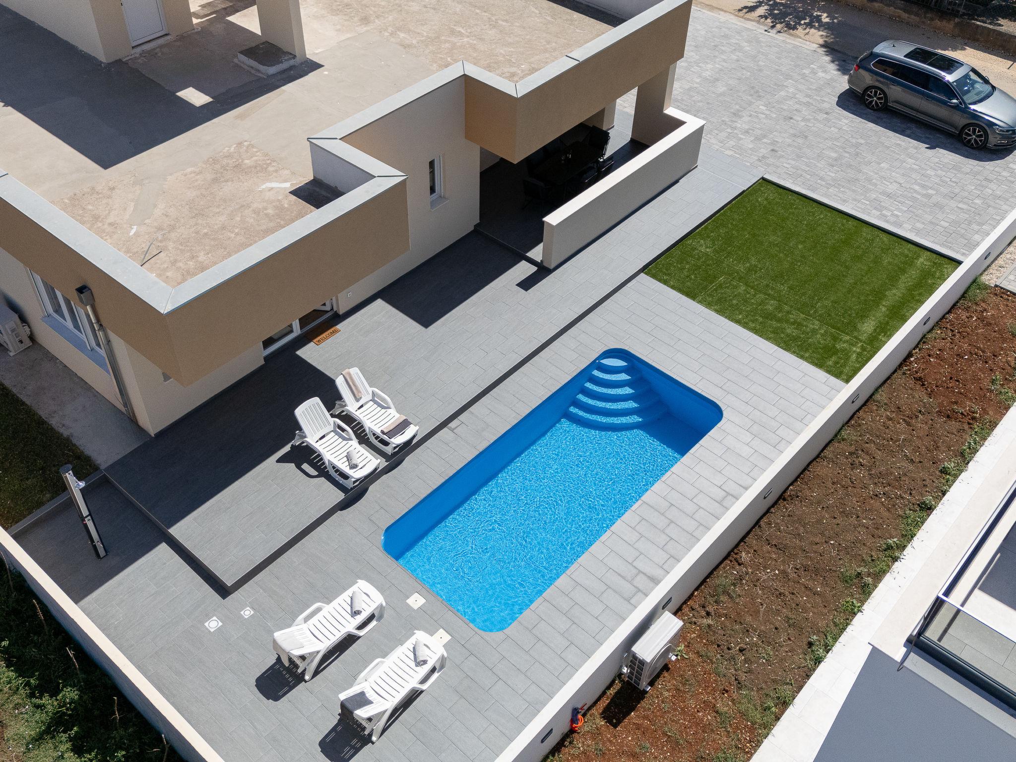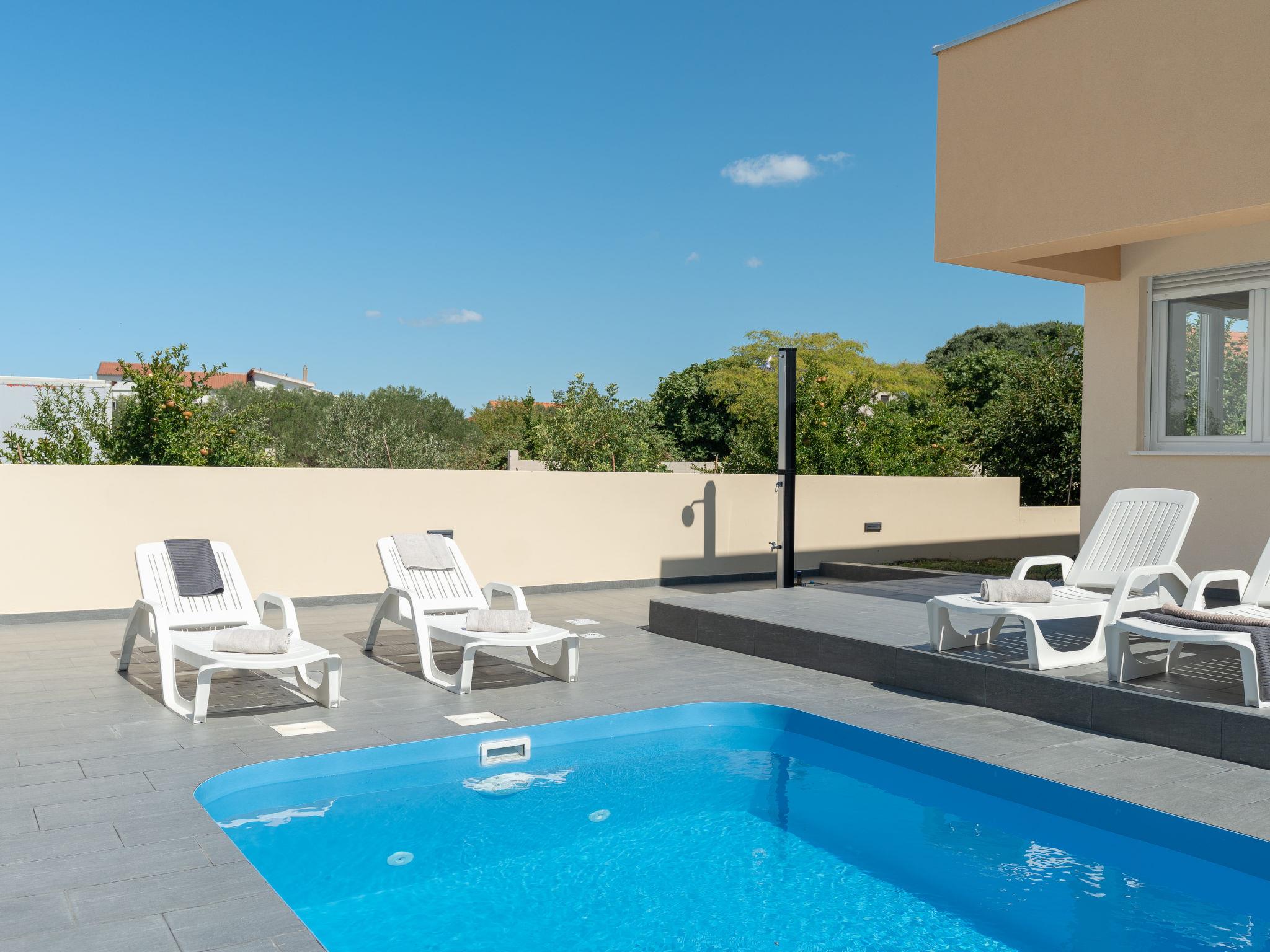 Beautiful villa "Sinjorina". In a sunny position, 250 m from the sea, 250 m from the beach. Private: property 600 m2, swimming pool angular (7 x 3 m, 27 m2, depth 150 cm, seasonal availability: 15.Jun. - 15.Oct.) with internal staircase. Outdoor shower, garden furniture. In the house: internet access, washing machine. Parking (for 2 cars) at the house on the premises. Shop 400 m, restaurant 500 m, bus stop 2 km, pebble beach 250 m, public bathing area 300 m. Marina 2 km. Nearby attractions: Aquapark 25 km.