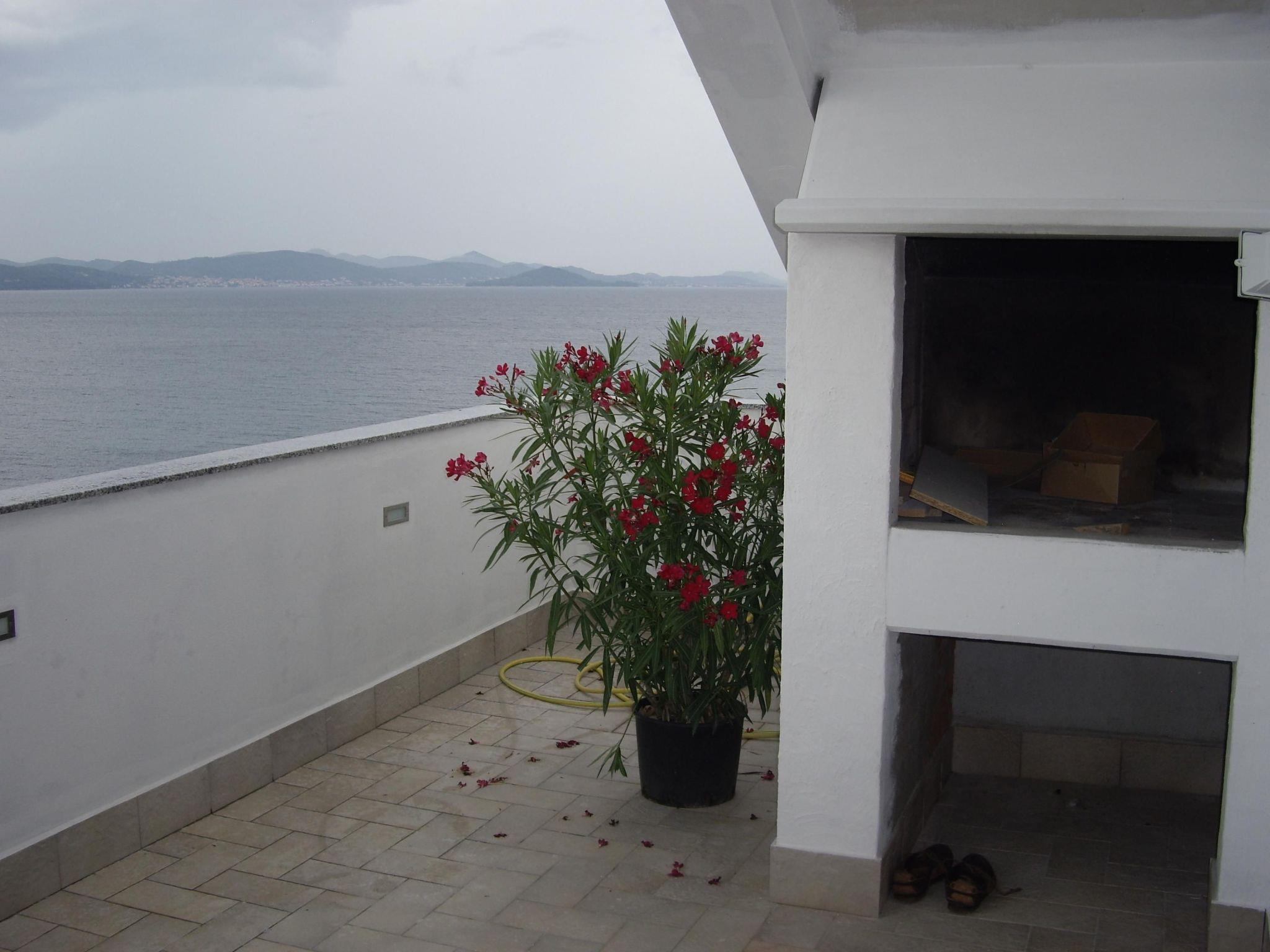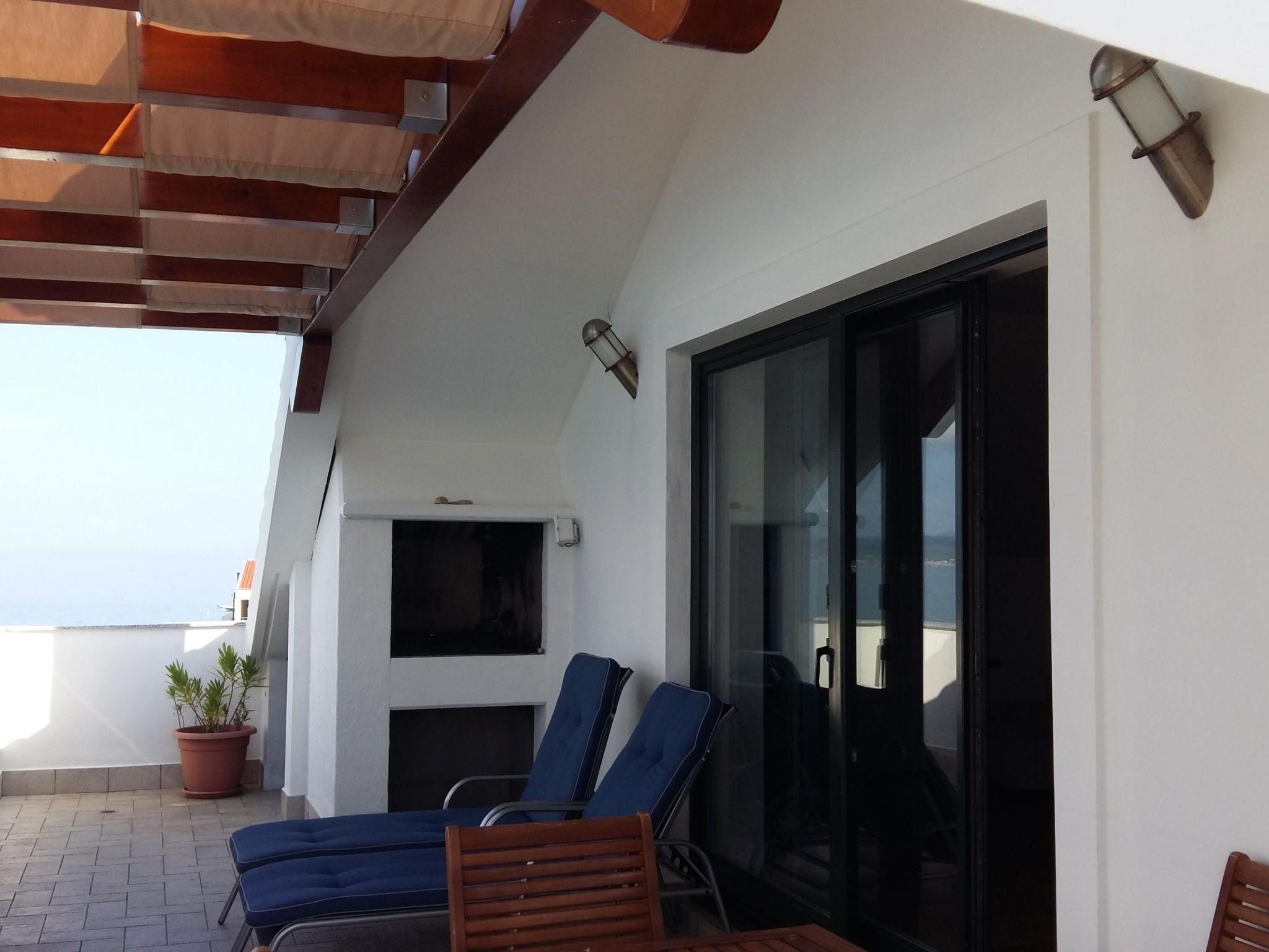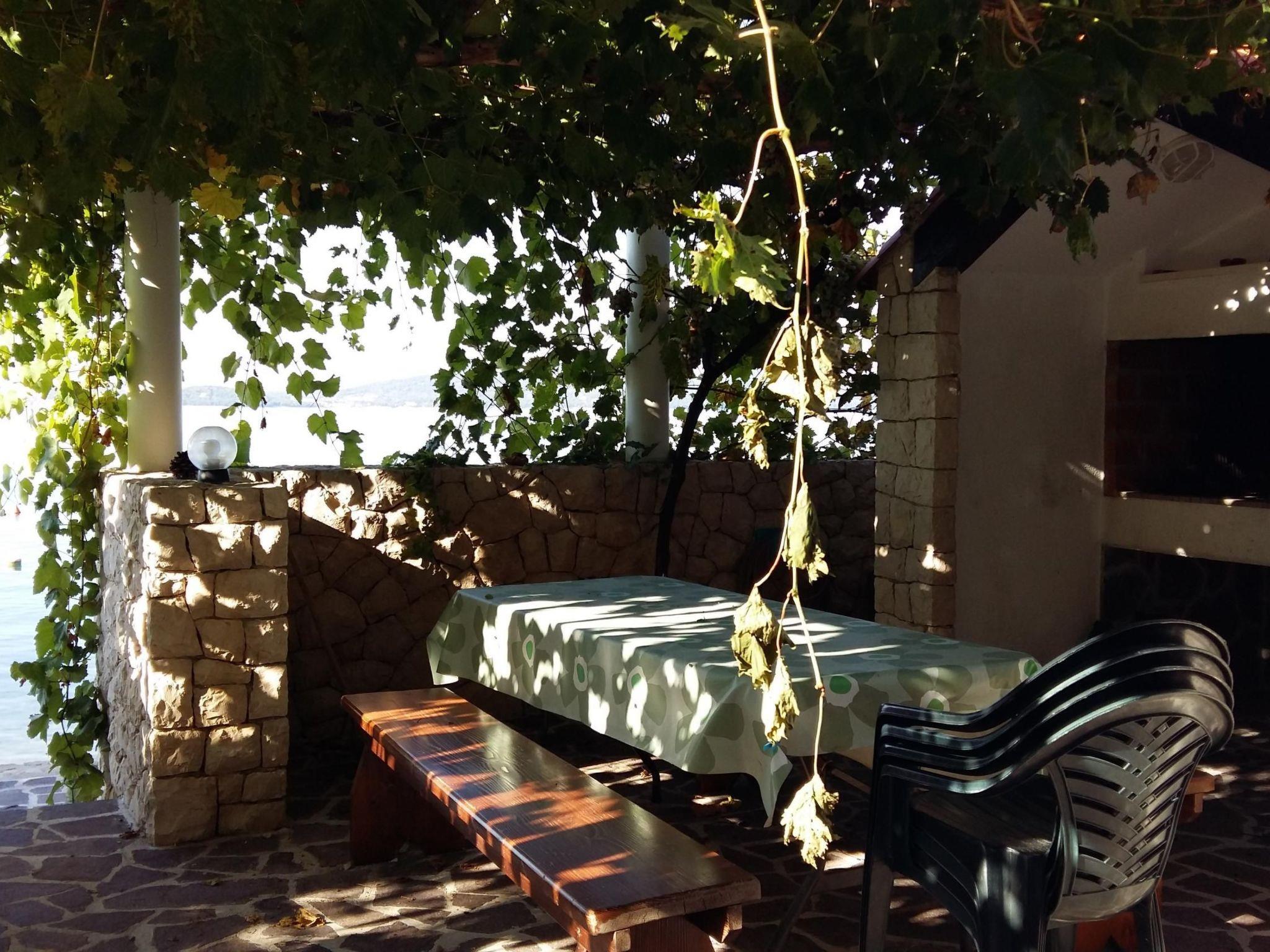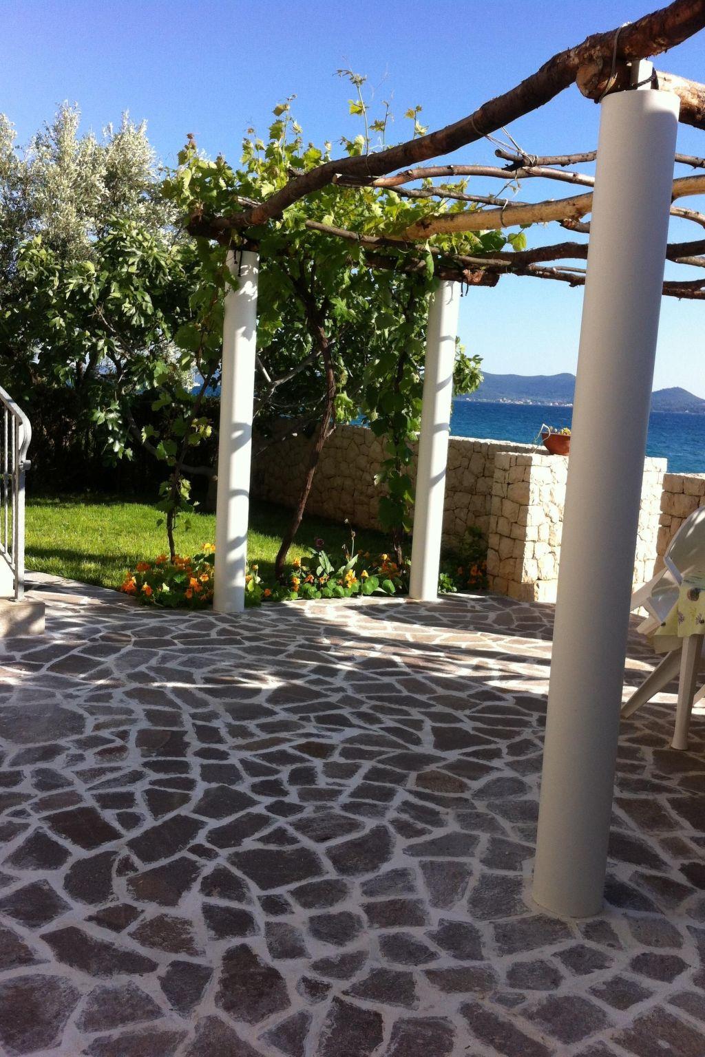 The living room provides access to the 30m² terrace with a typical Croatian fireplace grill and garden furniture. Enjoy the breathtaking view from here of the sea and the islands.