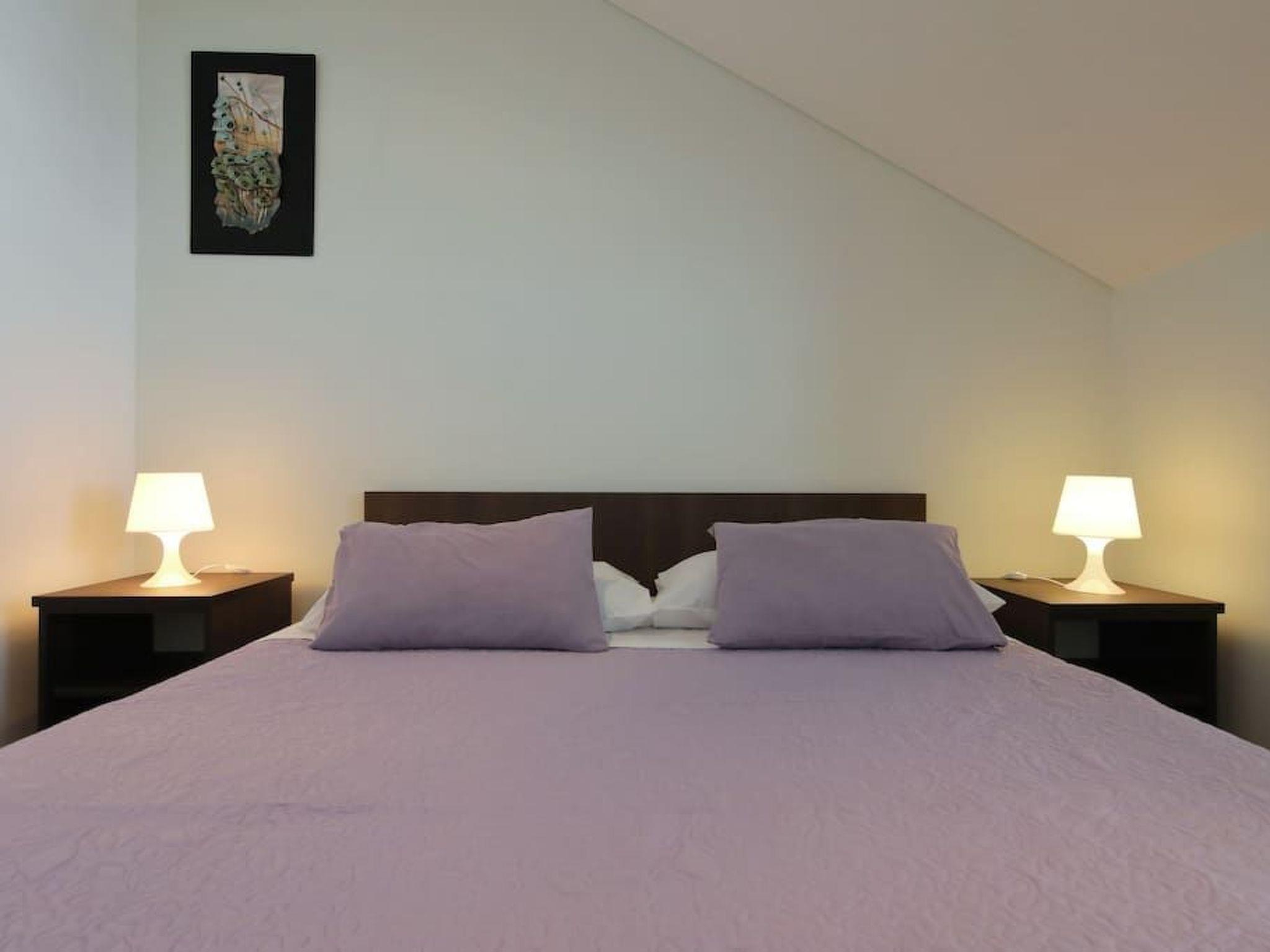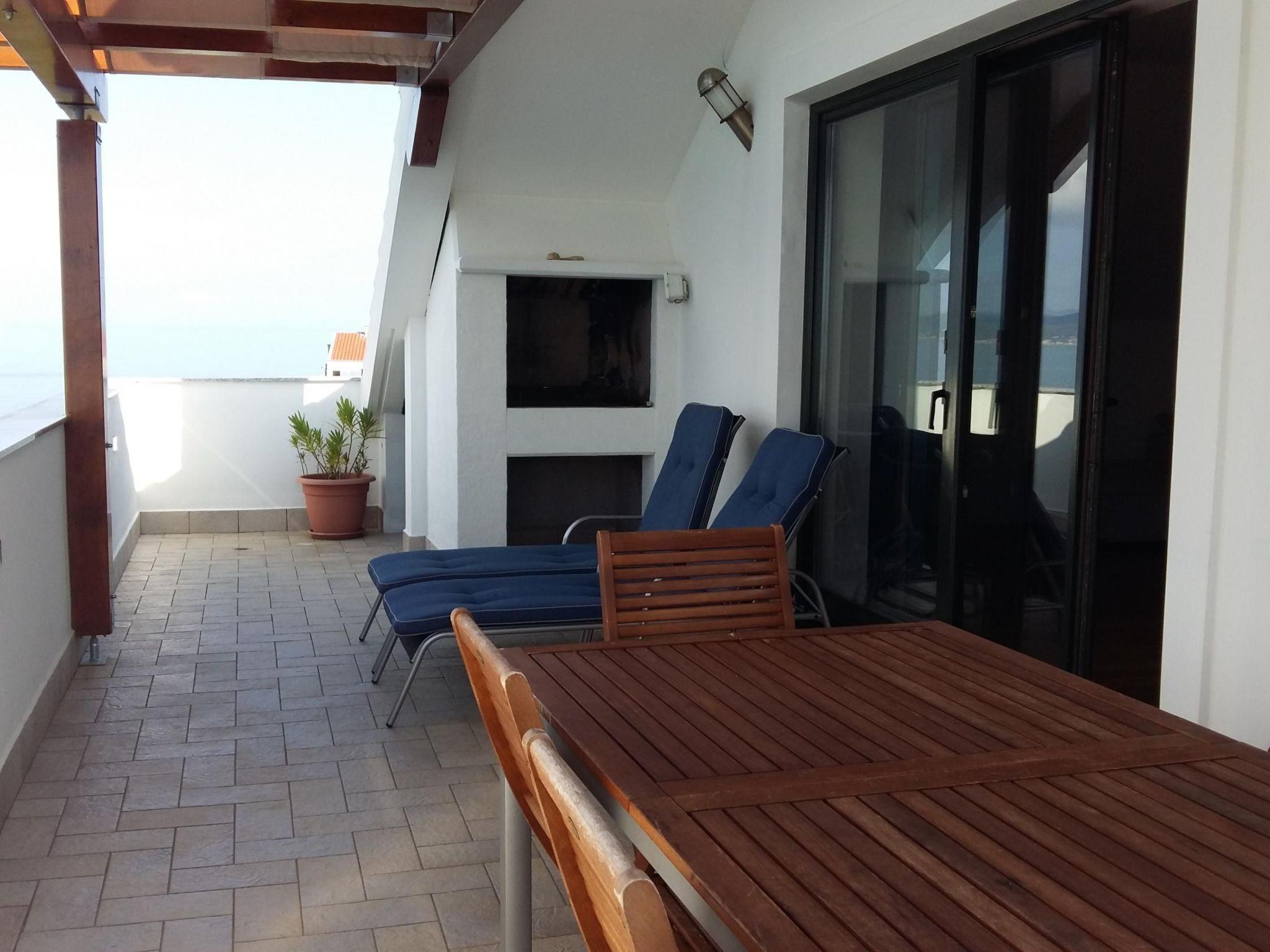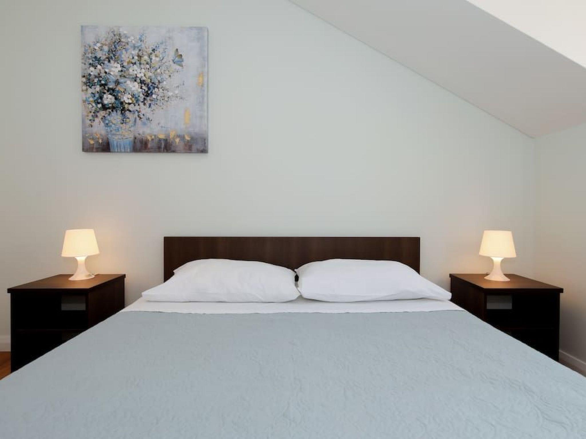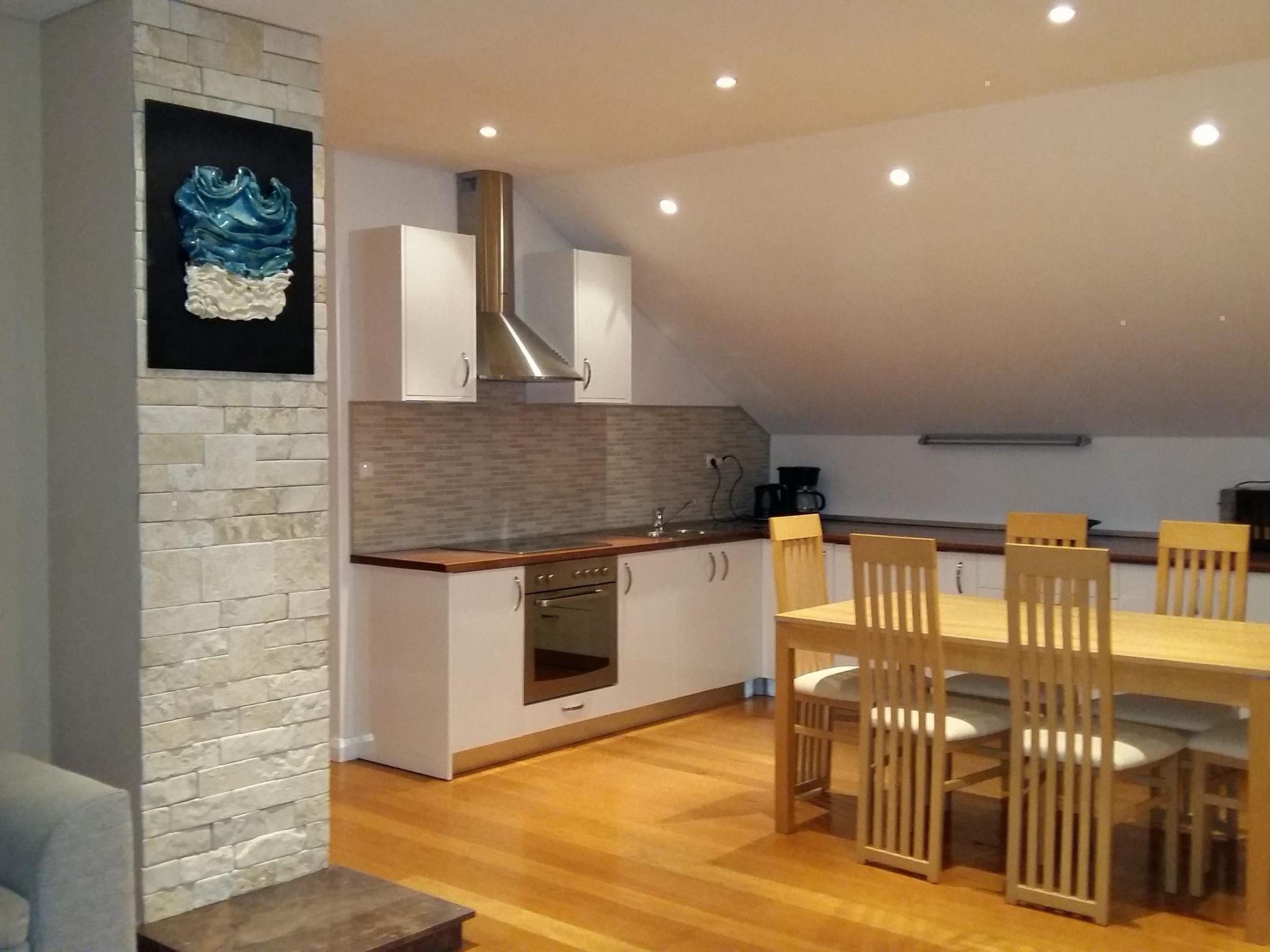 The 87m² penthouse is on the third and therefore top floor and can accommodate up to five people. It has two bedrooms, each with a double bed (160cm wide). One of the two bedrooms has a balcony with a view over the sea. The living room has an open layout and comprises a fully-equipped kitchen with a hob, oven, microwave and dishwasher. The living and dining room has a dining table with chairs, a comfortable sofa bed for two people and a flatscreen TV with satellite channels. Heating, air conditioning and wireless Internet access are available. The bathroom has a shower and there is also another separate toilet. An additional bed for a baby or a child can be provided free of charge.