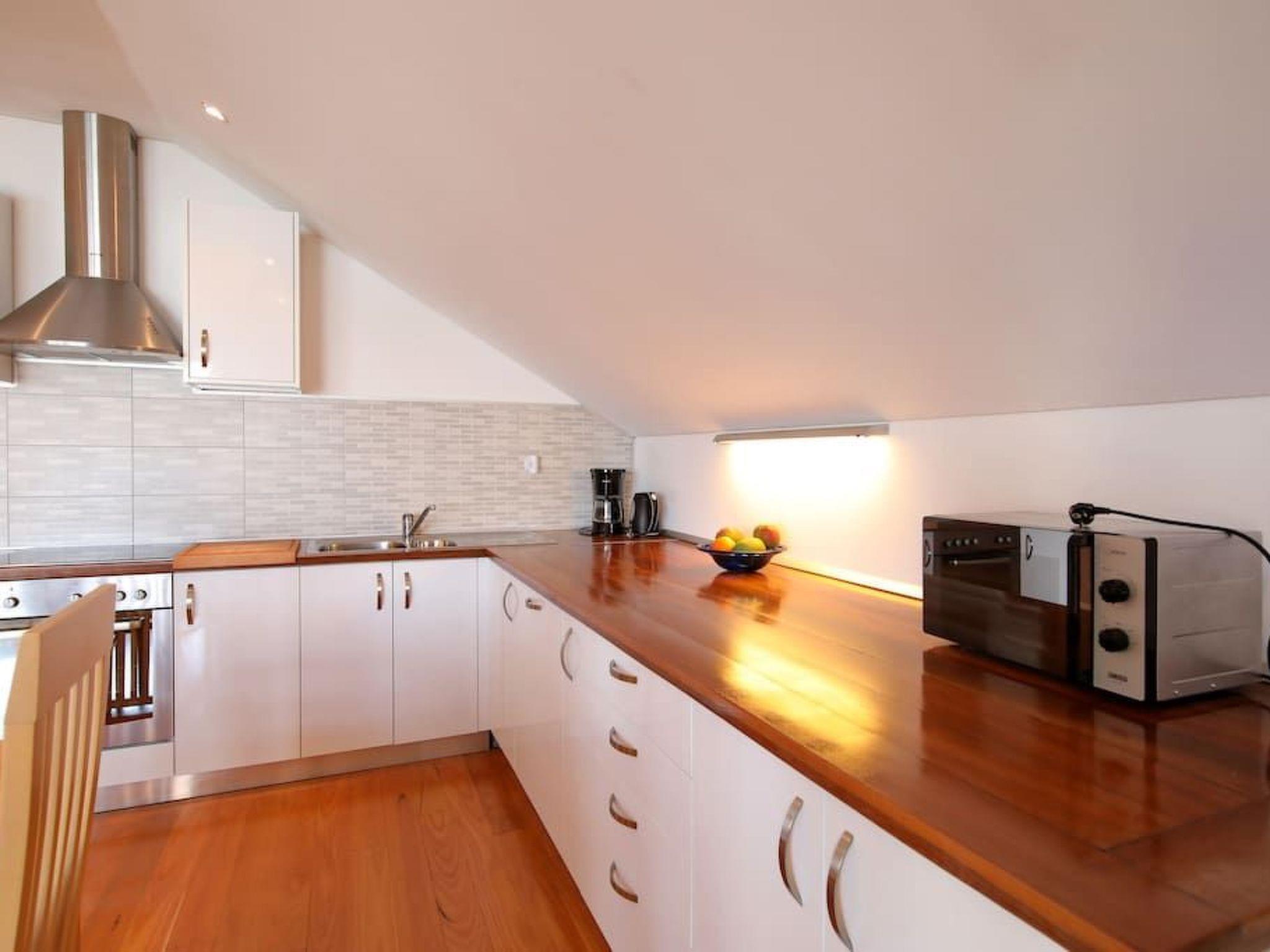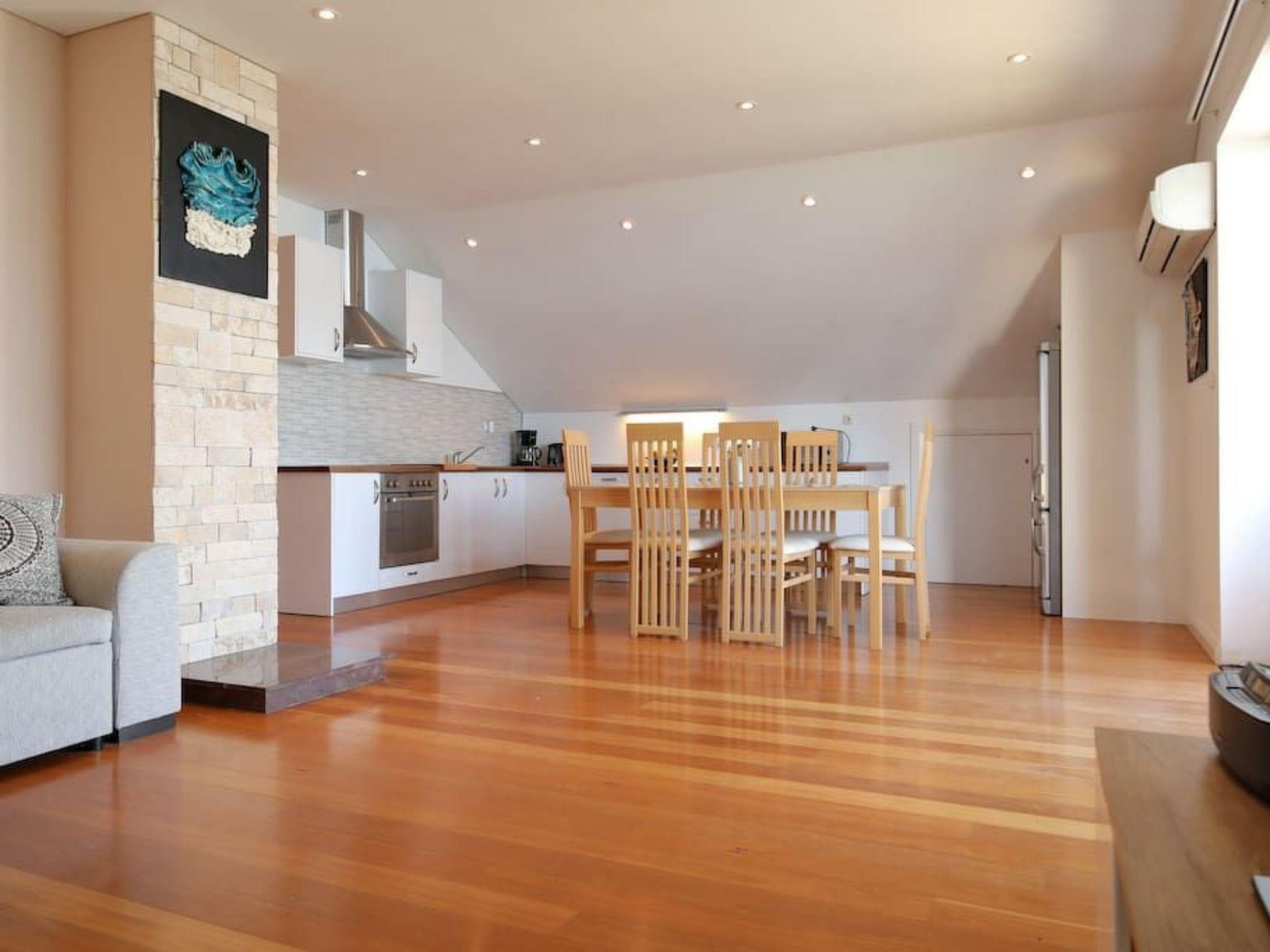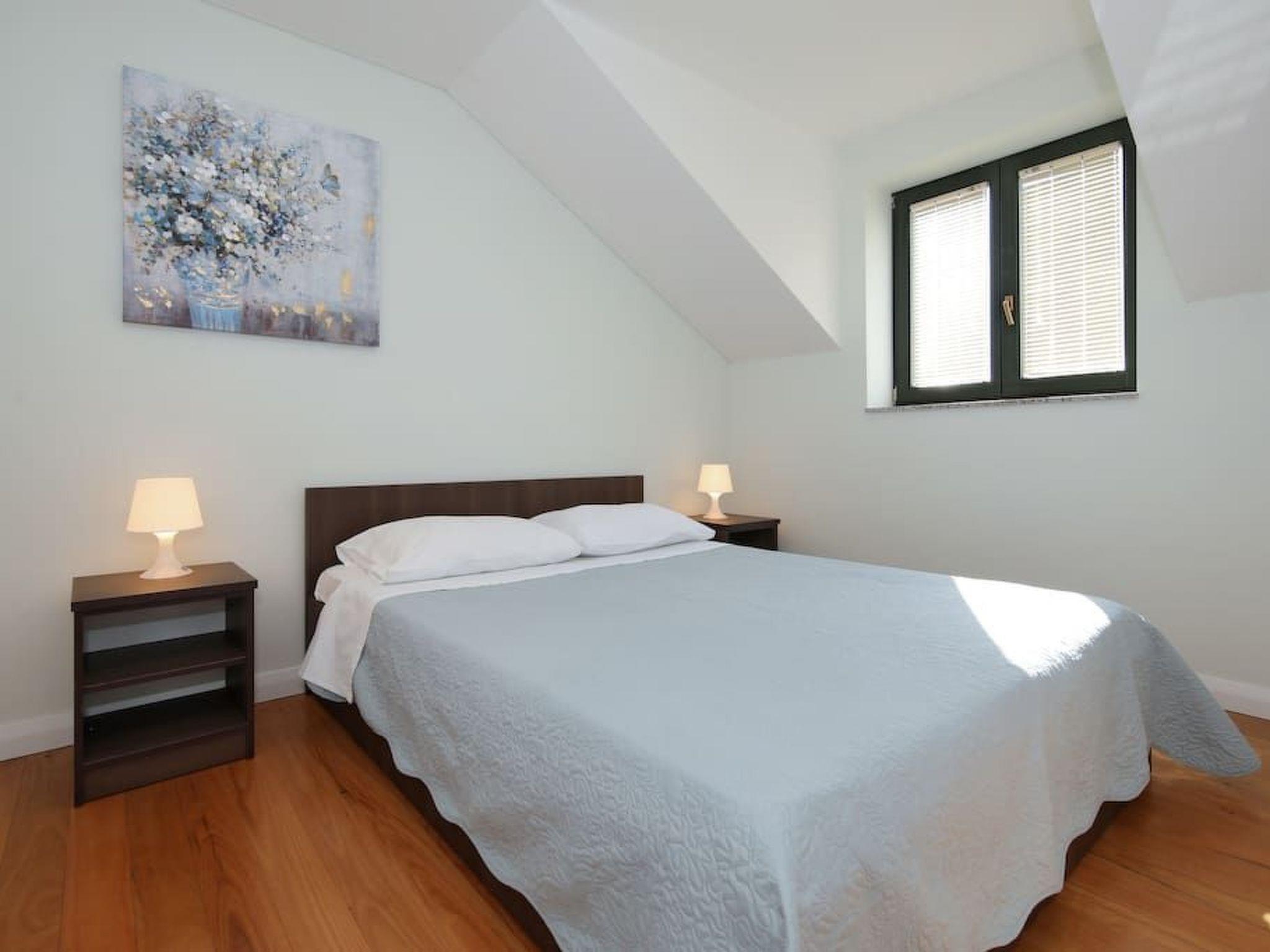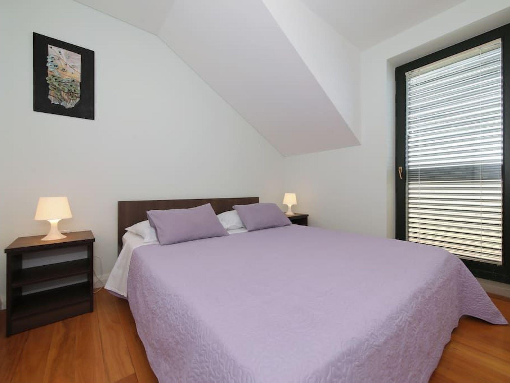 The 87m² penthouse is on the third and therefore top floor and can accommodate up to five people. It has two bedrooms, each with a double bed (160cm wide). One of the two bedrooms has a balcony with a view over the sea. The living room has an open layout and comprises a fully-equipped kitchen with a hob, oven, microwave and dishwasher. The living and dining room has a dining table with chairs, a comfortable sofa bed for two people and a flatscreen TV with satellite channels. Heating, air conditioning and wireless Internet access are available. The bathroom has a shower and there is also another separate toilet. An additional bed for a baby or a child can be provided free of charge.