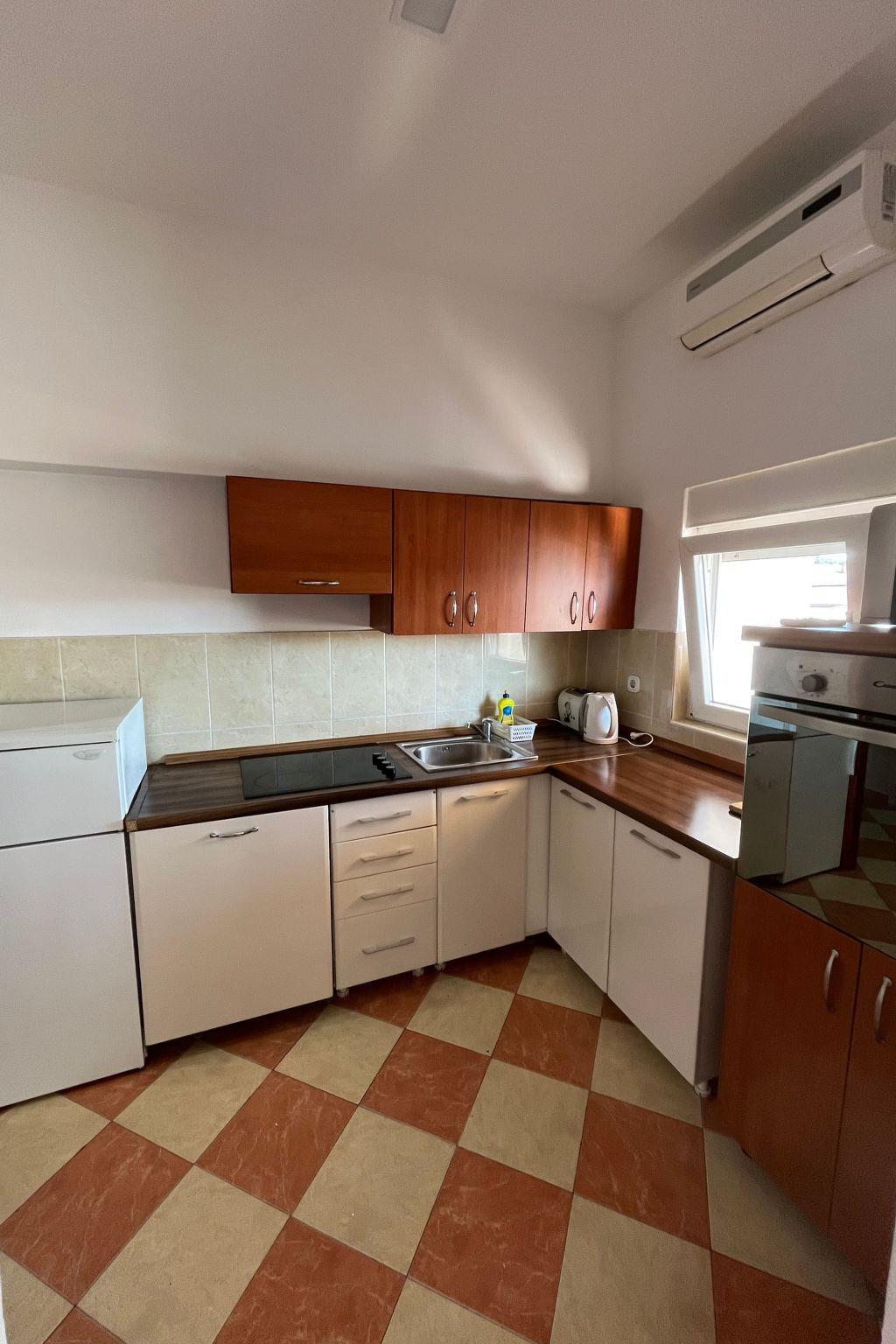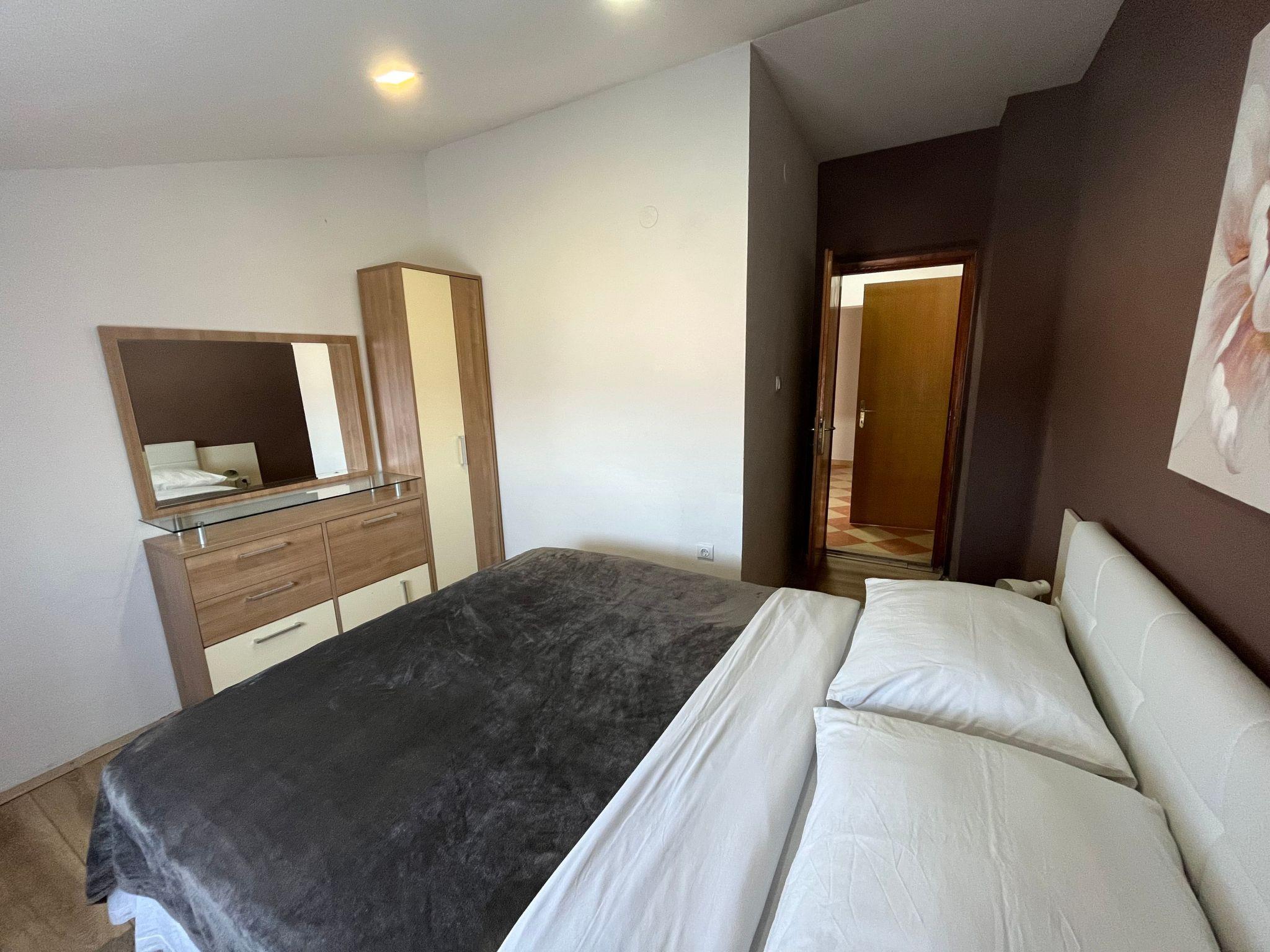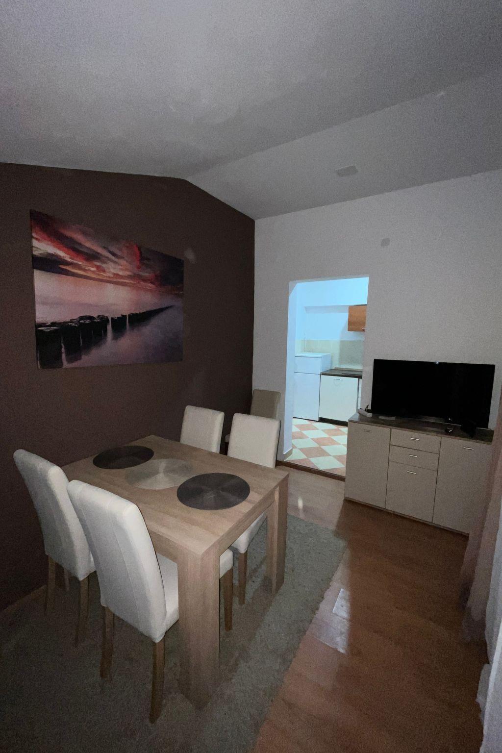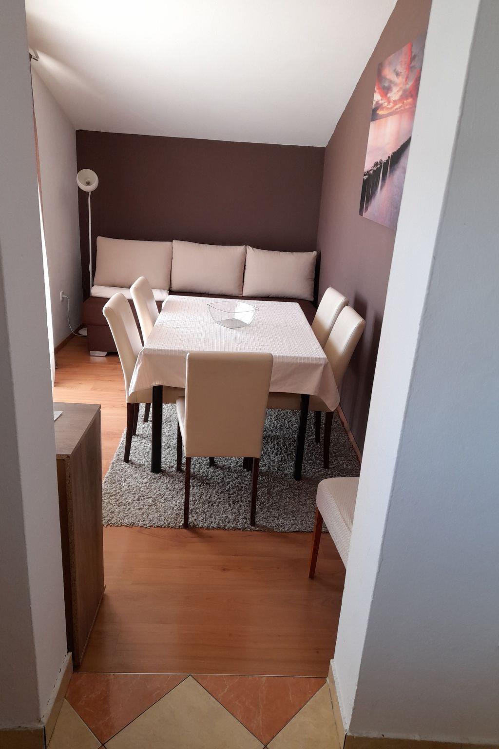 Three bedroom apartment for eight persons This apartment has 2 bathrooms, 3 bedrooms, kitchen, big terrace with a sea view and a living room where can stay one or two extra people on the sofa bed. In one bedroom there are 2 single beds, in second are 1 double bed and in third is double bed. In the big kitchen are: big fridge,electric stove, dishwasher, mixer, microwave, toster, aparat coffee and in one bathroom is washmachine. Apartment is great for a family or groups. In apartment is everything what is neccessary, has parking, garden and visitor tax is included.The following description is a first draft, which is still awaiting revision. Please contact our Customer Service if it contains any gaps.