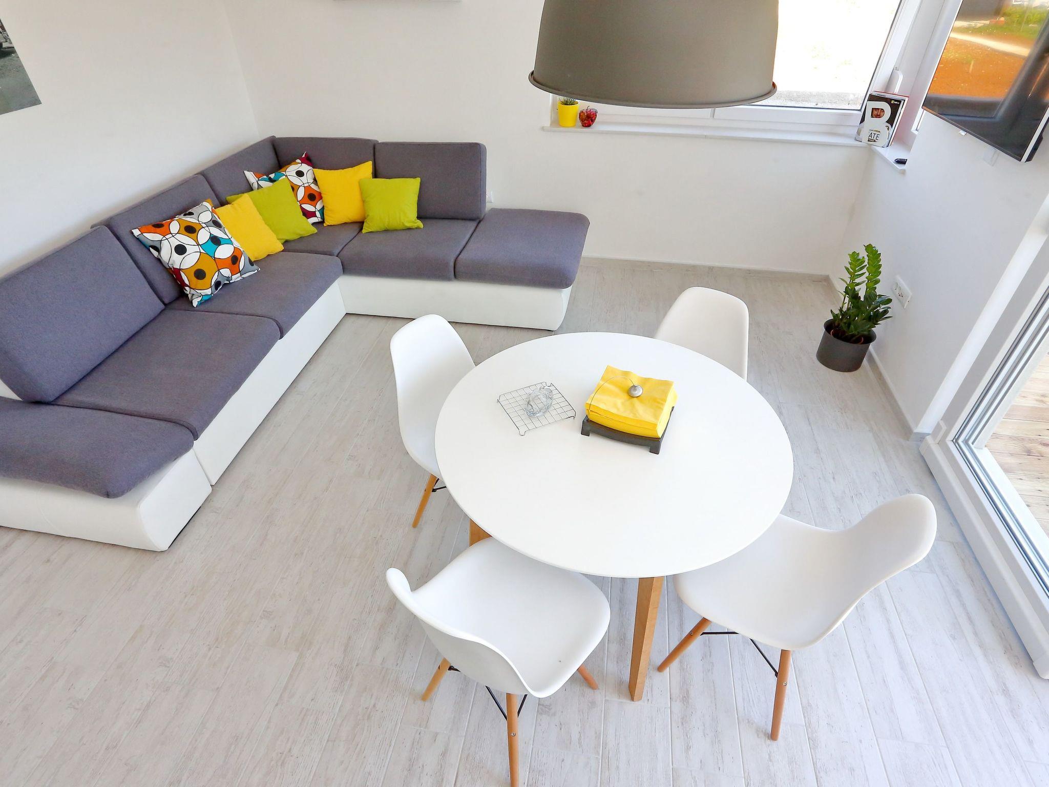 The centrepiece of this 40m² apartment for four people is the air-conditioned living room with an integrated kitchen. The large, comfortable corner sofa, which also serves as a sofa bed for two people, faces the flatscreen TV and the glass sliding door leading out onto the terrace. In the middle of the room there is the modern dining space consisting of a round table and four chairs. The white kitchen unit behind it is equipped with a ceramic hob, oven, sink, fridge, coffee machine and microwave. The comfortable bedroom is furnished with a double bed 160cm wide, bedside tables and lamps and a large wardrobe. The very modern bathroom is tiled in light grey and provides ideal conditions for a good start to the day, with a walk-in glass shower cubicle, a toilet and an elegant washbasin with a cupboard underneath and a mirror.
