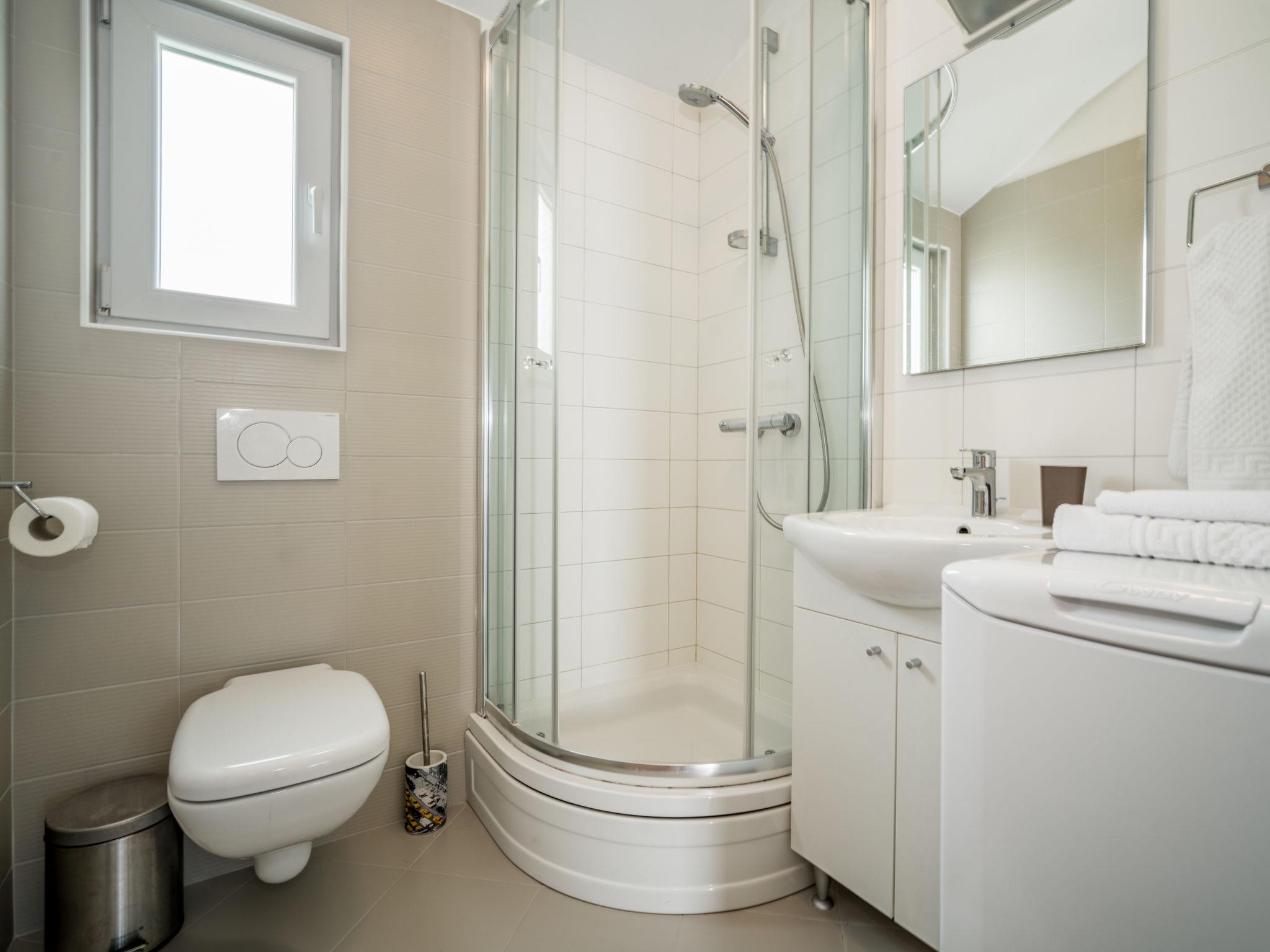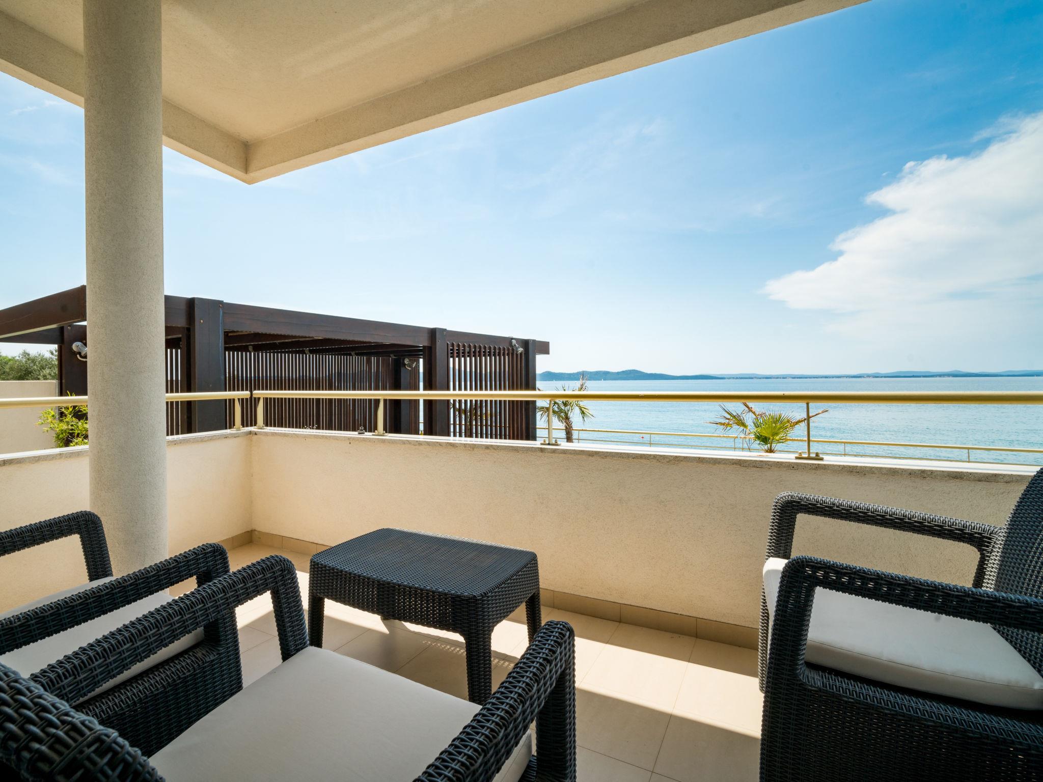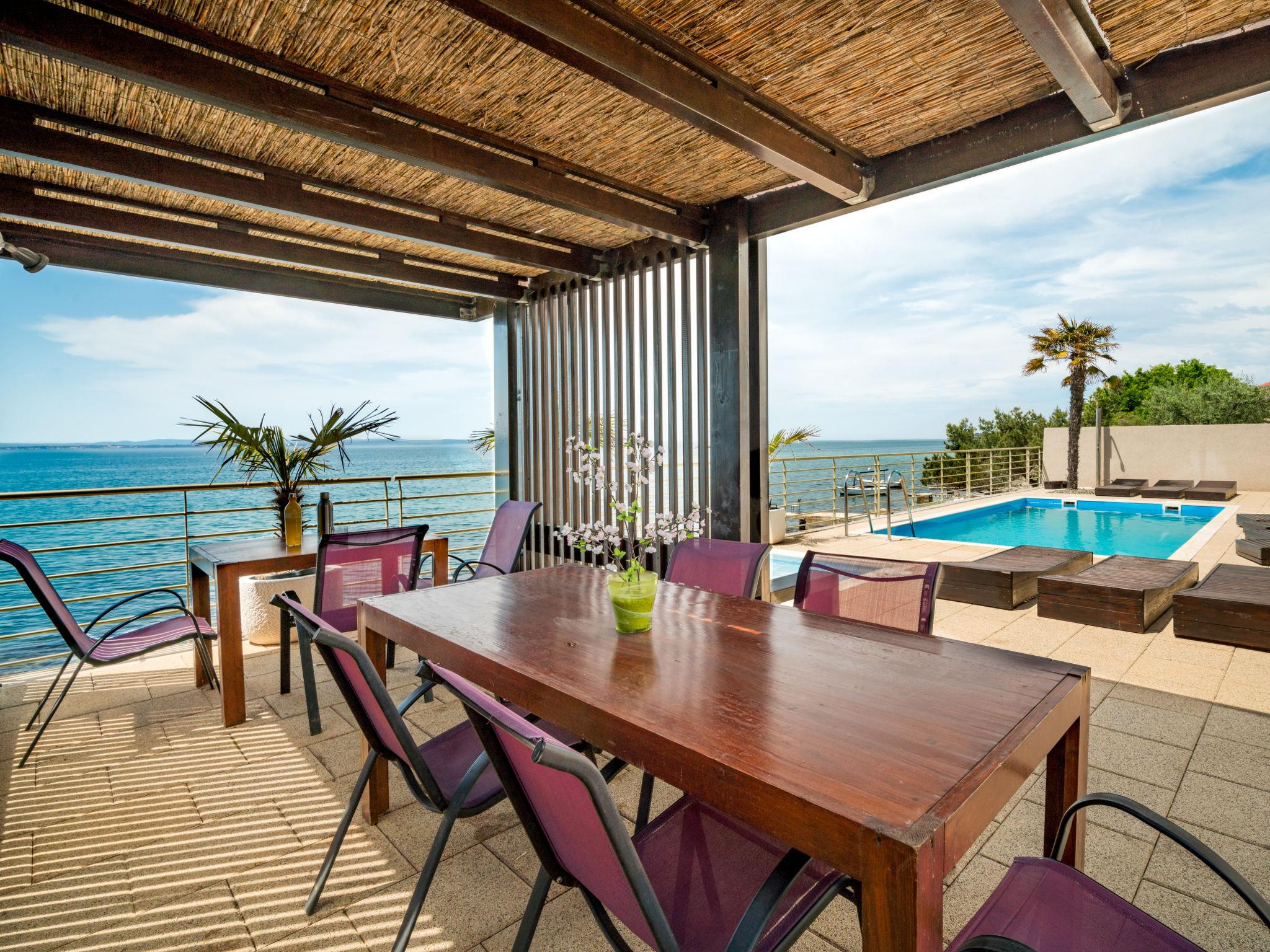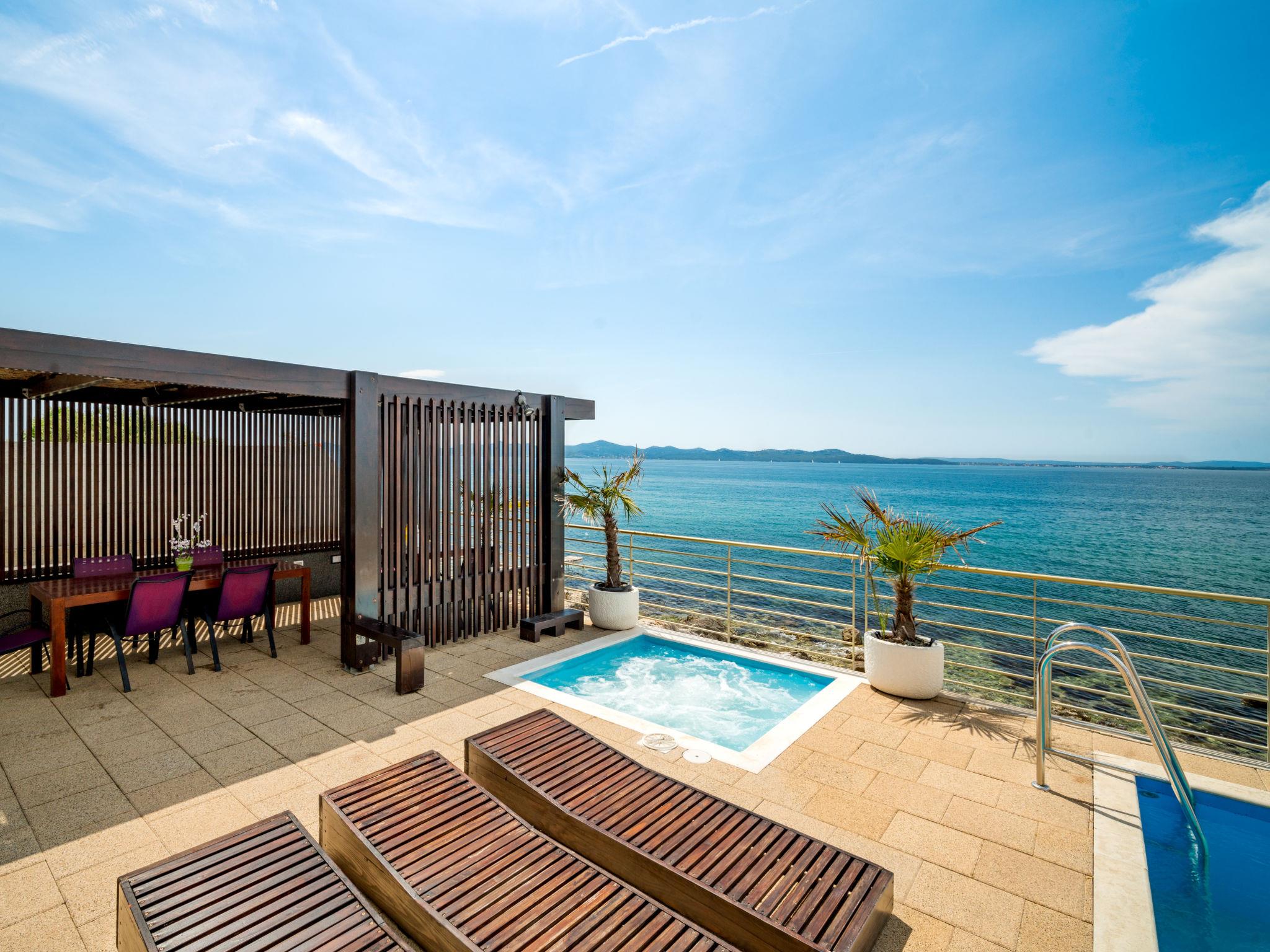 Kožino 8 km from Zadar: Single-family house "Villa Kožino", 3 storeys. In a quiet, sunny position, at the seaside, on the beach. Private: property 355 m2 (fenced), swimming pool angular, heated (8 x 3 m, 28 m2, depth 150 cm, seasonal availability: 30.Mar. - 26.Oct.). Outdoor shower, hot tub, pergola (15 m2), garden furniture, barbecue. In the house: internet access, washing machine. Parking (for 5 cars) at the house on the premises. Shop 200 m, restaurant 1.5 km, rocky beach, concrete beach 10 m. Tennis 8 km. Nearby attractions: Aquapark 8 km. The house consists of 6 apartments rented as one unit.