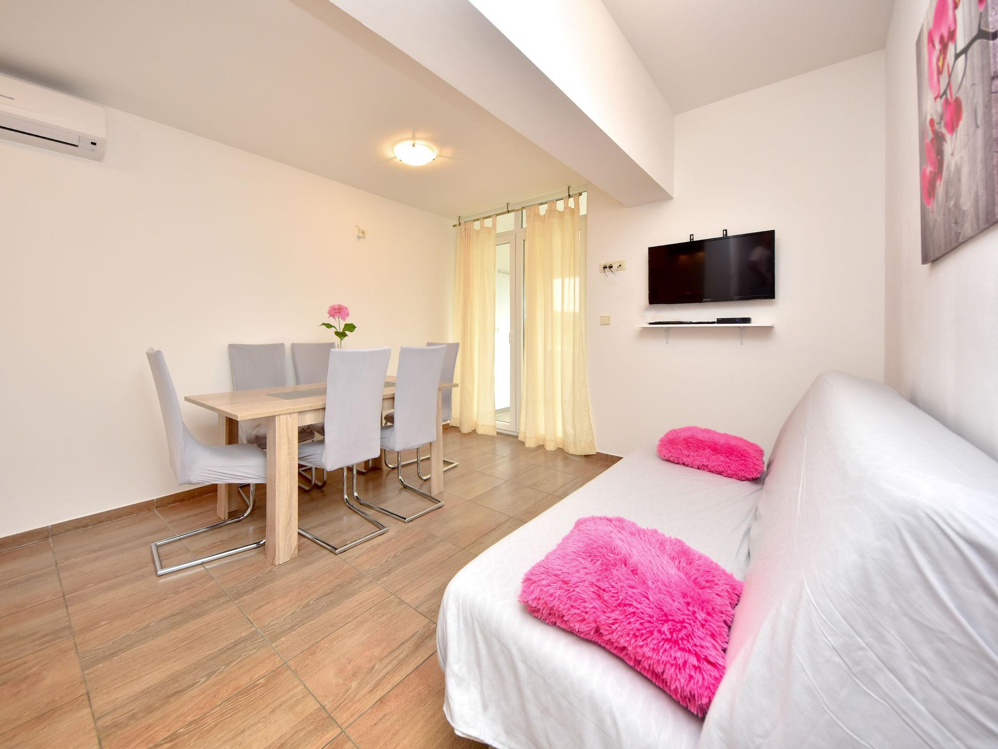 3-room apartment 50 m2 on 1st floor, south-west facing position. Living/dining room 16 m2 with 1 sofabed (120 cm, length 200 cm), satellite TV (flat screen), air conditioning. Exit to the terrace. 2 rooms, each room with 1 french bed (150 cm, length 200 cm). Exit to the terrace. Open kitchen (2 hot plates). Shower/WC. Air-conditioning (extra). No heating option. Terrace 16 m2, roofed, terrace 11 m2. Terrace furniture. Partial distant view of the sea. Facilities: Internet (WiFi, free).