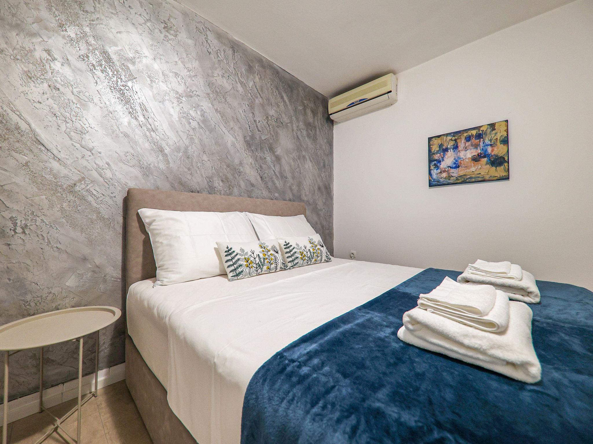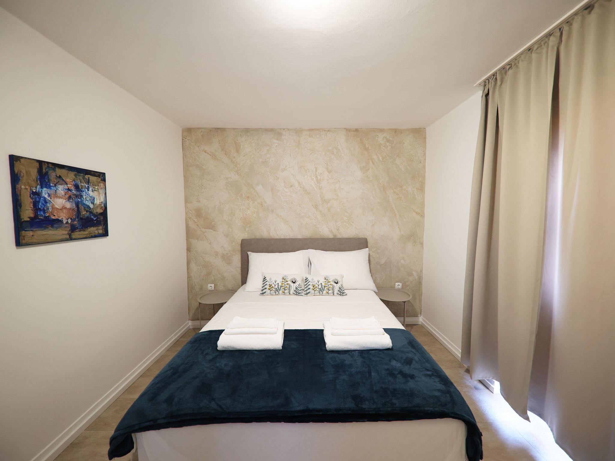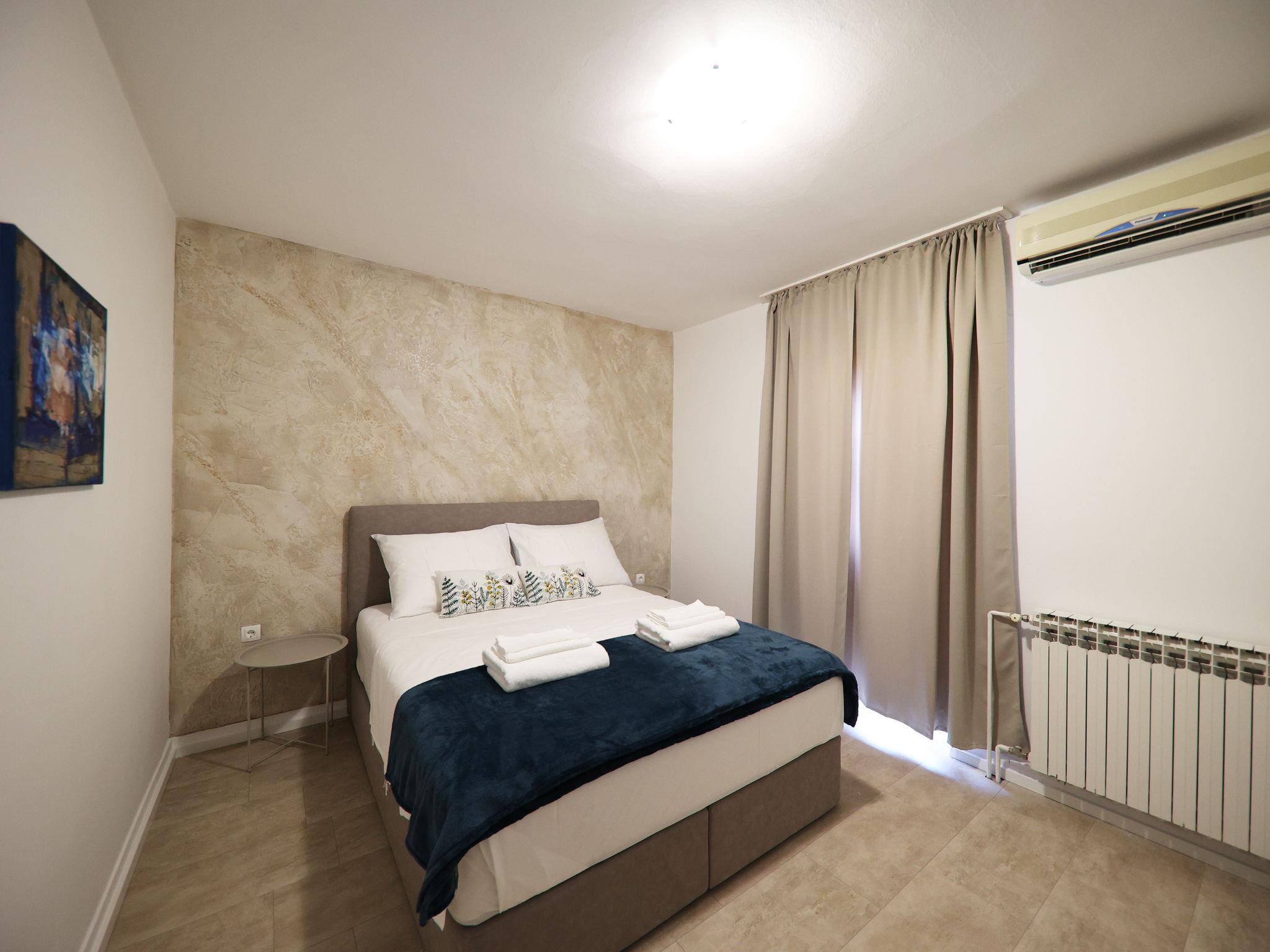2-room apartment 46 m2 on 1st floor. Modern furnishings: living/dining room 20 m2. Exit to the balcony. 2 rooms, each room with 1 double bed (2 x 80 cm, length 200 cm), satellite TV and air conditioning. Open kitchen (2 induction hot plates, freezer) with dining table, satellite TV and air conditioning. Shower/WC. No heating option. Facilities: Internet (WiFi, free).