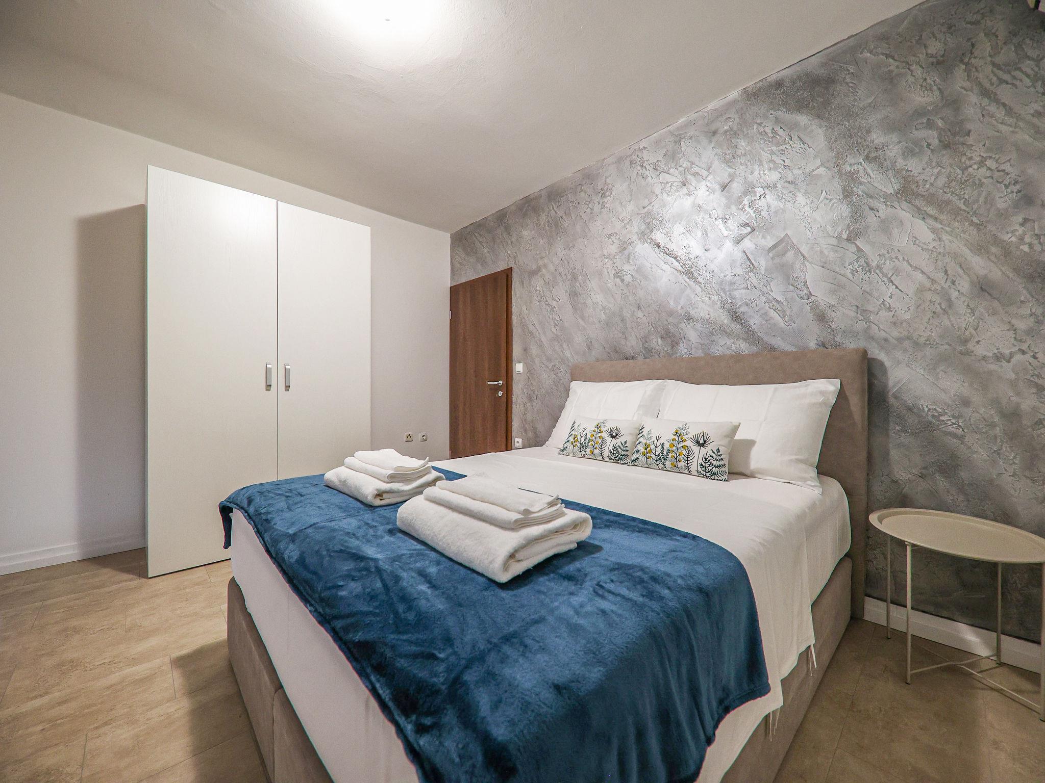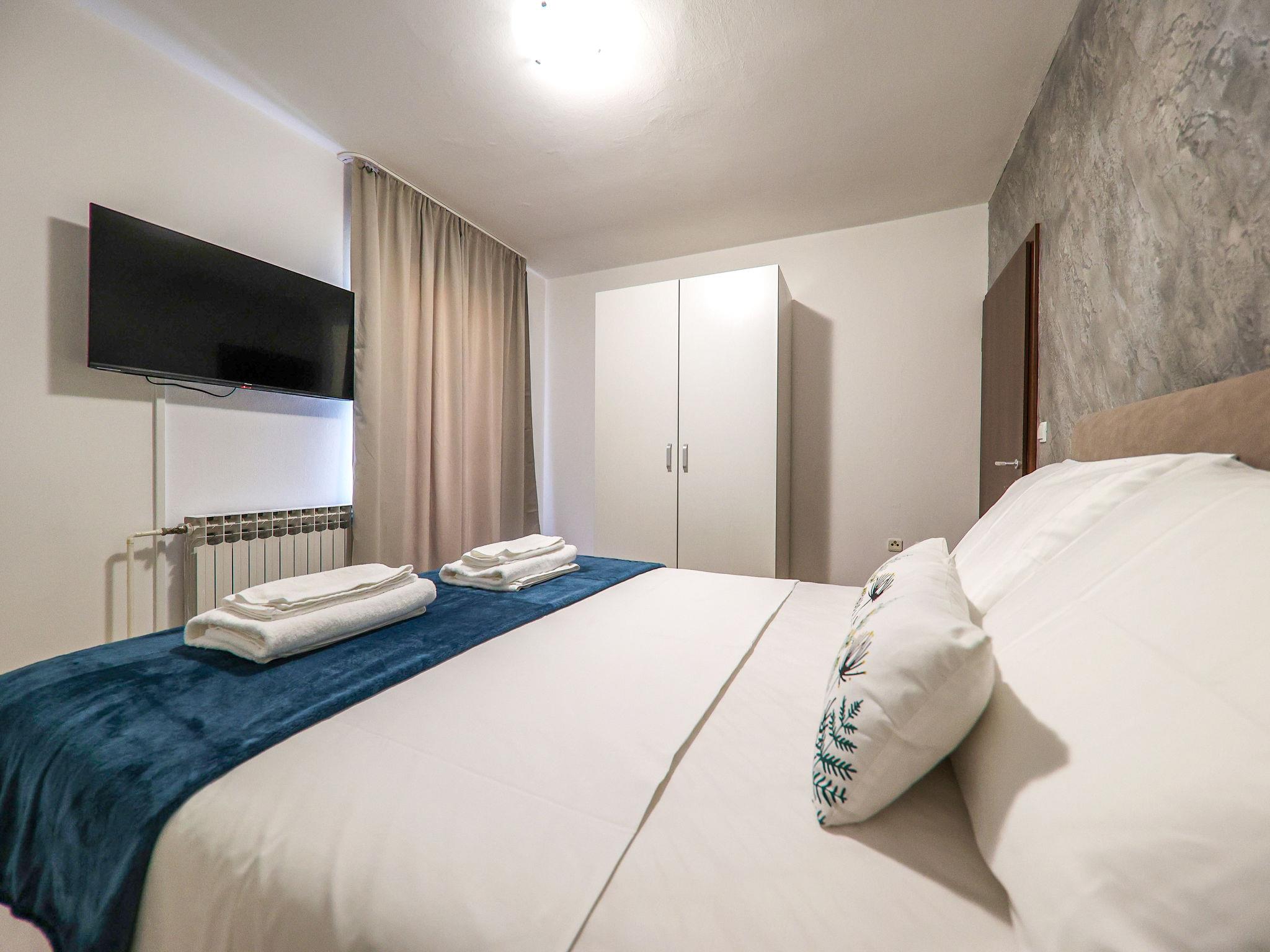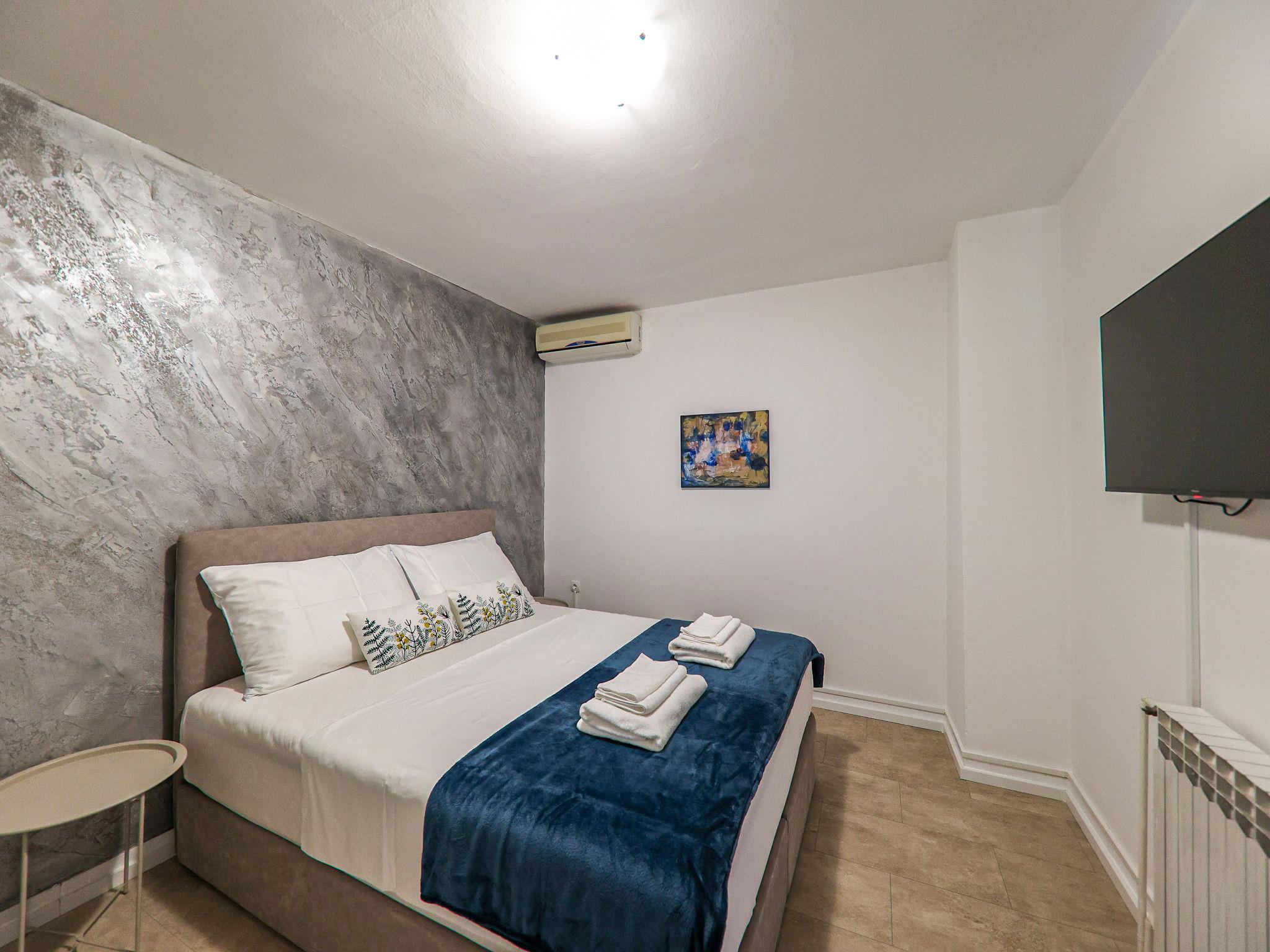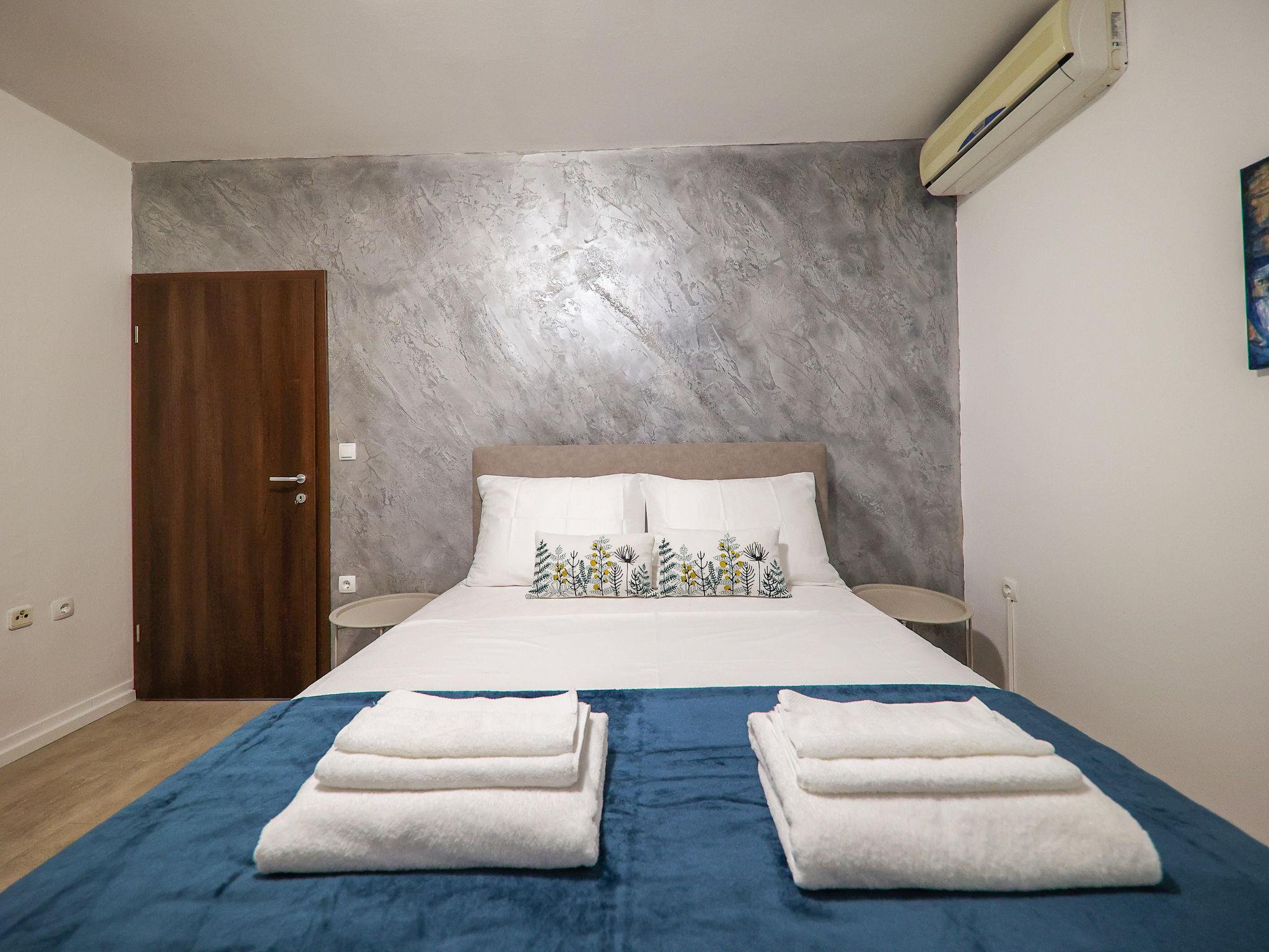 2-room apartment 46 m2 on 1st floor. Modern furnishings: living/dining room 20 m2. Exit to the balcony. 2 rooms, each room with 1 double bed (2 x 80 cm, length 200 cm), satellite TV and air conditioning. Open kitchen (2 induction hot plates, freezer) with dining table, satellite TV and air conditioning. Shower/WC. No heating option. Facilities: Internet (WiFi, free).