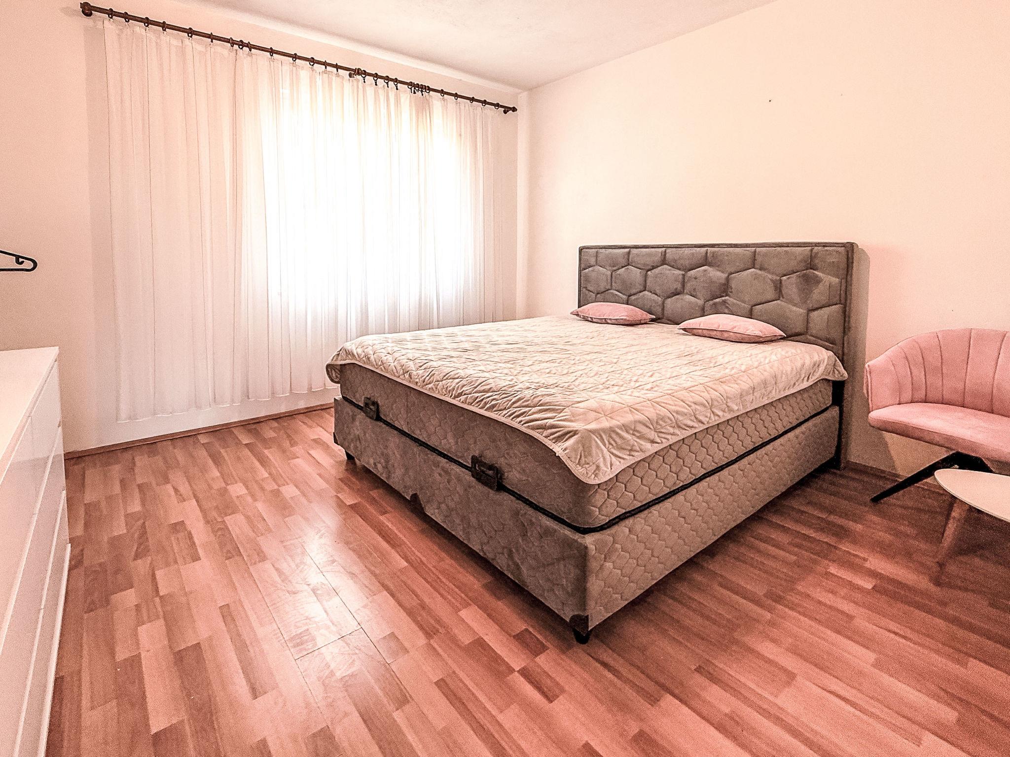 3-room apartment 50 m2 on 1st floor, south-east facing position. Living/dining room 25 m2 with satellite TV and air conditioning. 1 room with 1 french bed (160 cm, length 200 cm). 1 room with 1 french bed (160 cm, length 200 cm). Exit to the terrace. Open kitchen (4 hot plates, oven, freezer, electric coffee machine). Shower/WC. Terrace 8 m2, roofed. Terrace furniture. Facilities: Internet (WiFi, free).