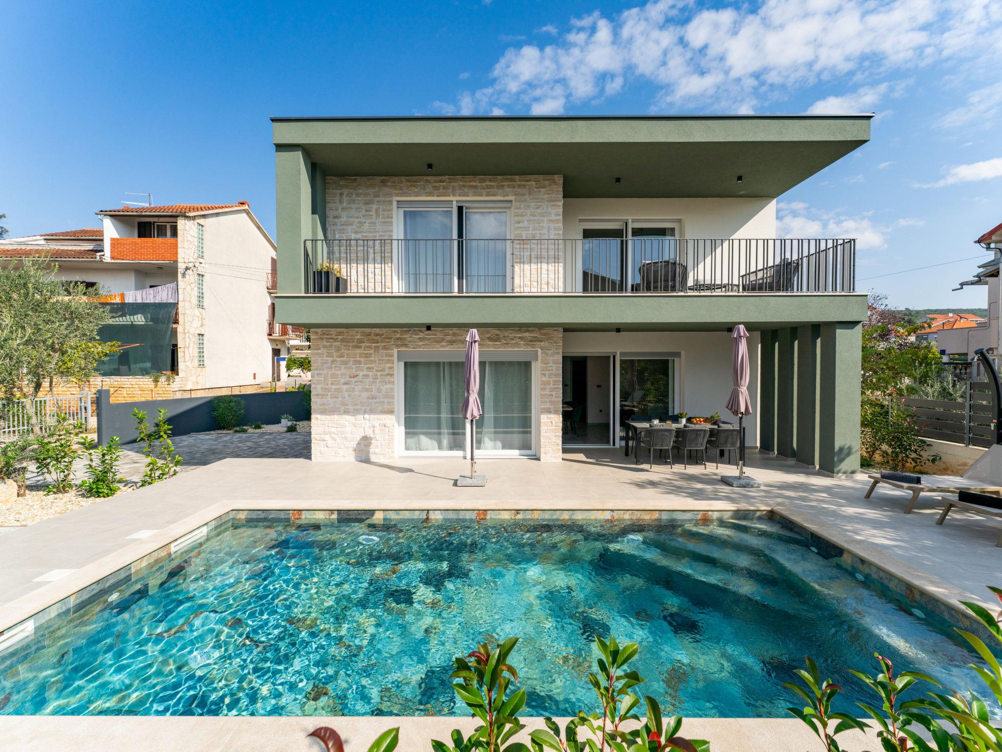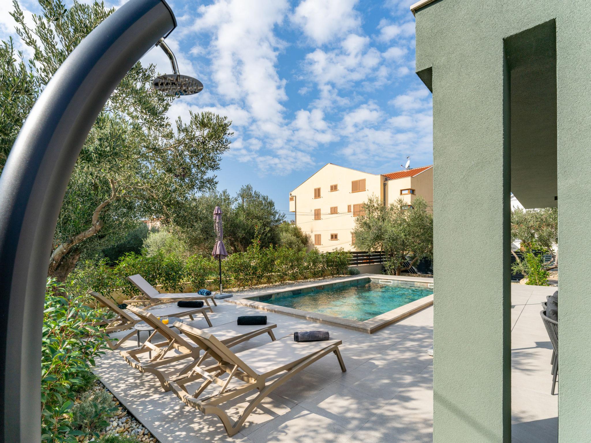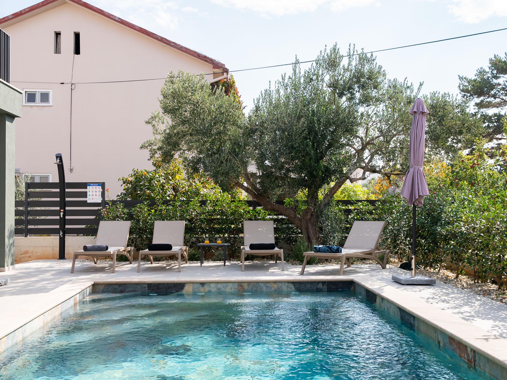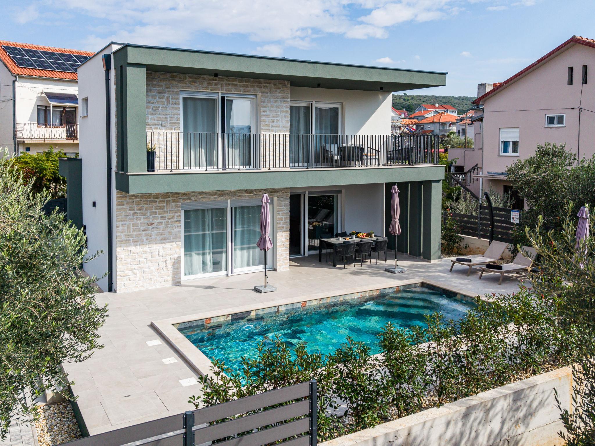 Modern single-family house "Amala", 2 storeys. 2.5 km from the centre of Sukošan, in a quiet, sunny position, 100 m from the sea, 100 m from the beach. Private: property 600 m2 (fenced), swimming pool angular, heated (8 x 4 m, depth 145 cm, seasonal availability: 01.May. - 30.Sep.) with internal staircase. Outdoor shower, garden furniture, barbecue. In the house: internet access, washing machine. Parking (for 2 cars) at the house on the premises. Shop 50 m, restaurant 300 m, bus stop 250 m, pebble beach 100 m. Groups of teenagers on request only.