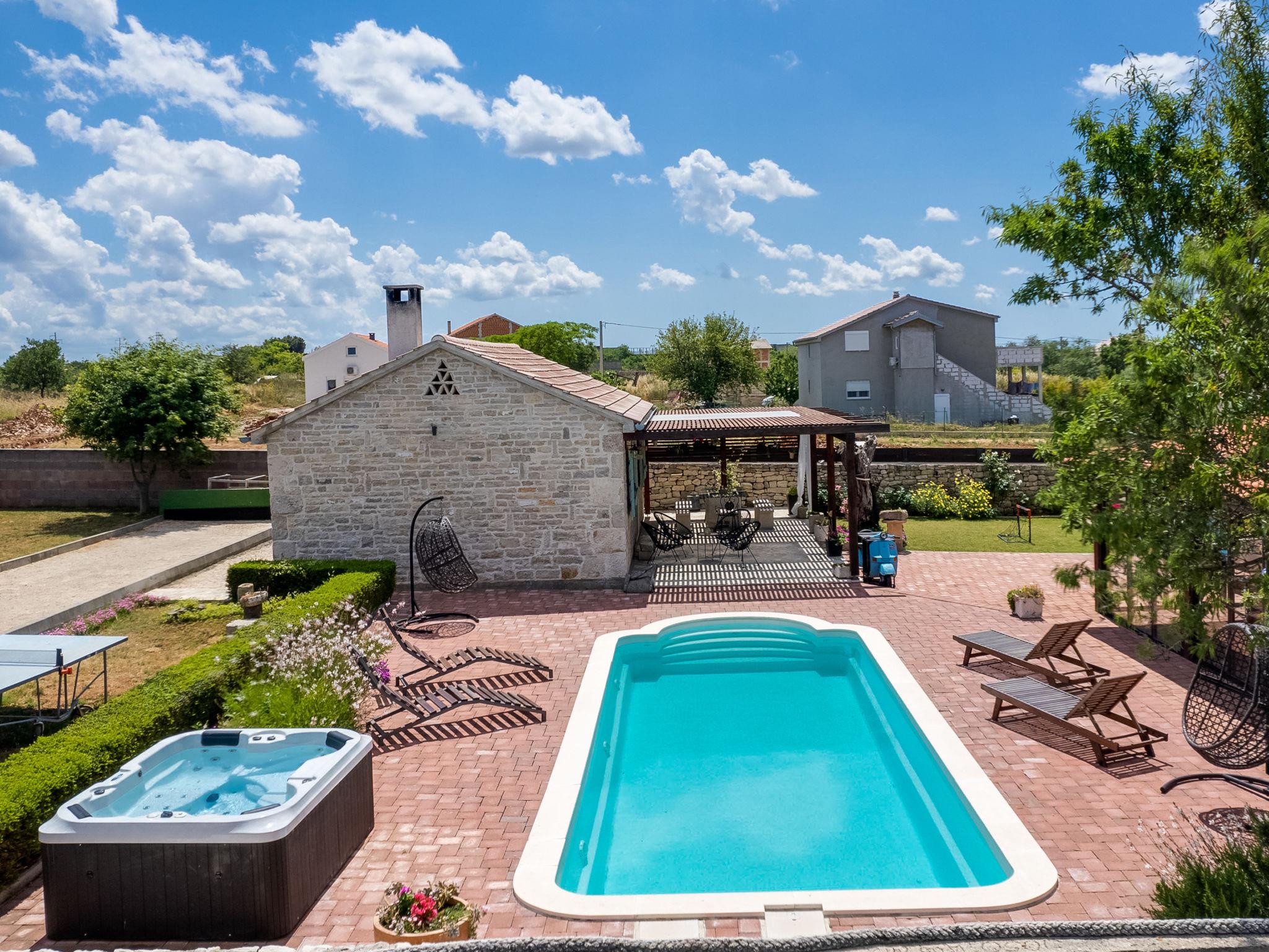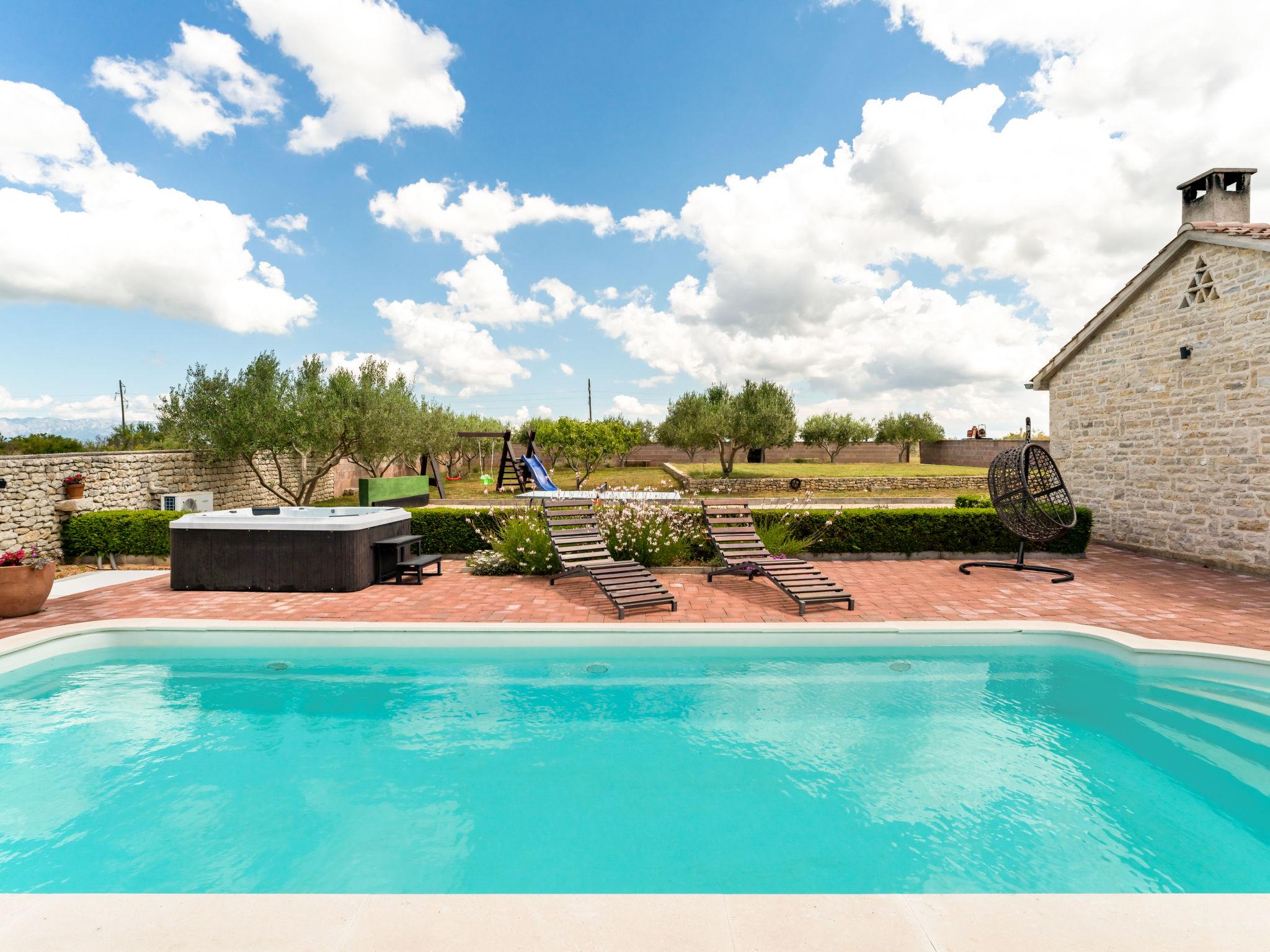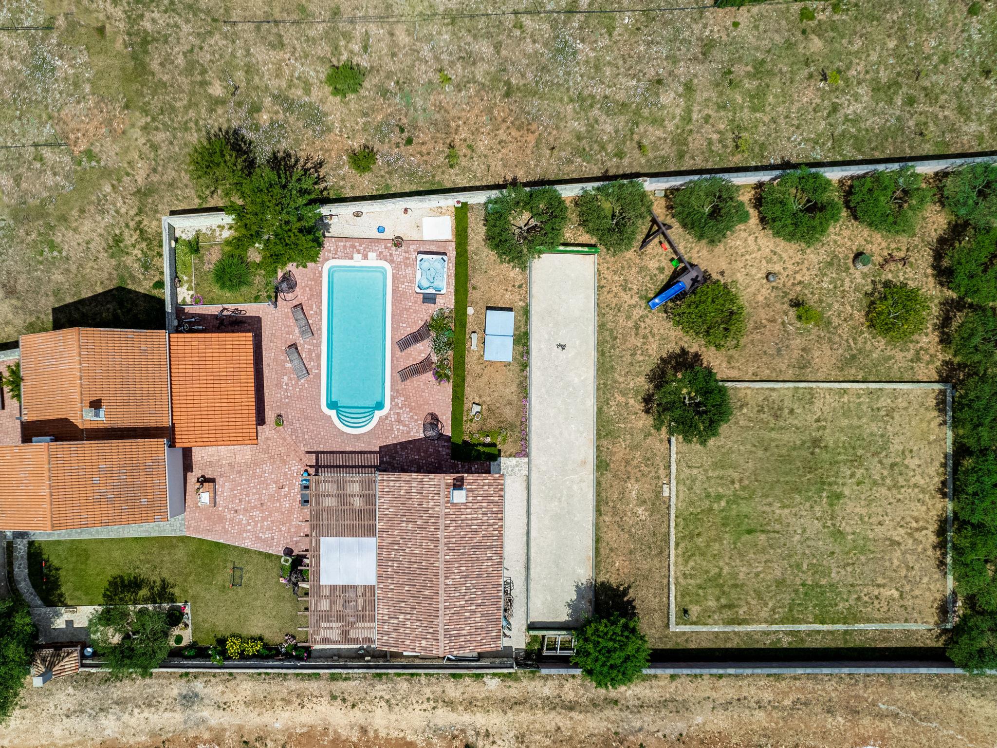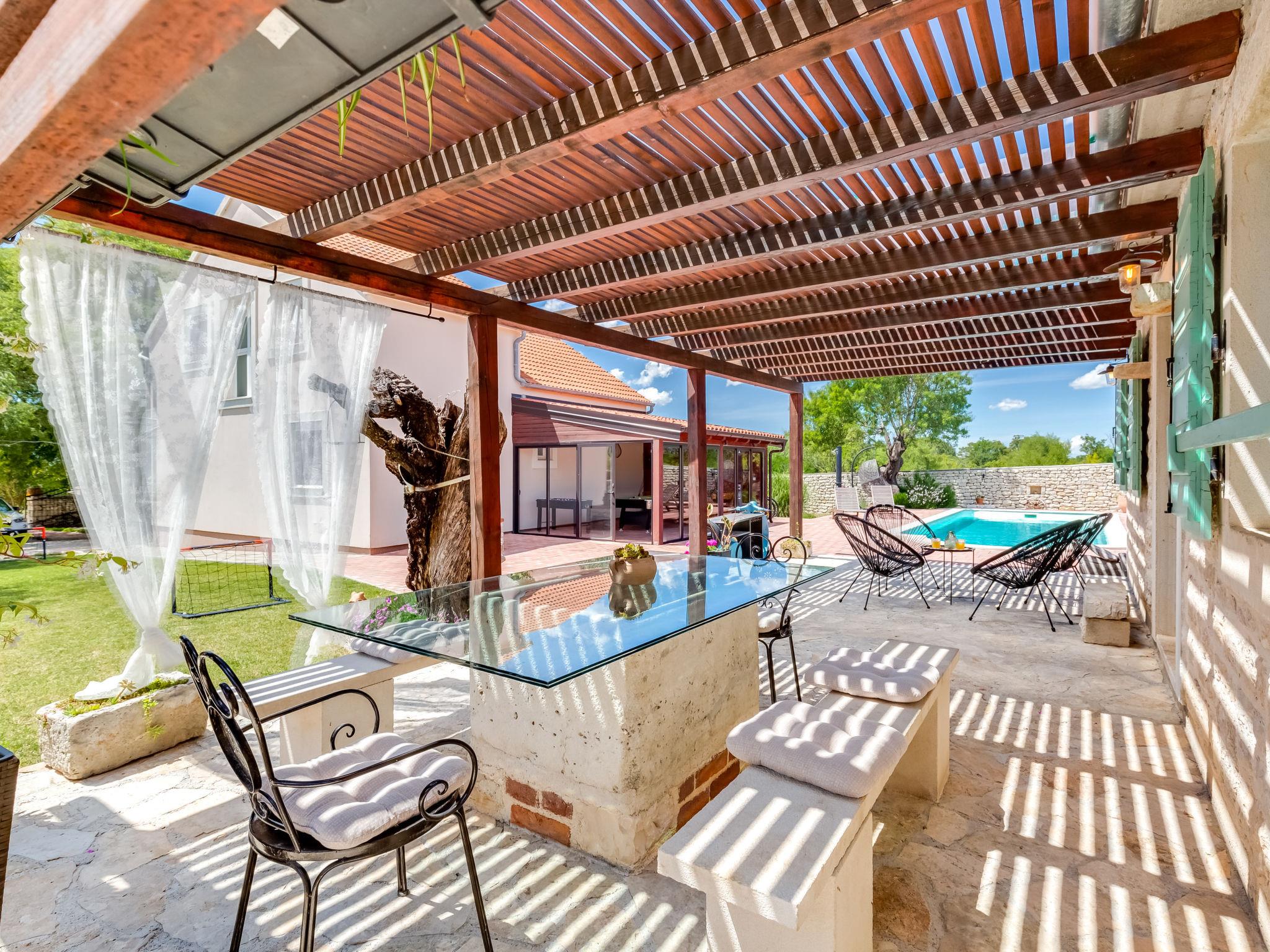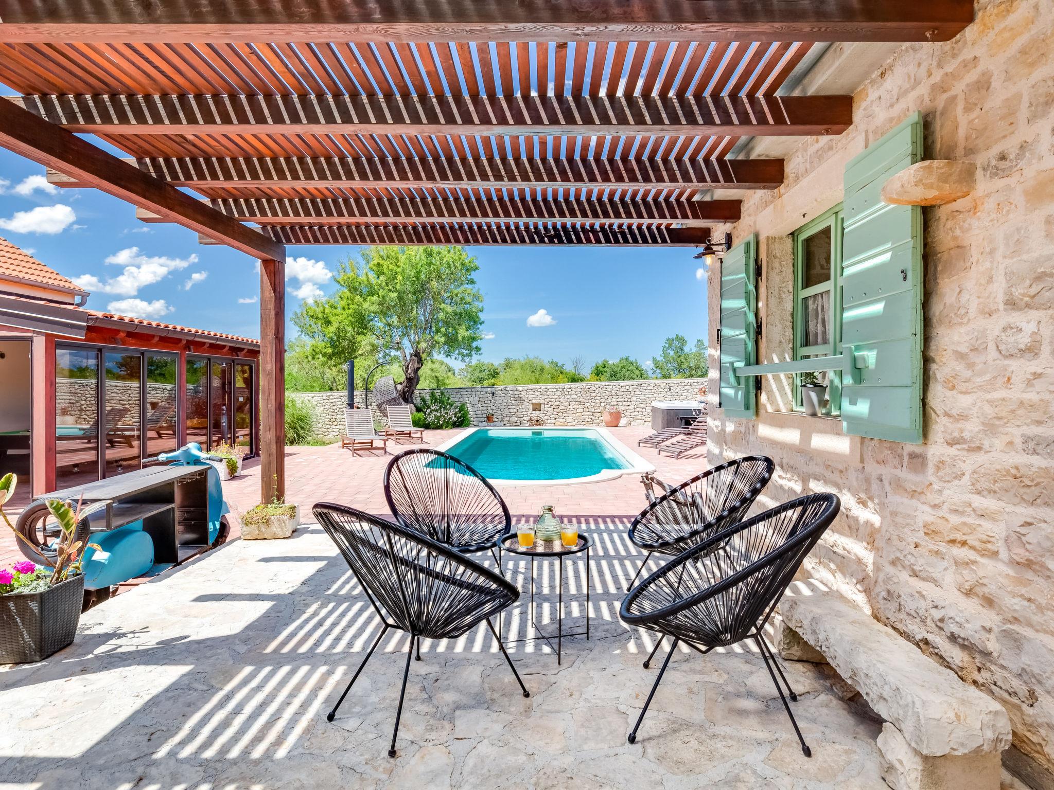 Zemunik Gornji 15 km from Sukošan: Beautiful villa "Josip & Mia", 2 storeys. 4 km from the centre of Zemunik Donji, in a quiet, sunny position, 15 km from the sea, 15 km from the beach. Private: property 1'000 m2 (fenced), swimming pool angular (8 x 4 m, depth 150 cm, seasonal availability: 01.May. - 30.Sep.) with internal staircase. Outdoor shower, hot tub, pergola, terrace (40 m2), garden furniture, barbecue. In the house: internet access, washing machine. Parking (for 3 cars) at the house on the premises. Shop 1.5 km, restaurant 15 km, bus stop 8.4 km, pebble beach 15 km. Nearby attractions: NP Krka 45 km. Please note: suitable for families. The owner does not accept any youth groups.