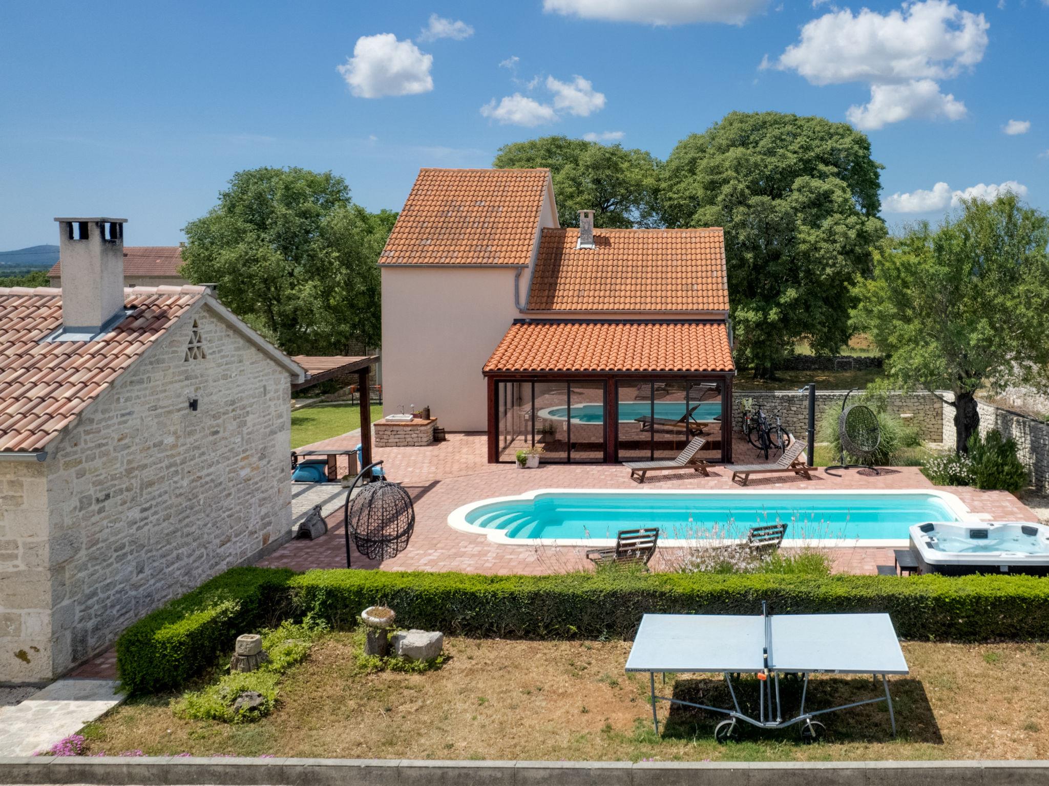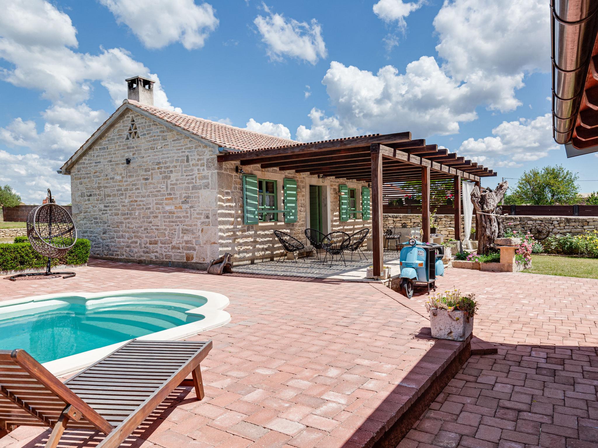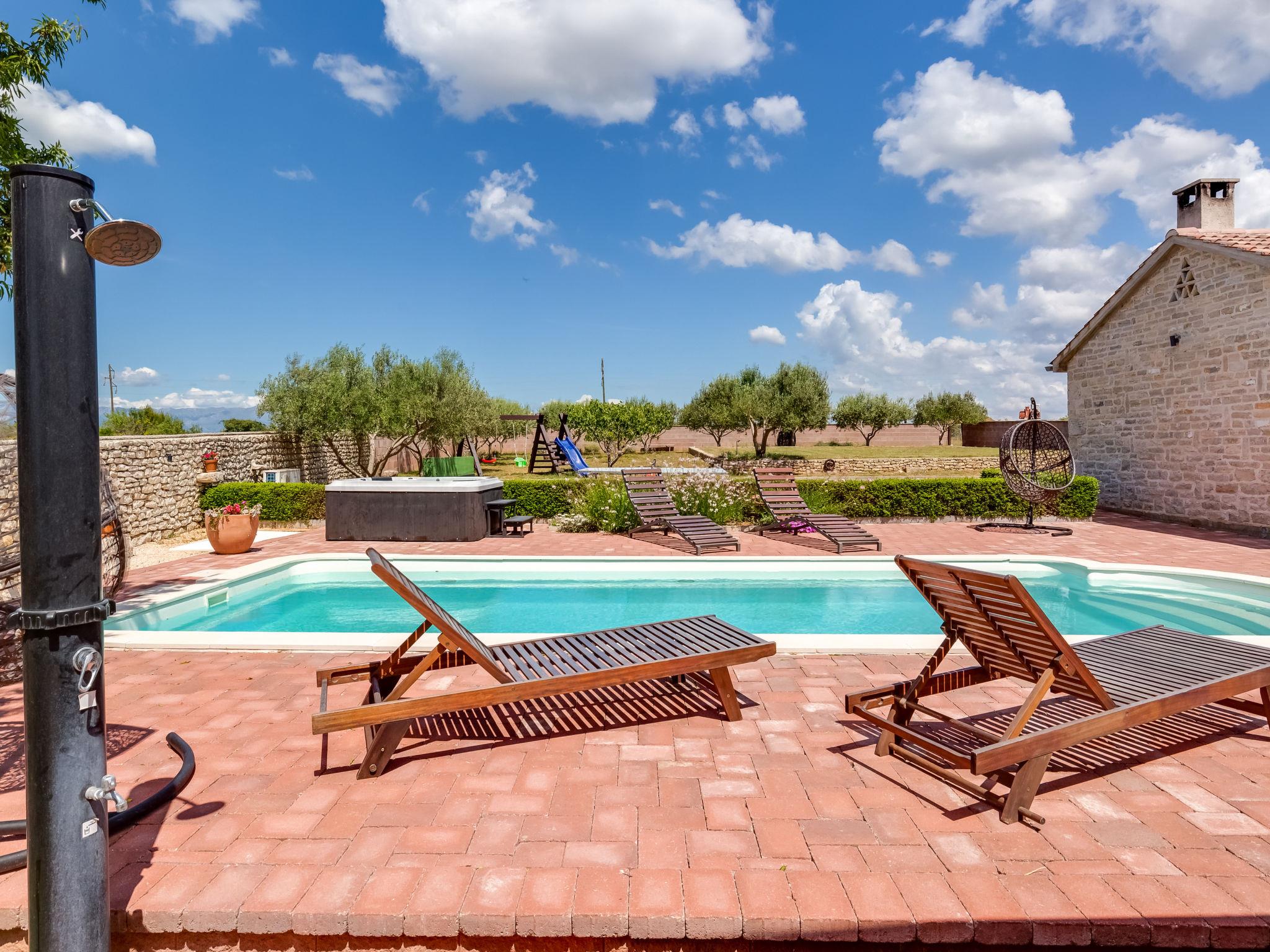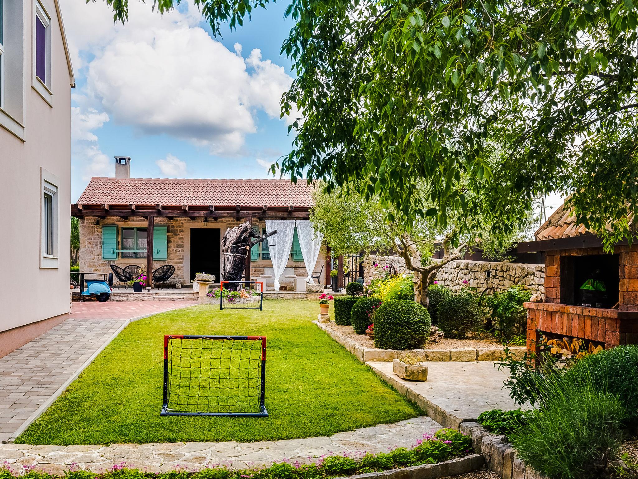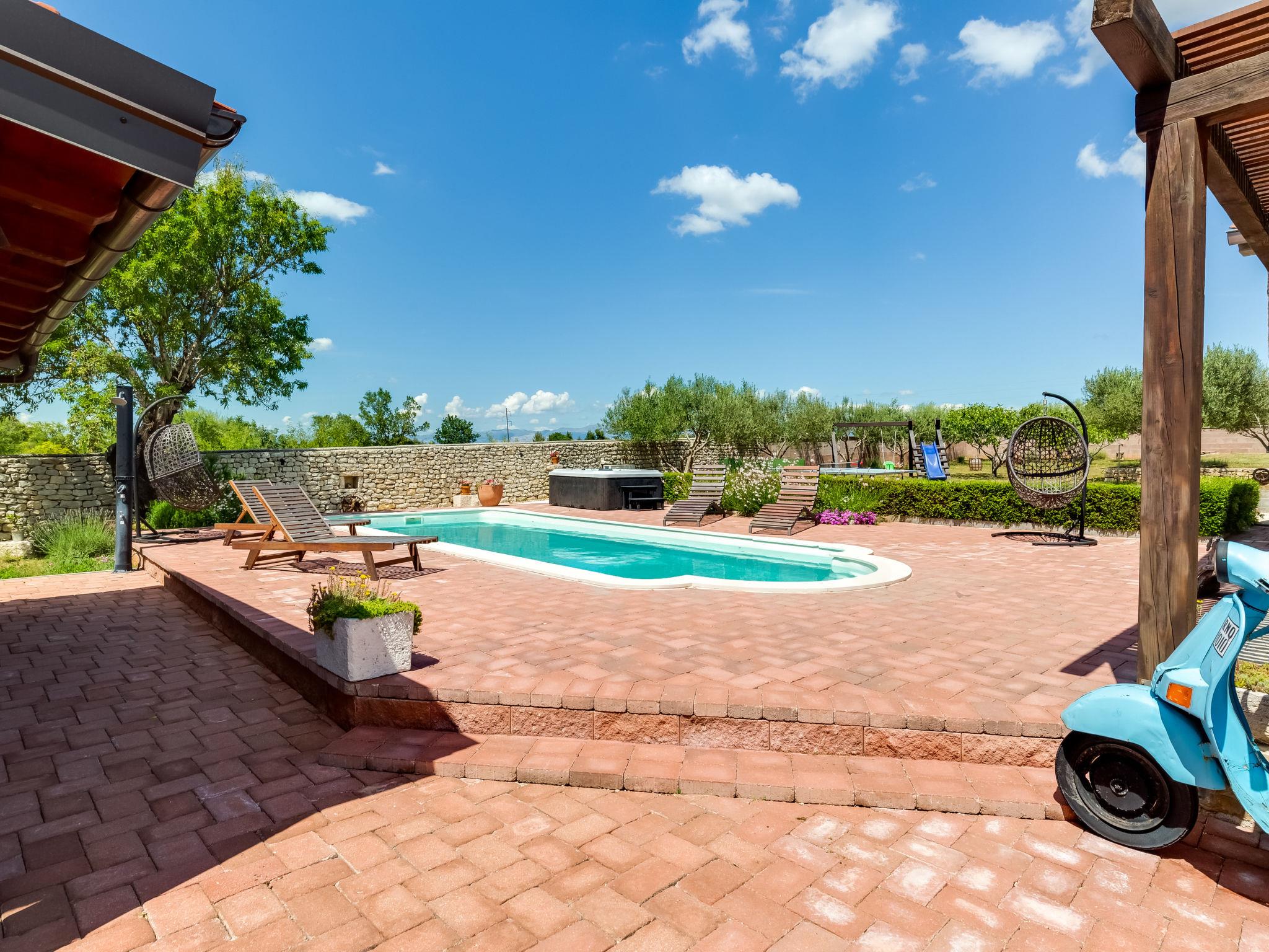 Zemunik Gornji 15 km from Sukošan: Beautiful villa "Josip & Mia", 2 storeys. 4 km from the centre of Zemunik Donji, in a quiet, sunny position, 15 km from the sea, 15 km from the beach. Private: property 1'000 m2 (fenced), swimming pool angular (8 x 4 m, depth 150 cm, seasonal availability: 01.May. - 30.Sep.) with internal staircase. Outdoor shower, hot tub, pergola, terrace (40 m2), garden furniture, barbecue. In the house: internet access, washing machine. Parking (for 3 cars) at the house on the premises. Shop 1.5 km, restaurant 15 km, bus stop 8.4 km, pebble beach 15 km. Nearby attractions: NP Krka 45 km. Please note: suitable for families. The owner does not accept any youth groups.