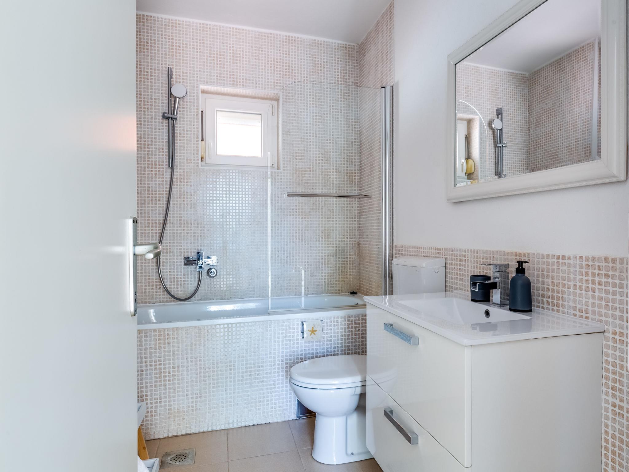 5-room villa 141 m2 on 2 levels, south facing position. Living/dining room 60 m2 with satellite TV (flat screen), air conditioning. Exit to the terrace. 1 room with 1 french bed (160 cm, length 200 cm). 1 room with 2 beds (90 cm, length 200 cm). Open kitchen (oven, dishwasher, 4 ceramic glass hob hotplates, microwave, freezer, electric coffee machine). Sep. WC. Upper floor: 1 room with 1 french bed (160 cm, length 200 cm), air conditioning. 1 room with 2 beds (90 cm, length 200 cm). Shower/WC. Forced-air heating. Terrace furniture, deck chairs. Facilities: hair dryer. Internet (WiFi, free).