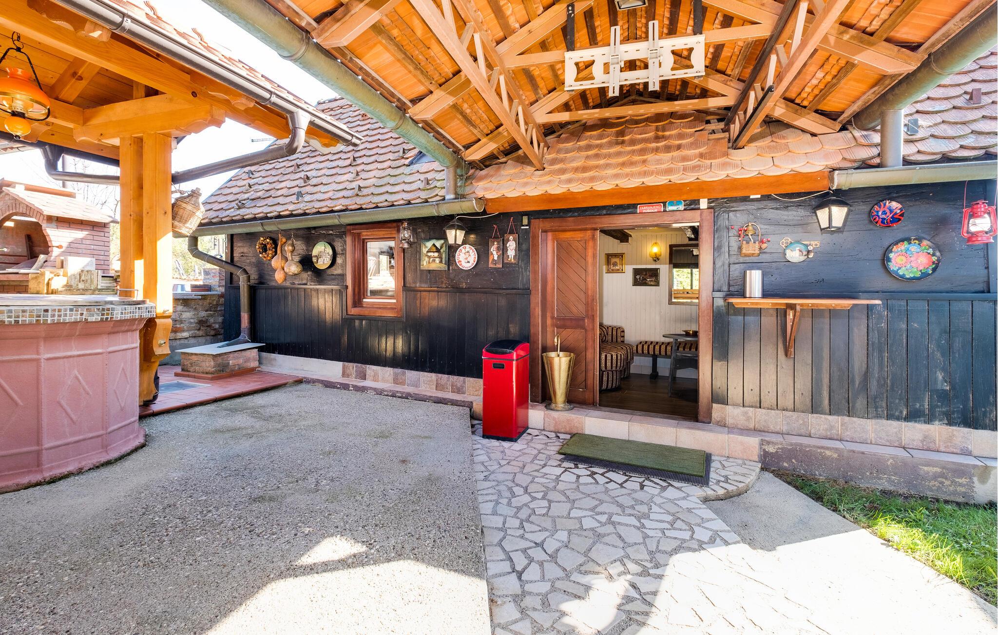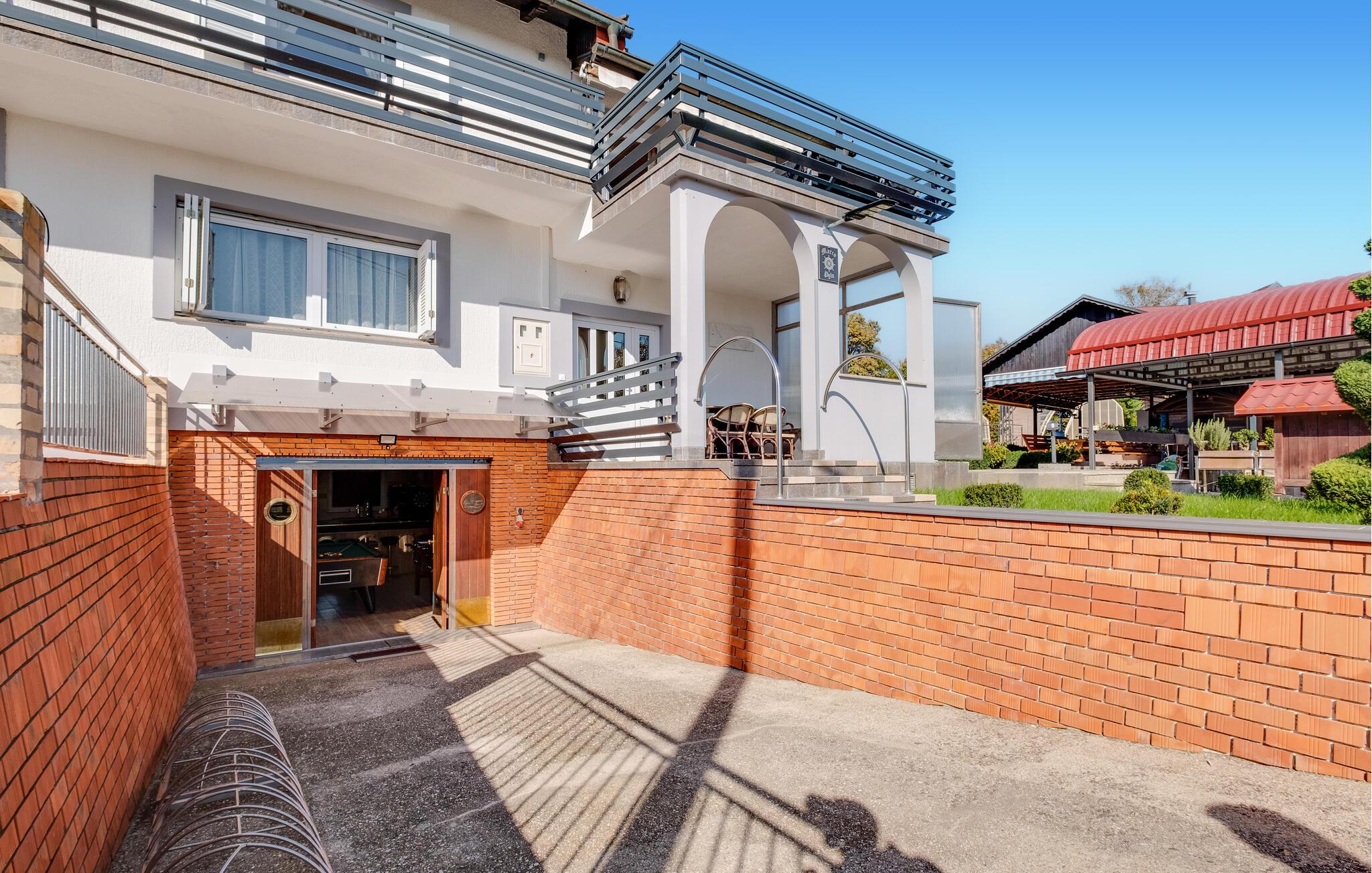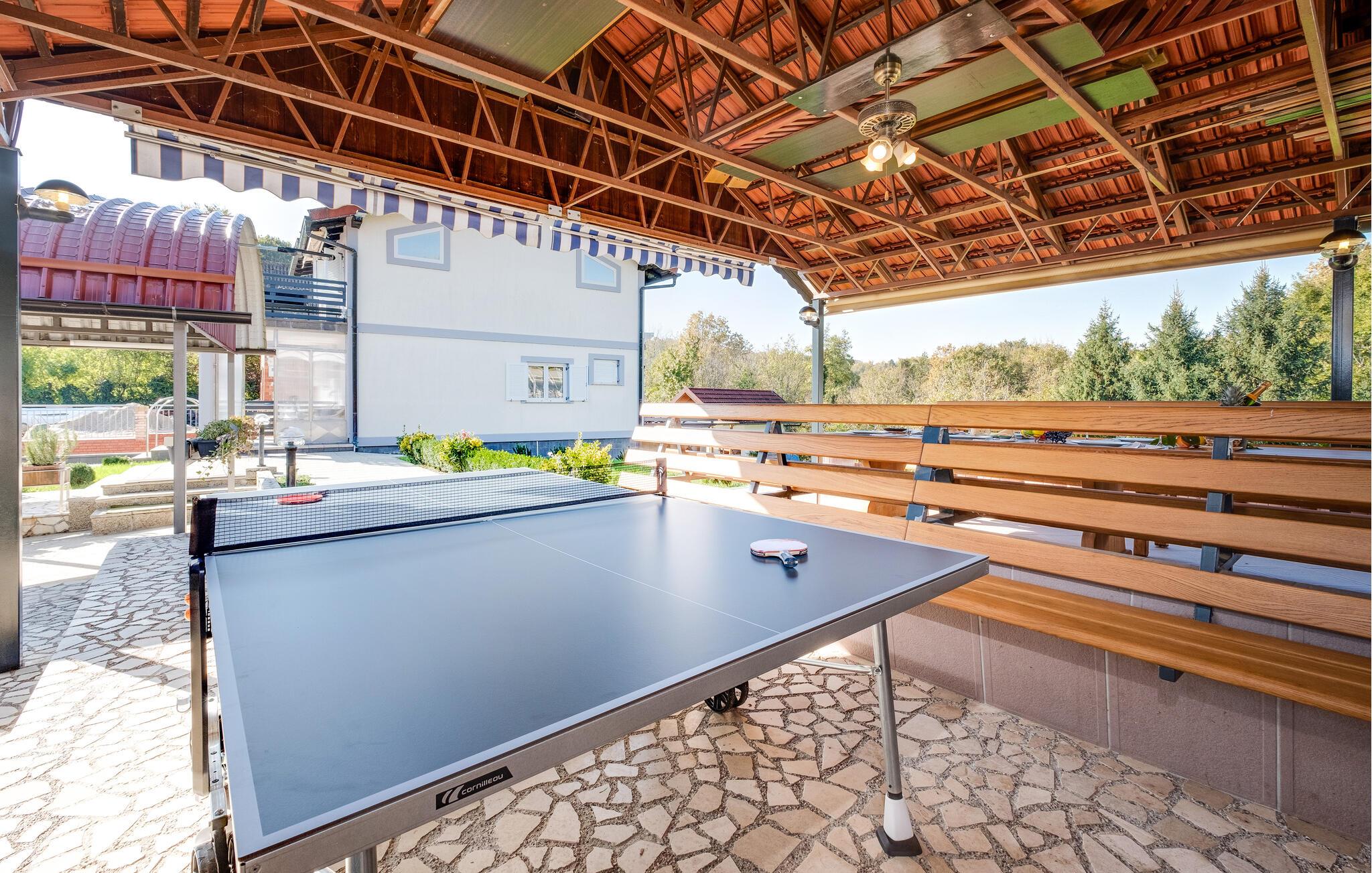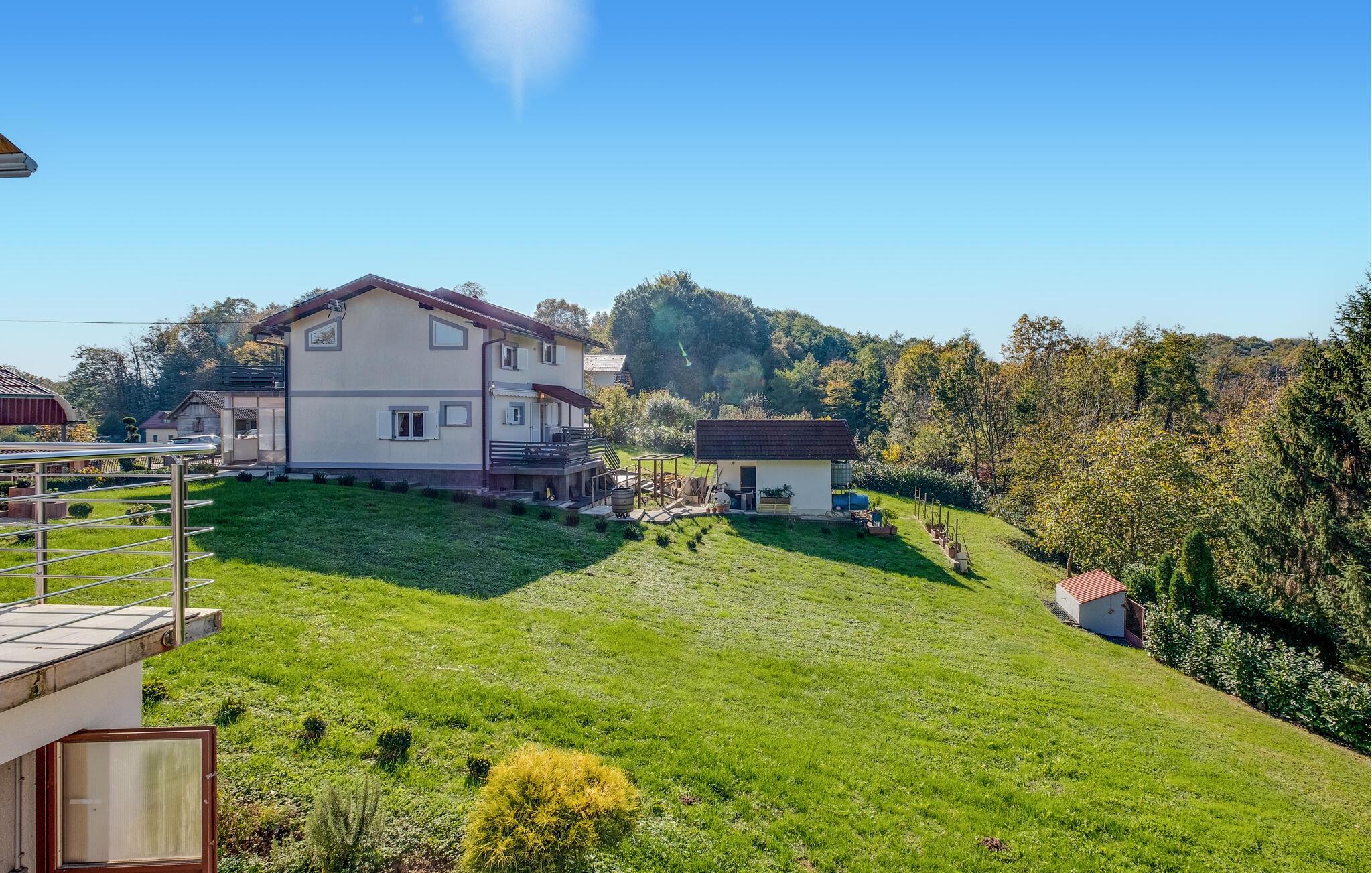 Velkommen til dette indbydende feriehus nær Zagreb, som tilbyder komfort og stilfuld hygge. Her venter jer en sand oase af afslapning midt i naturen, perfekt til en ferie med familie eller venner. Et særligt højdepunkt er den opvarmede pool: under åben himmel i højsæsonen og som overdækket indendørspool i lavsæsonen, hvilket sikrer jer afslappende stunder året rundt. Den store have er et paradis for både store og små – med solrige terrasser, et udendørs køkken og grillplads til hyggelige aftener. Aktivitetsrummet med bar, billard og bordfodbold byder på masser af underholdning og opfylder alle ønsker til en vellykket ferie.