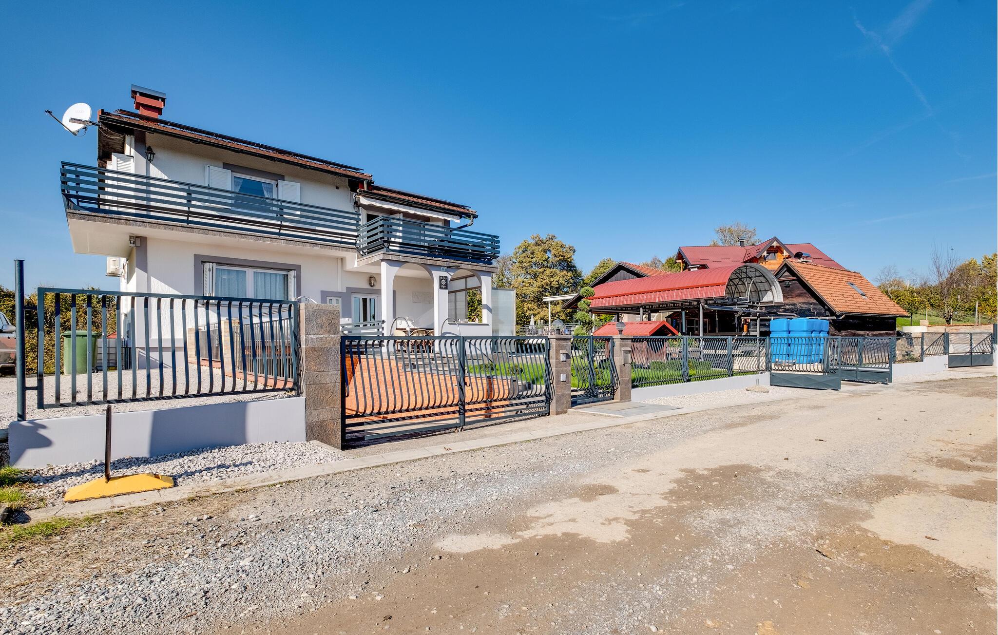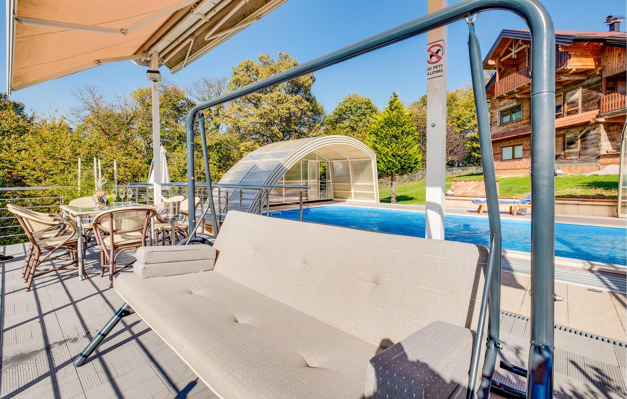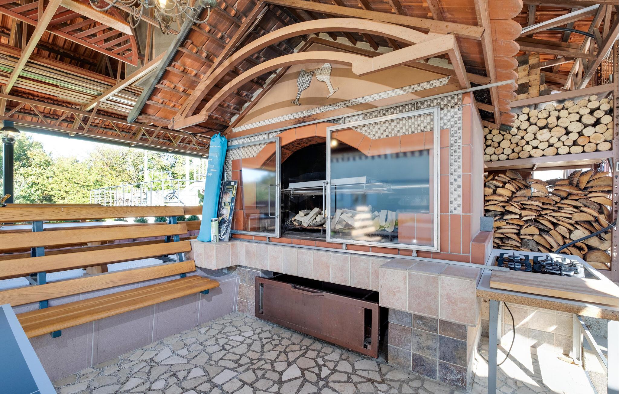 Velkommen til dette indbydende feriehus nær Zagreb, som tilbyder komfort og stilfuld hygge. Her venter jer en sand oase af afslapning midt i naturen, perfekt til en ferie med familie eller venner. Et særligt højdepunkt er den opvarmede pool: under åben himmel i højsæsonen og som overdækket indendørspool i lavsæsonen, hvilket sikrer jer afslappende stunder året rundt. Den store have er et paradis for både store og små – med solrige terrasser, et udendørs køkken og grillplads til hyggelige aftener. Aktivitetsrummet med bar, billard og bordfodbold byder på masser af underholdning og opfylder alle ønsker til en vellykket ferie.