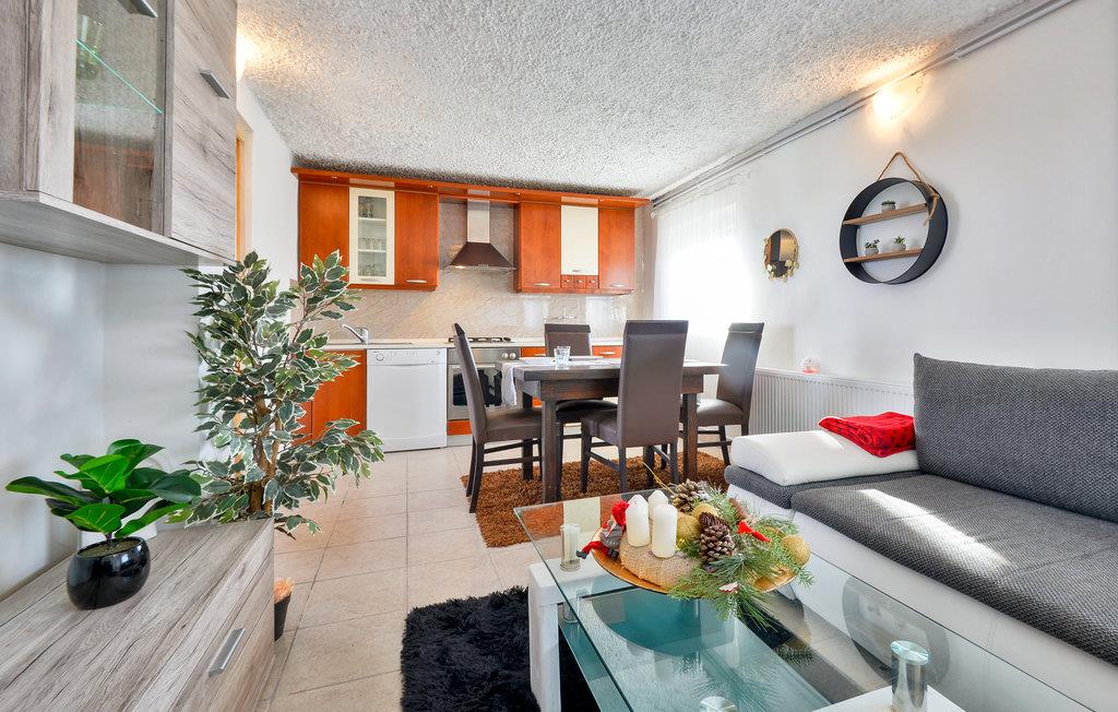 Efter en fantastisk dag med unikke oplevelser, kan I slappe af i stuen og tilberede et måltid i køkkenet. I kan selvfølgelig også spise i det fri på terrassen. Er vejret dårligt, kan I tilbringe en hyggelig familieaften foran tv'et i den hjemlige stue.