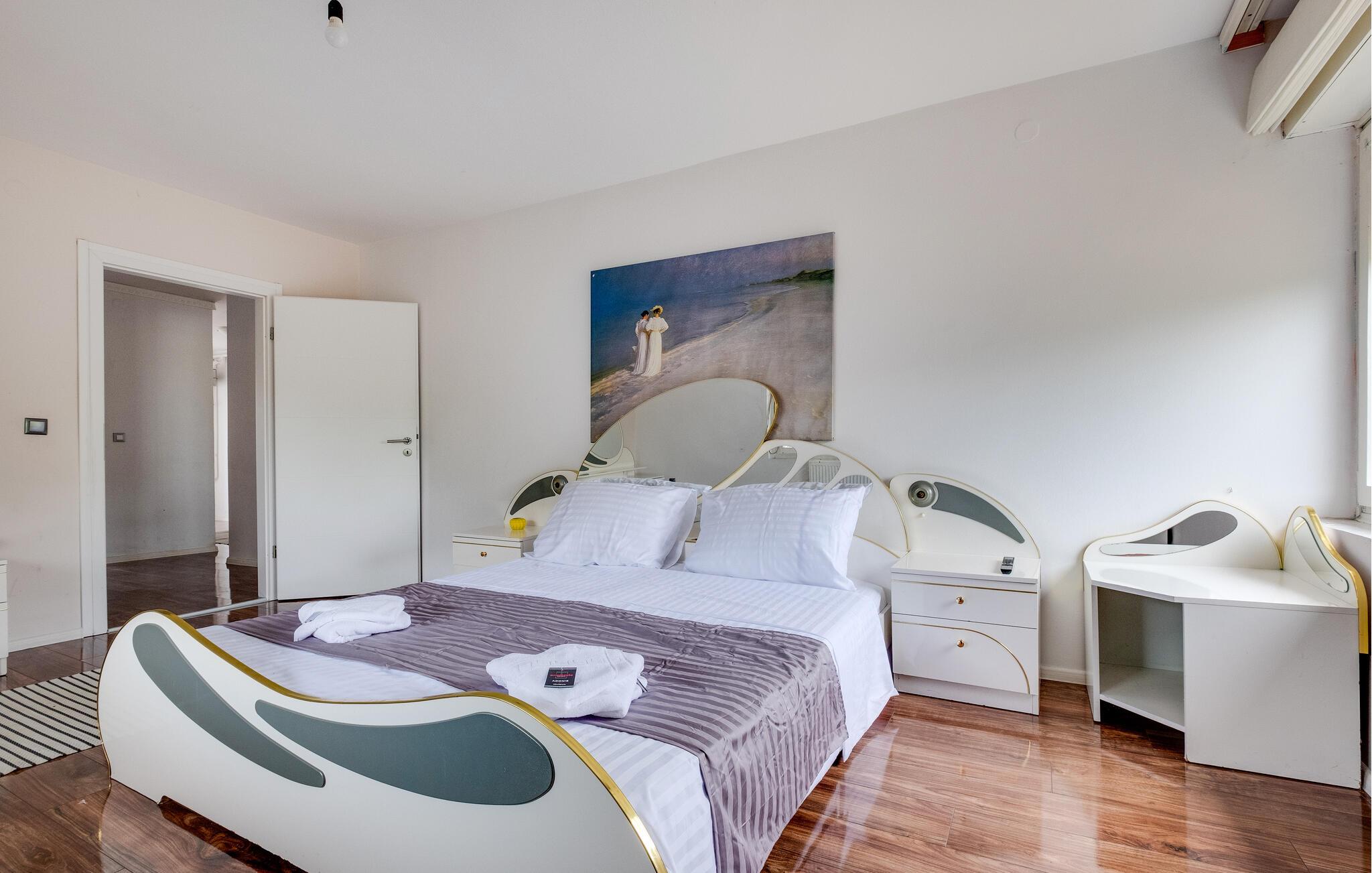 Slap af i dette store feriehus nær Zagreb. Dette store feriehus nær Zagreb byder på en lys og behagelig atmosfære, optimal til en familie eller to par. Den åbne pejs i stuen skaber en varm og indbydende atmosfære, mens de moderne indrettede værelser byder på masser af plads til afslapning. De store vinduespartier slipper masser af dagslys ind, og det klassiske interiør lægger op til en god følelse. Det åbne design skaber en harmonisk sameksistens af opholds- og spiseområder, perfekt til omgængelige aftener. En stor udendørs pool venter på jer til at køle af på varme dage. Terrassen byder på plads til al fresco spisning, og de grønne omgivelser giver jer mulighed for at slappe af og nyde udsigten over naturen. For jer som aktive gæster er der cykel- og vandrestier i nærheden, der fører til Medvednica-bjerget og Sljeme. Sava-floden er heller ikke langt væk og byder på andre fritidsmuligheder som svømning og fiskeri. Efter en kort køretur kan I nå Zagrebs centrum og nemt udforske hovedstadens kulturelle og historiske seværdigheder. Der er talrige restauranter og caféer i området, hvor I kan nyde kroatiske specialiteter.