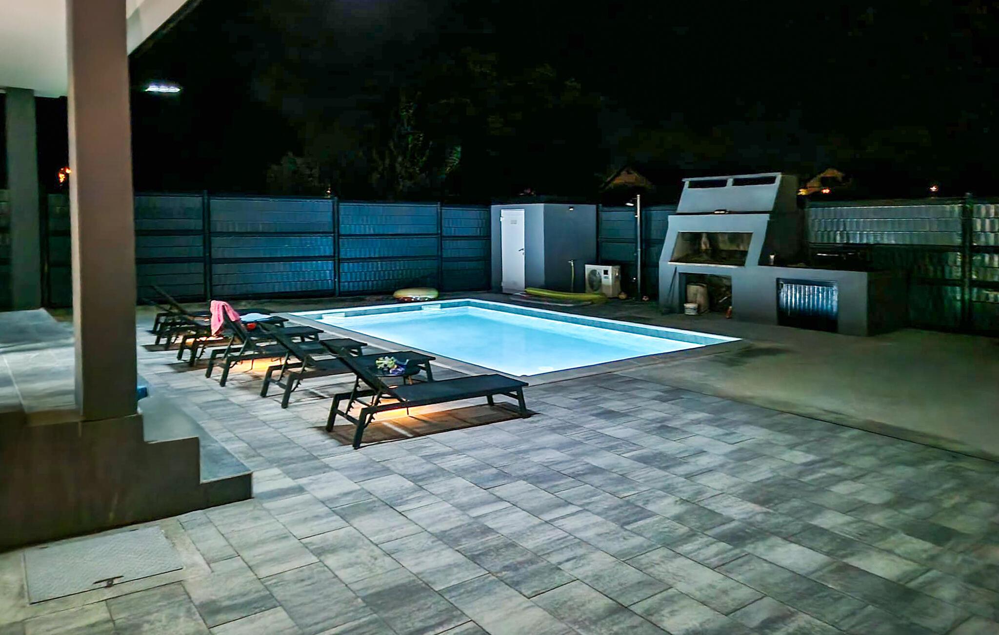 Svøm i den oplyste pool eller læn jer tilbage i de behagelige liggestole. Brug den rummelige terrasse til rolige øjeblikke eller hyggelige aftener. Tilbered måltider på den indbyggede grill og nyd dem i den beskyttede beliggenhed, der også tilbyder en behagelig atmosfære om aftenen.