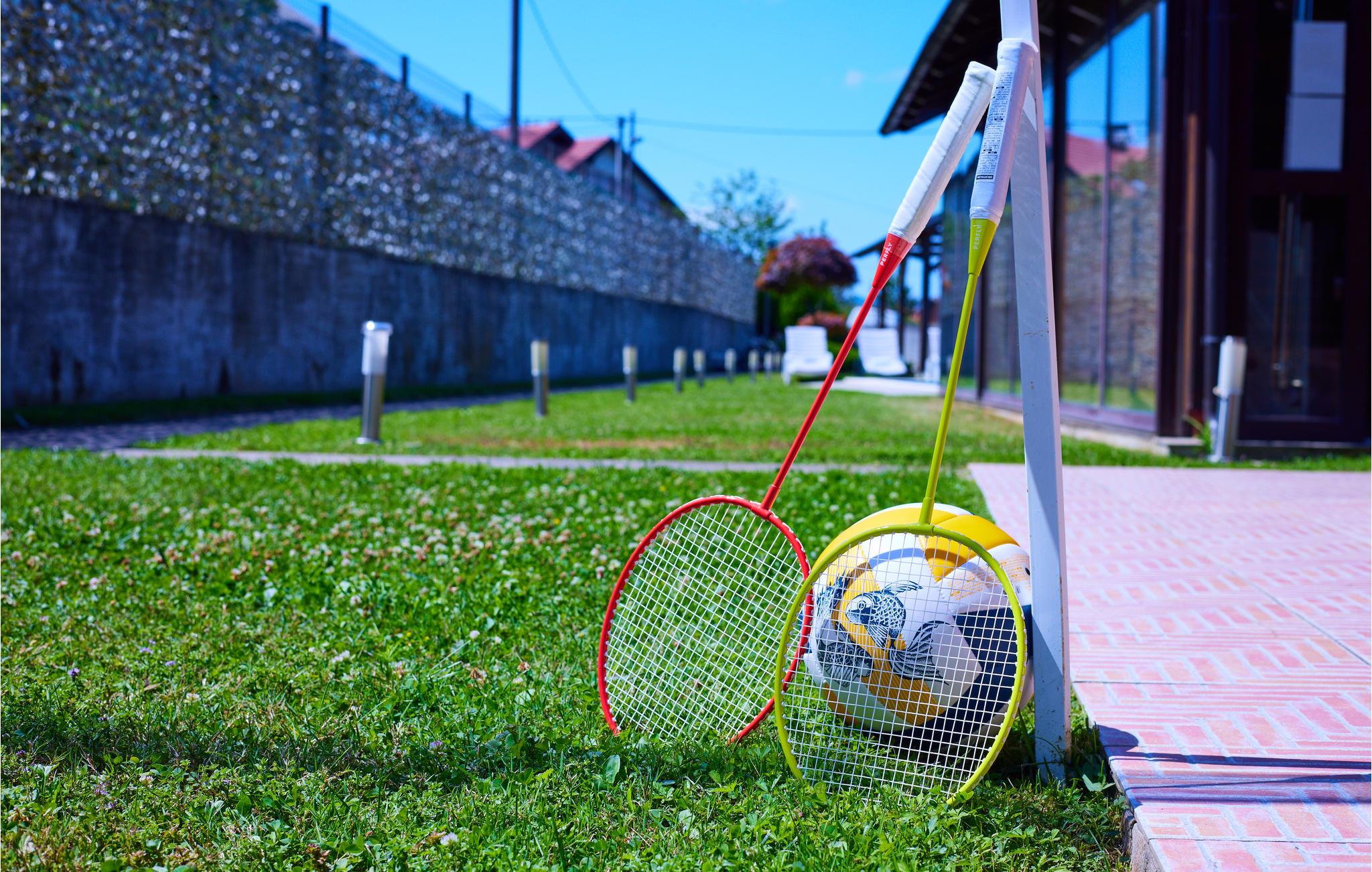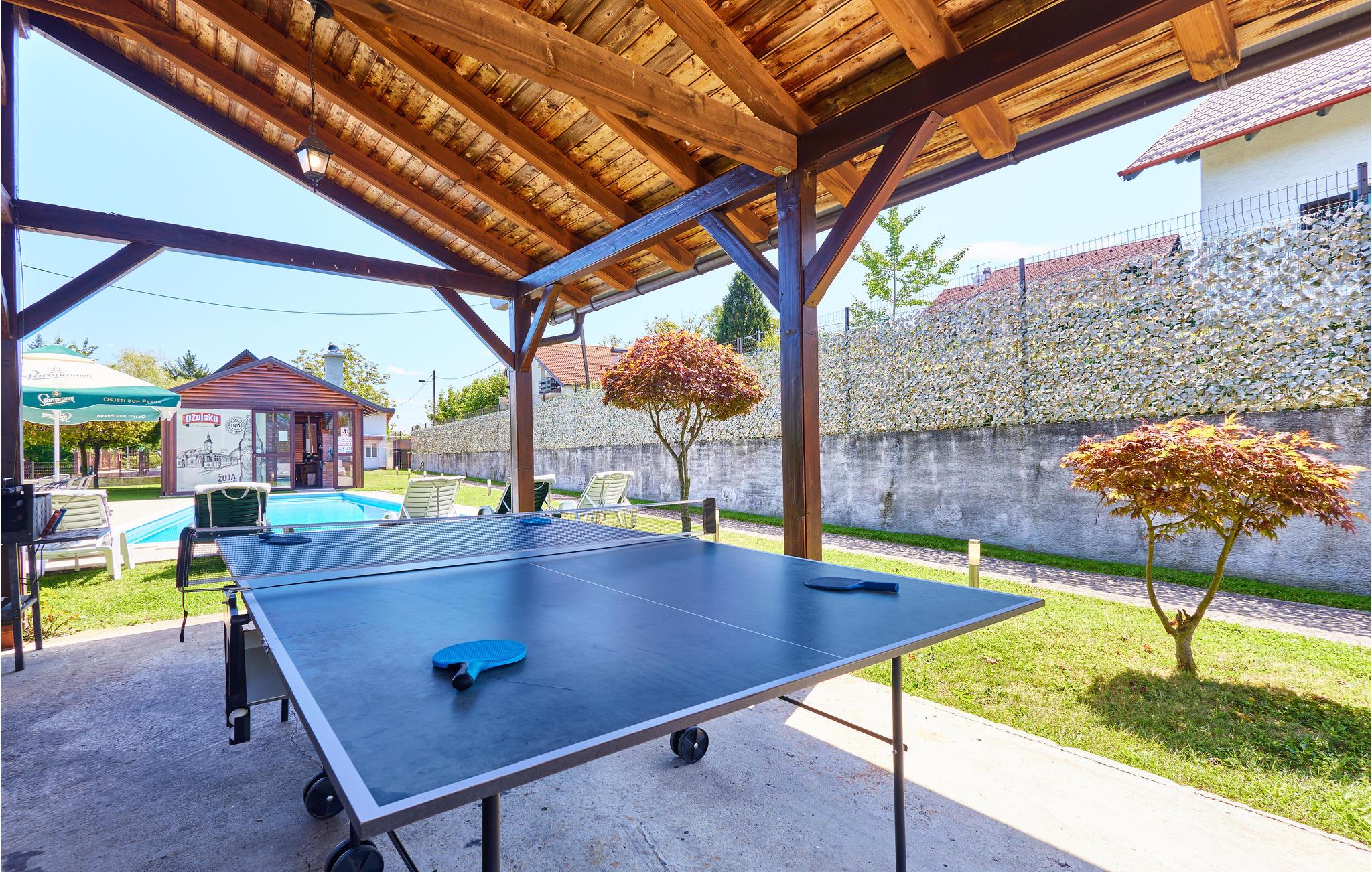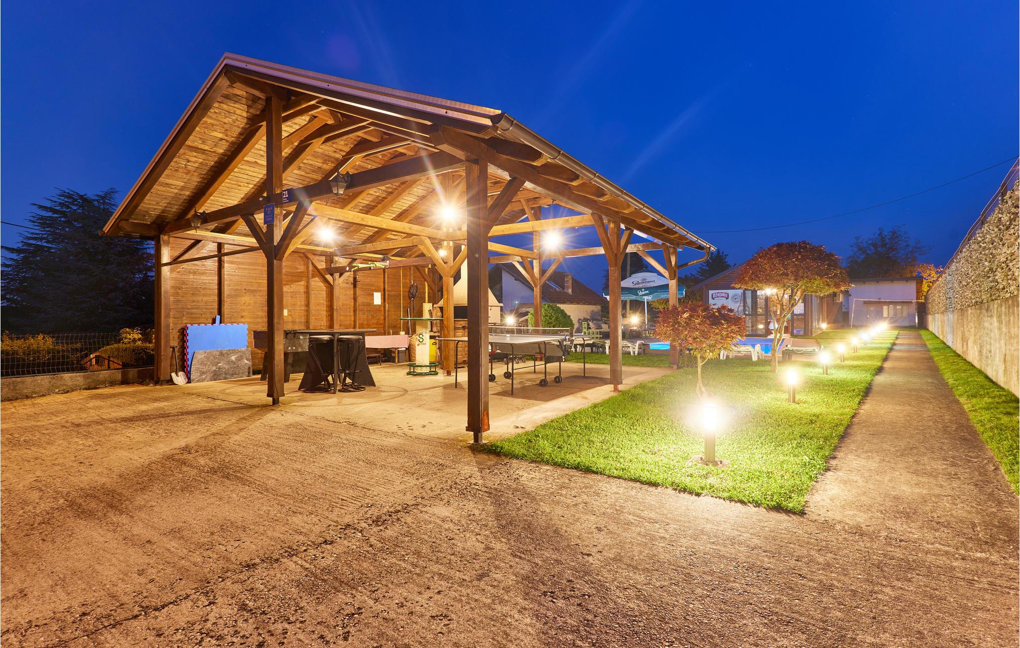 I kan også nyde havens faciliteter. Et haveskur med bar, muret grill og masser af siddepladser, samt en overdækket terrasse med bordfodbold og barborde venter på jer til timevis af socialt samvær. I kan også hoppe i den private pool for en forfriskende dukkert. Hvis I har brug for en forandring fra svømning, kan I prøve adskillige sportsgrene, det udstyr, som I finder på stedet.