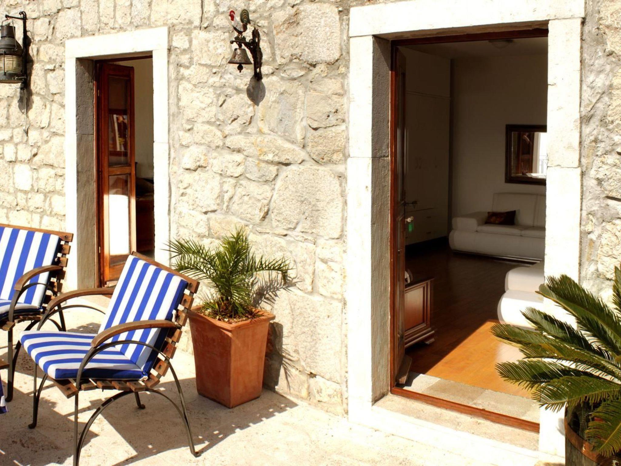 The first floor living area gives access to your private sun terrace which is a real highlight. It is equipped with a table and wooden chairs and offers spectacular views across the mountains and over the village and the sea up to the island of Hvar. During the day, awnings provide protection from the sun and in the evenings you can enjoy long dinners under the starlit sky. A car is recommended to explore the sights and attractions the area has to offer, two parking spaces are available right in front of the villa
