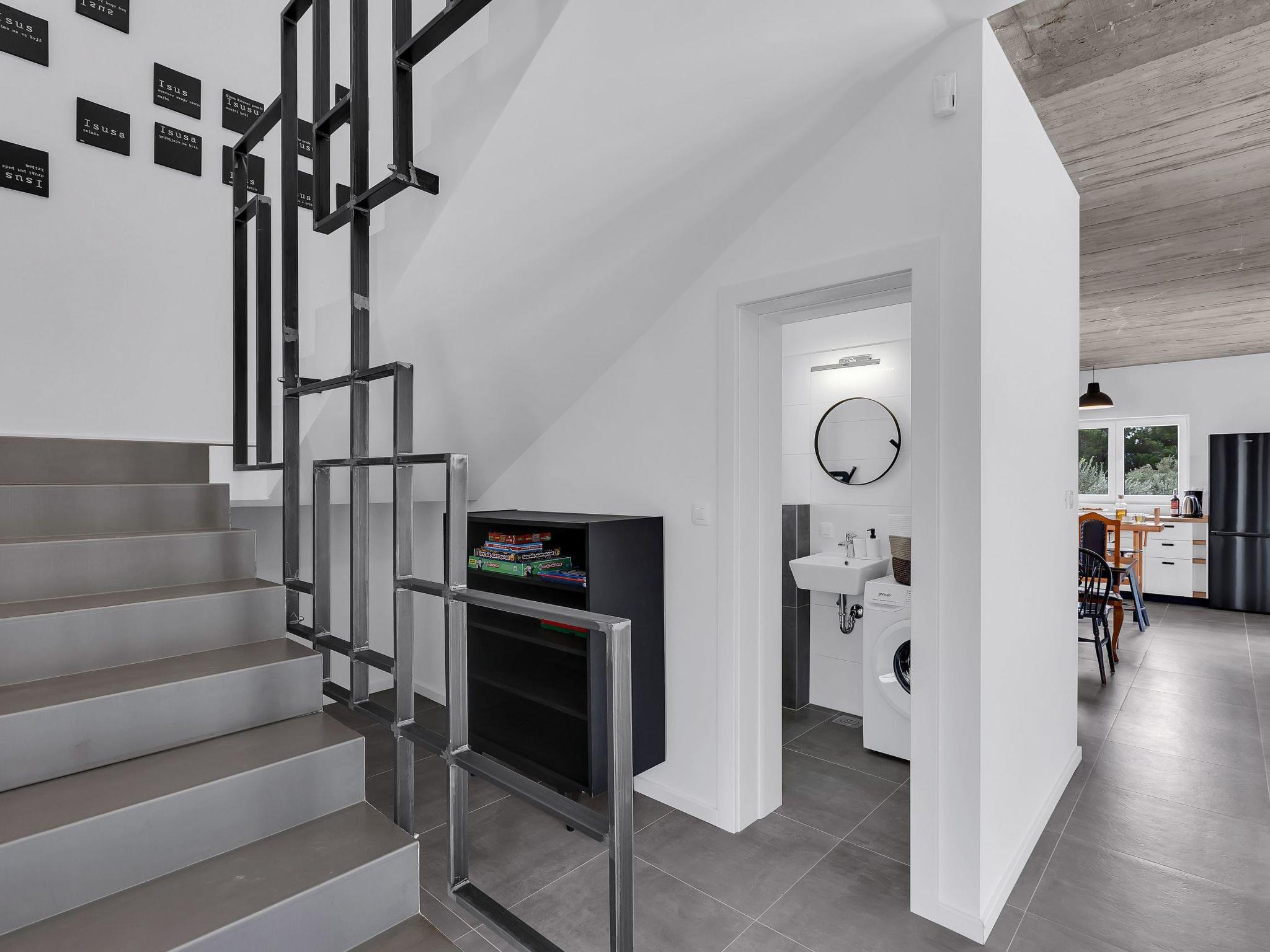 The house extends over 2 floors. The ground floor consists of an open-plan living area with a kitchen, a dining room and a toilet.