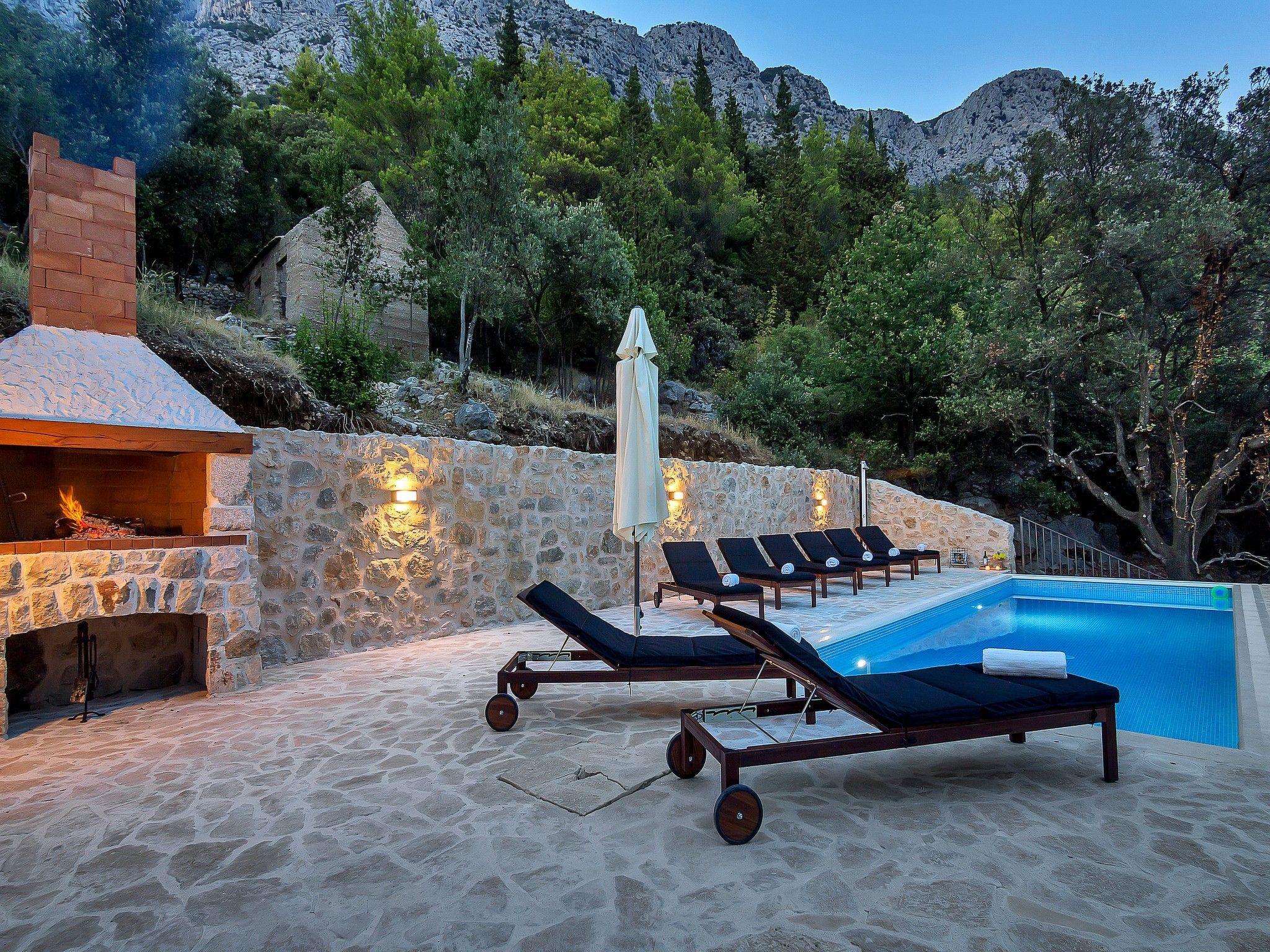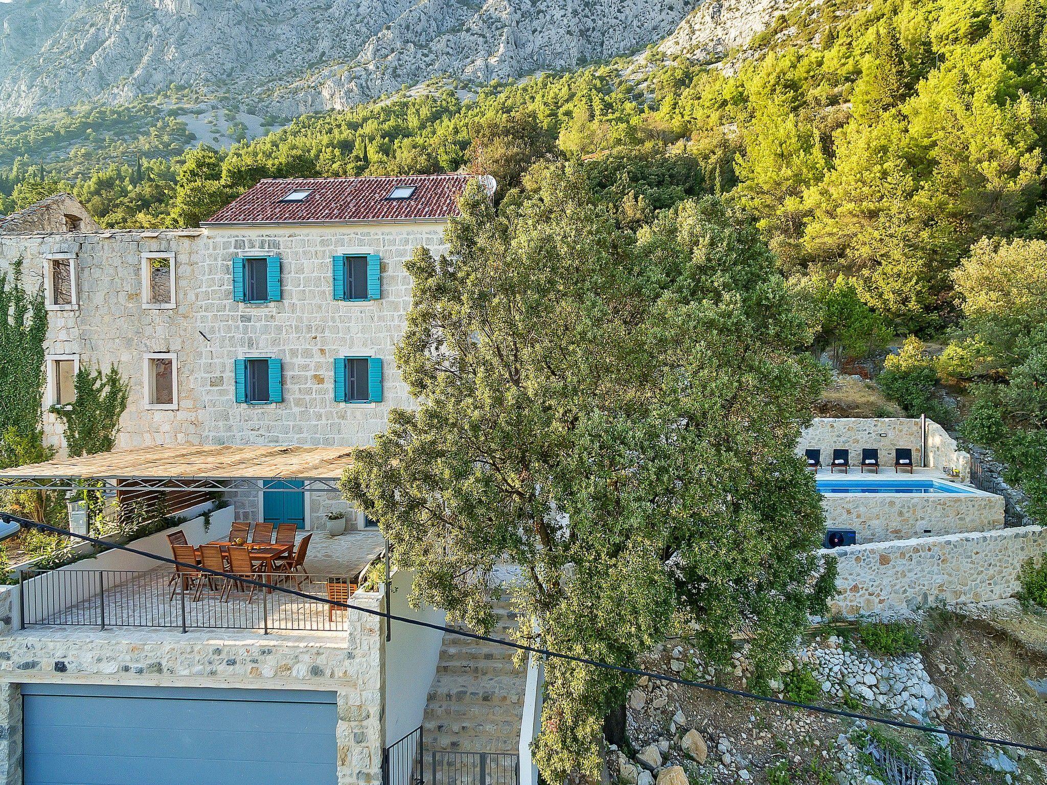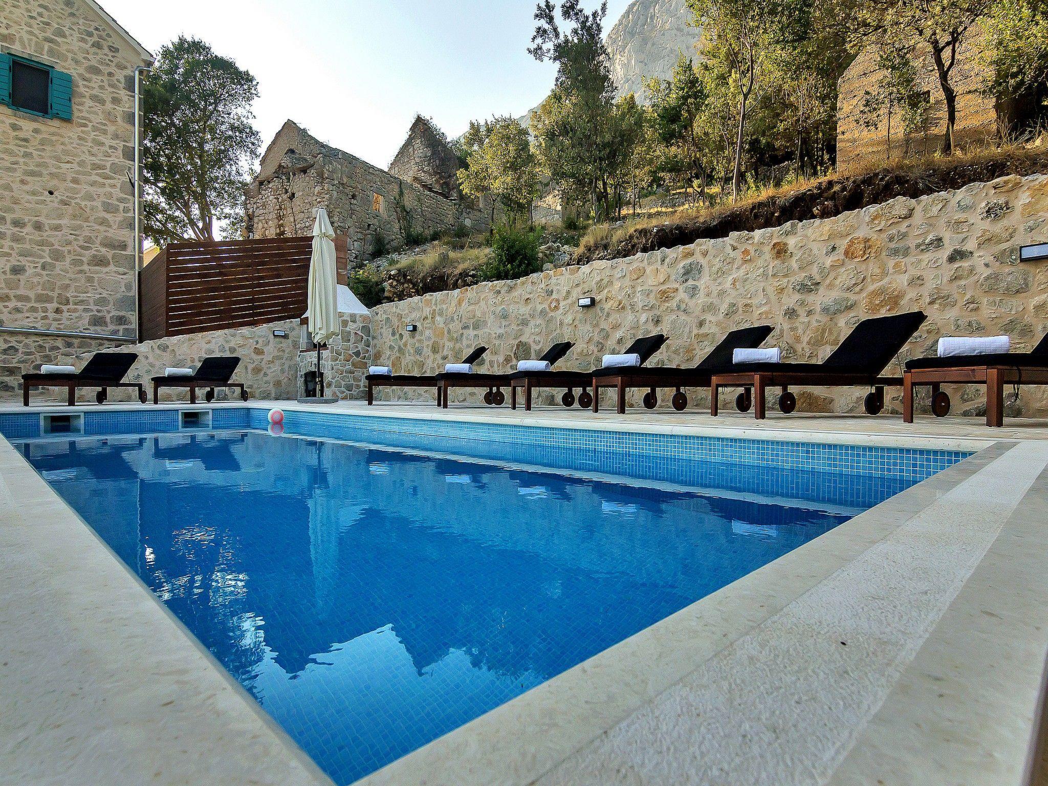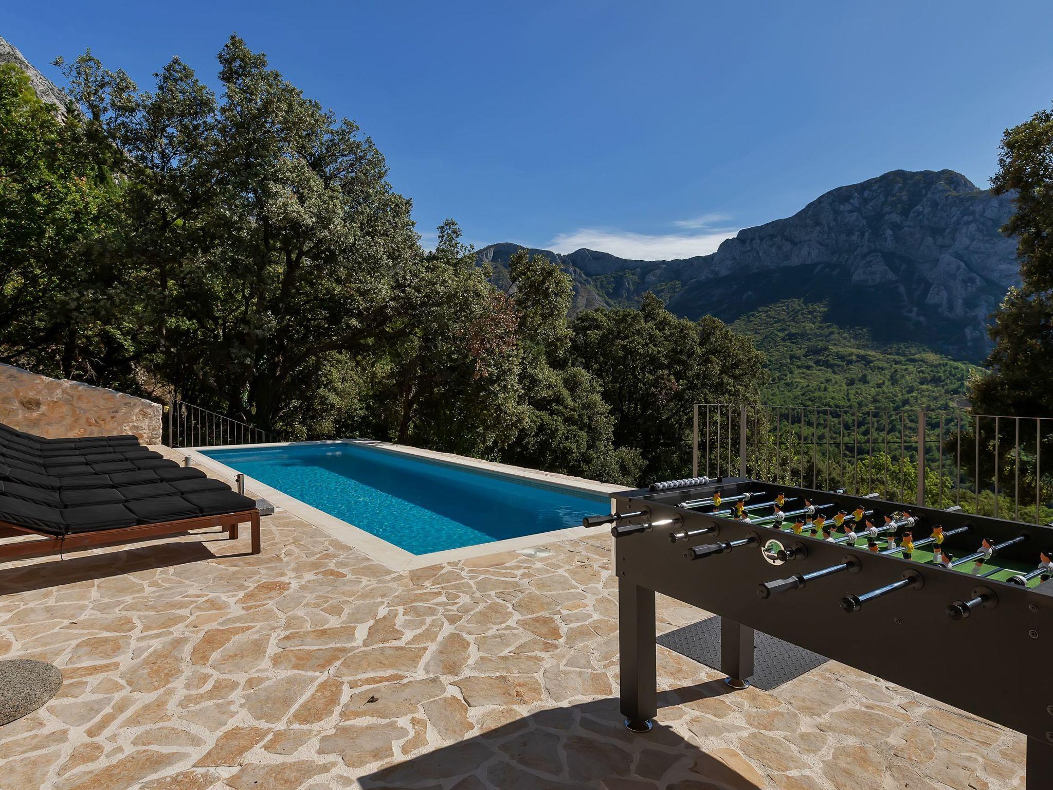 This idyllic 19th century stone house is located in an unspoilt landscape on the Makarska Riviera. The perfect holiday destination for those seeking seclusion and nature, the enchanting hillside location, in a picturesque hamlet typical of Dalmatia, offers magnificent panoramic views of the countryside, sea and islands. The interior, a blend of modern and antique, creates a warm and welcoming impression. The stone house has four double bedrooms and four bathrooms. All rooms are spread over three floors. In addition to the modern kitchen and living area, it also has a lovely terrace with sea views. The charming holiday home also offers a heated swimming pool (9.00x3.00) with sun loungers and a barbecue area. Garage for 2 cars and six bicycles are also available. Table tennis and table football on the terrace by the pool.