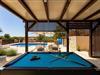 Denne charmerende villa ligger i den rolige landsby Zapužane og tilbyder en fredelig oase omgivet af Dalmatiens smukke landskab. Villaen ligger gemt væk på en rummelig privat ejendom og er det perfekte sted at slappe af, genoprette kontakten med sine kære og nyde livets enkle glæder. En kort køretur væk finder du den livlige kystby Biograd og dens indbydende strande, men her er det roen, der er i centrum. Villaen er designet med komfort og afslapning for øje og har fire hyggelige soveværelser med aircondition og tre moderne badeværelser, hvilket gør den ideel til familier eller vennegrupper. Det åbne køkken og spiseplads smelter perfekt sammen med den elegante stue og skaber en varm og hjemlig atmosfære. Træd udenfor, og du vil opdage en smuk gårdhave fyldt med dejlige overraskelser, din private swimmingpool med liggestole og parasoller, et billardbord til lidt venlig underholdning, en trampolin til de små og en overdækket terrasse, der er perfekt til lange, afslappede måltider i solen. Udendørsområdet omfatter også en grill, skyggefulde siddepladser og et ekstra toilet i gårdhaven for ekstra bekvemmelighed. Hver eneste detalje her indbyder til afslapning, uanset om du svømmer, spiser udendørs eller blot nyder freden i den omgivende natur. For dem, der elsker at udforske, kunne beliggenheden ikke være bedre. På 15 minutter kan du nå det glitrende Adriaterhav og den charmerende kystby Biograd na Moru, der er kendt for sin livlige marina og restauranter med friske fisk og skaldyr. I nærheden ligger Vrana-søens naturpark, hvor du kan observere fugle, cykle og gå rolige ture langs søen. De historiske byer Zadar og Šibenik, der er rige på kultur og charme, ligger begge inden for en kort køretur på 30 minutter, hvilket gør denne villa til det perfekte udgangspunkt for at opleve det bedste af indlandets fred og eventyr ved havet. Bemærk: Dyr er tilladt i denne bolig, undtagen farlige dyr.