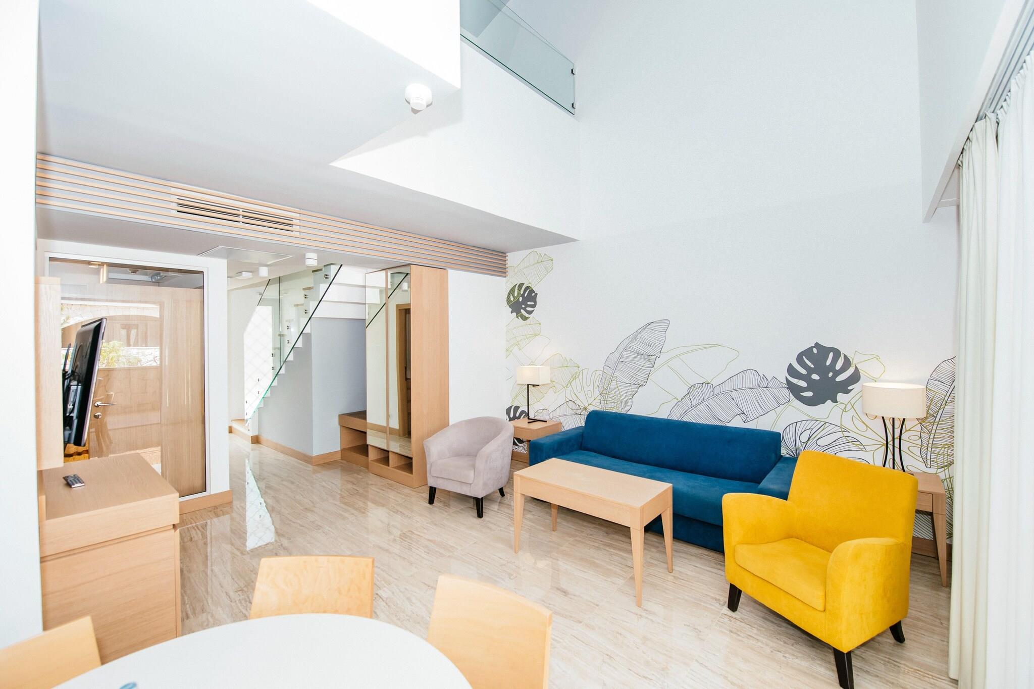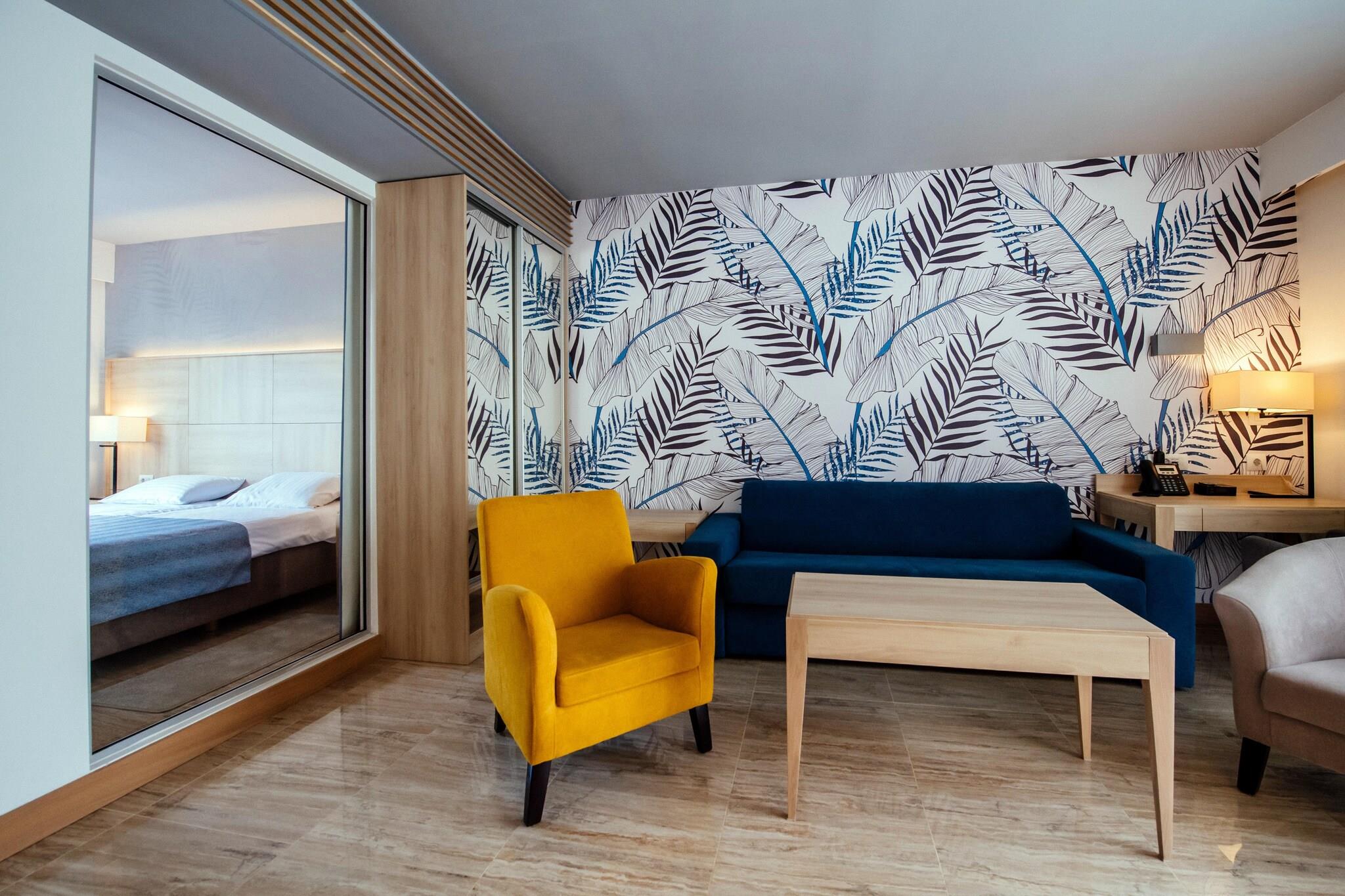 Åbent køkken(kogeplade(Komfur med to kogeplader, glaskeramisk), elkedel, kaffemaskine, mikrobølgeovn, køle-fryseskab), stue / spisestue(dobbeltsovesofa, Fjernsyn(fladskærm, parabol), spisebord, sofahjørne), soveværelse(dobbeltseng, Fjernsyn(fladskærm, parabol)), soveværelse(enkeltseng, enkeltseng), badeværelse(bruser, toilet, føntørrer), badeværelse(badekar eller bruser, toilet, føntørrer), Reception, Internetadgang, Guidede ture, Udflugter, Førstehjælp, Læge, Massage, Frisør, Supermarked, Fitness, Minigolf, Tennisbane, Dykkerskol, Strand, Vandsport, Bådudlejning, Udlejning af golfbiler , Ridning, Fodboldbane, Volleyballbane, Trampolin, Basketball, Restaurant, Børneklub, balkon eller terrasse, klimaanlæg, havemøbler, parkering, swimmingpool(deles med andre gæster, udendørs, opvarmet, inkl. separat børne swimmingpool (maks. dybde 50 cm)), swimmingpool(deles med andre gæster, udendørs), tennisbane, baby crib(paid)