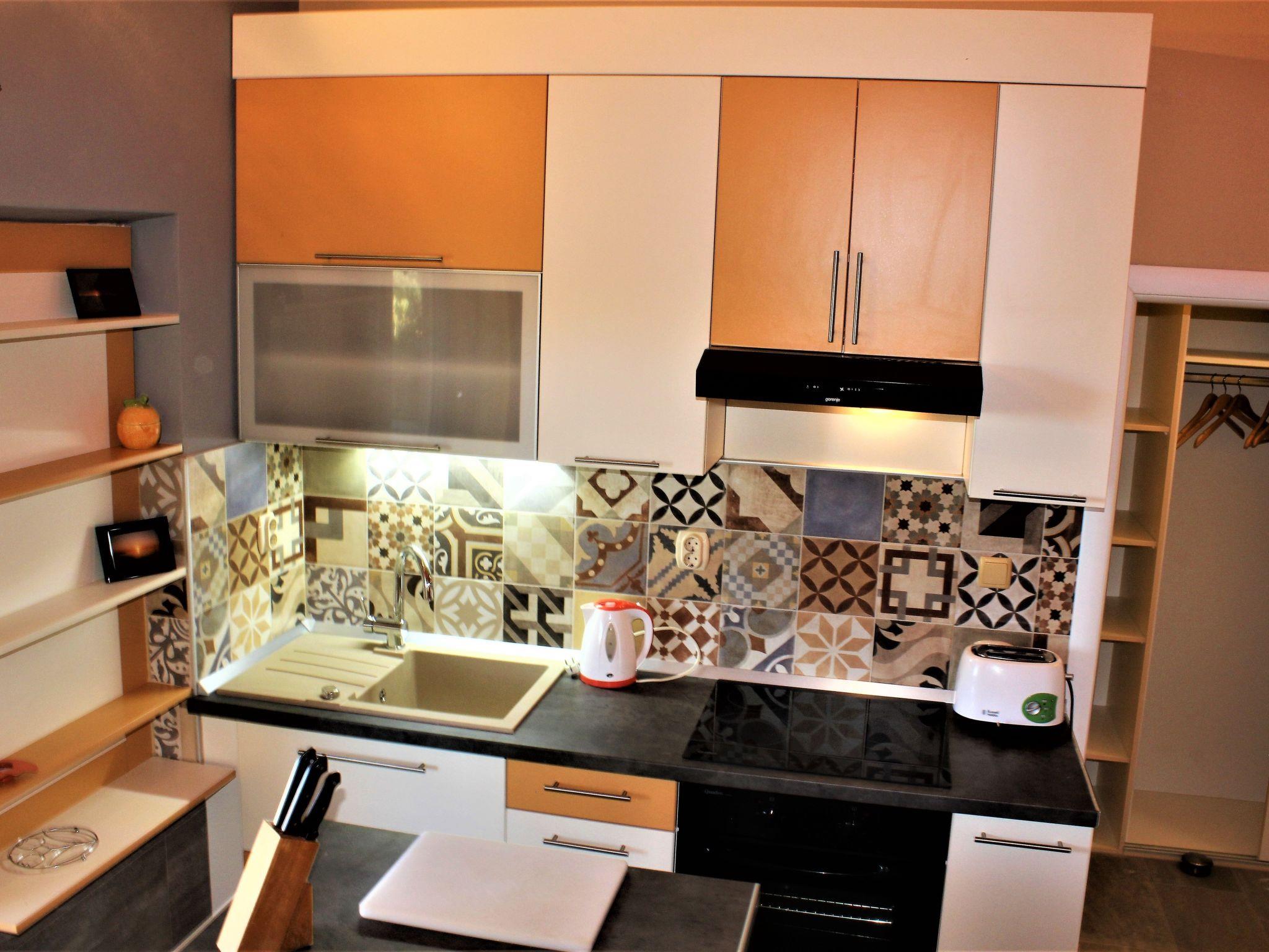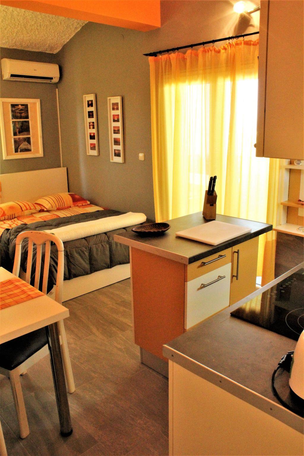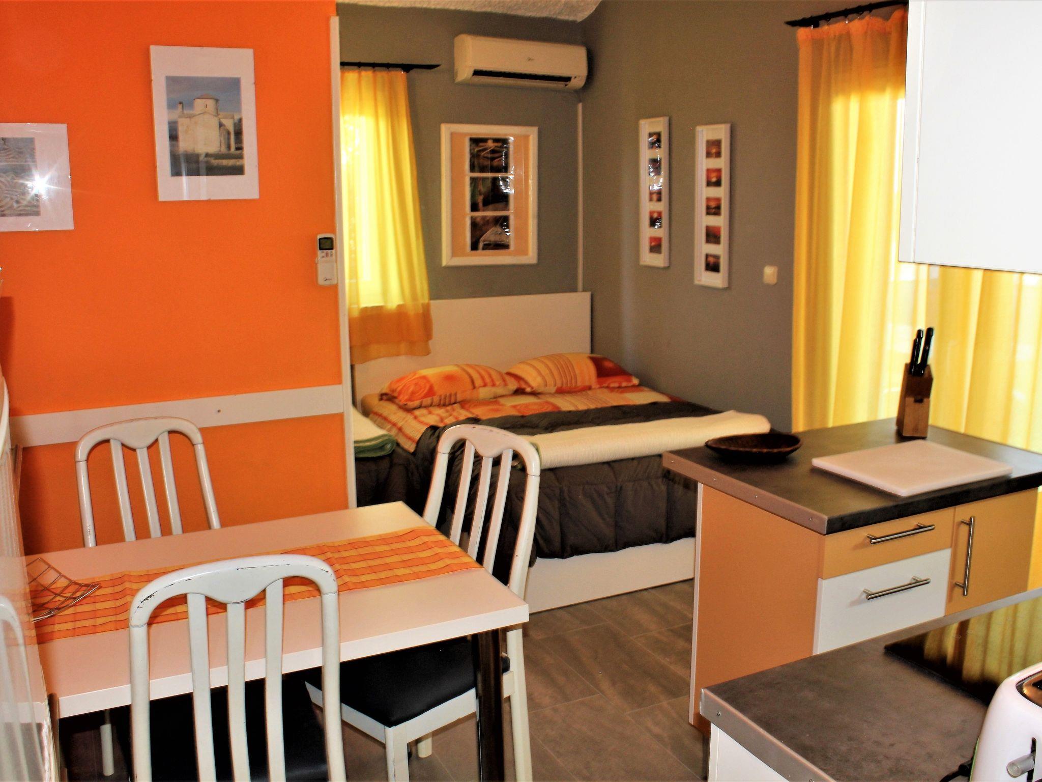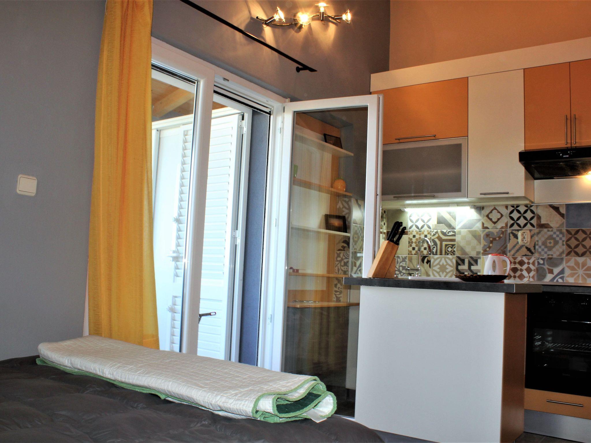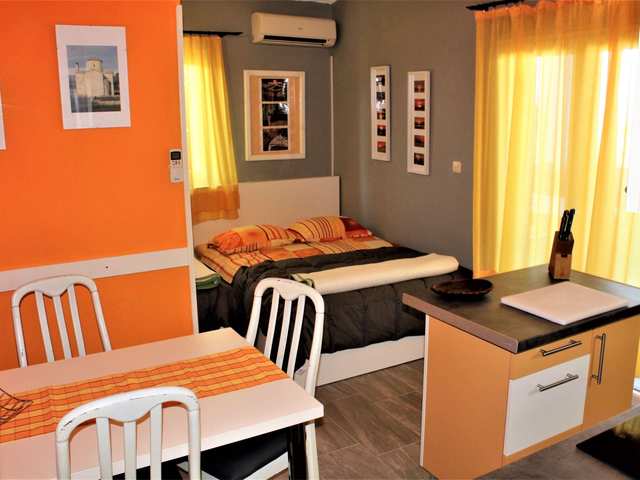 The studio apartment is on the first floor. There is a double bed and a single bed in the living area. The kitchen has all necessary utensils, an oven, electric cooker hob, electric kettle, toaster, fridge-freezer, refrigerator for water. The bathroom is equipped with a shower. It is air conditioned, equipped with digital satellite system (approximately 2000 free channels), DVD player, and a 26 “LED TV. Internet access via WLAN. In the bathroom there is a washing machine which is used exclusively by guests of the apartments.