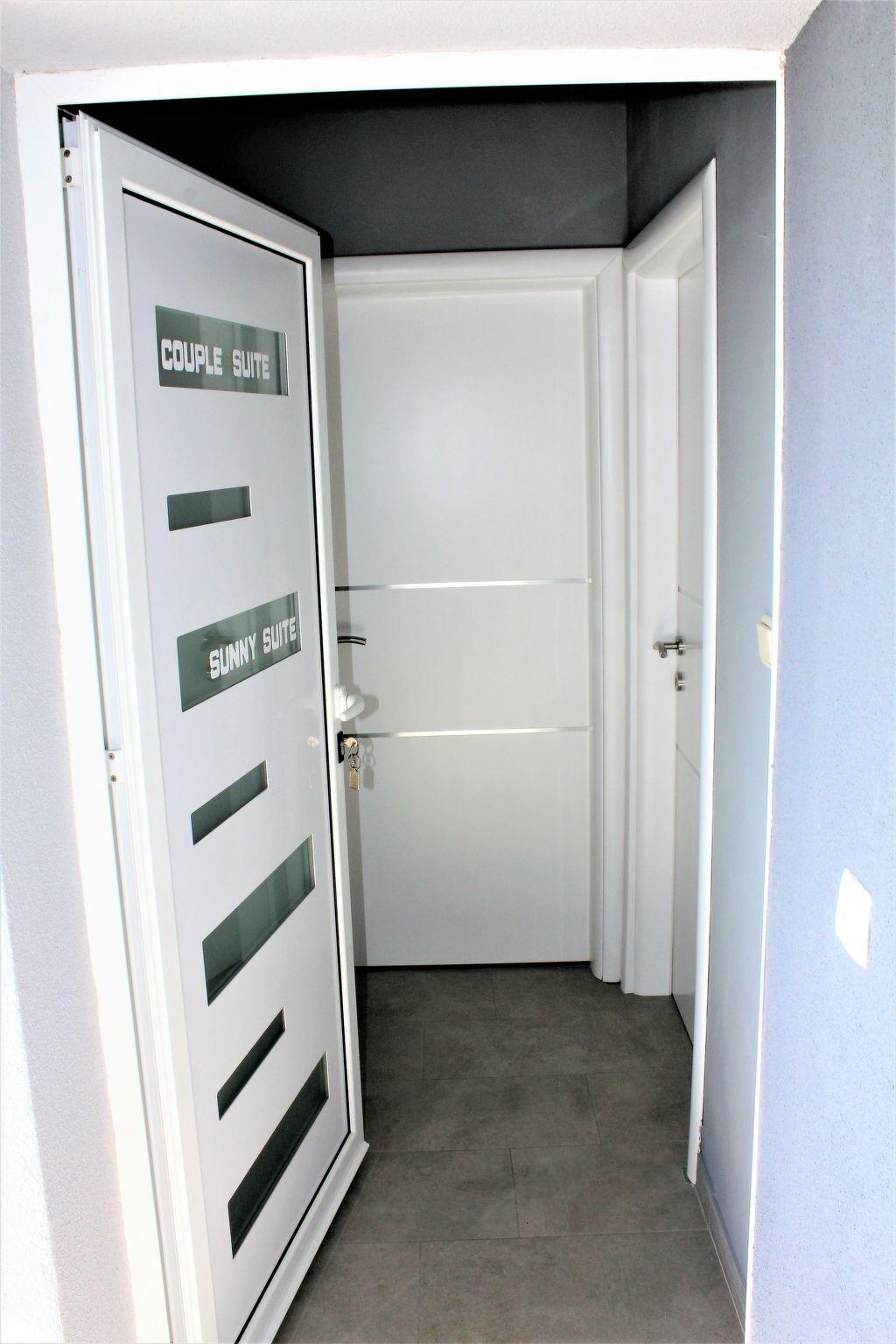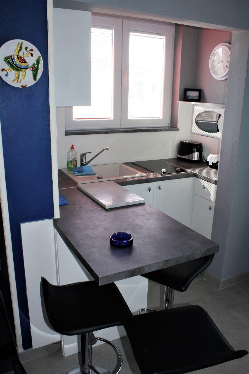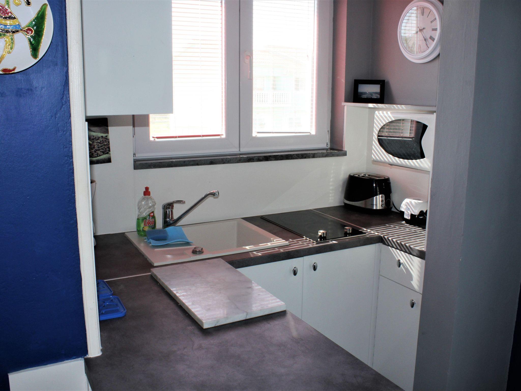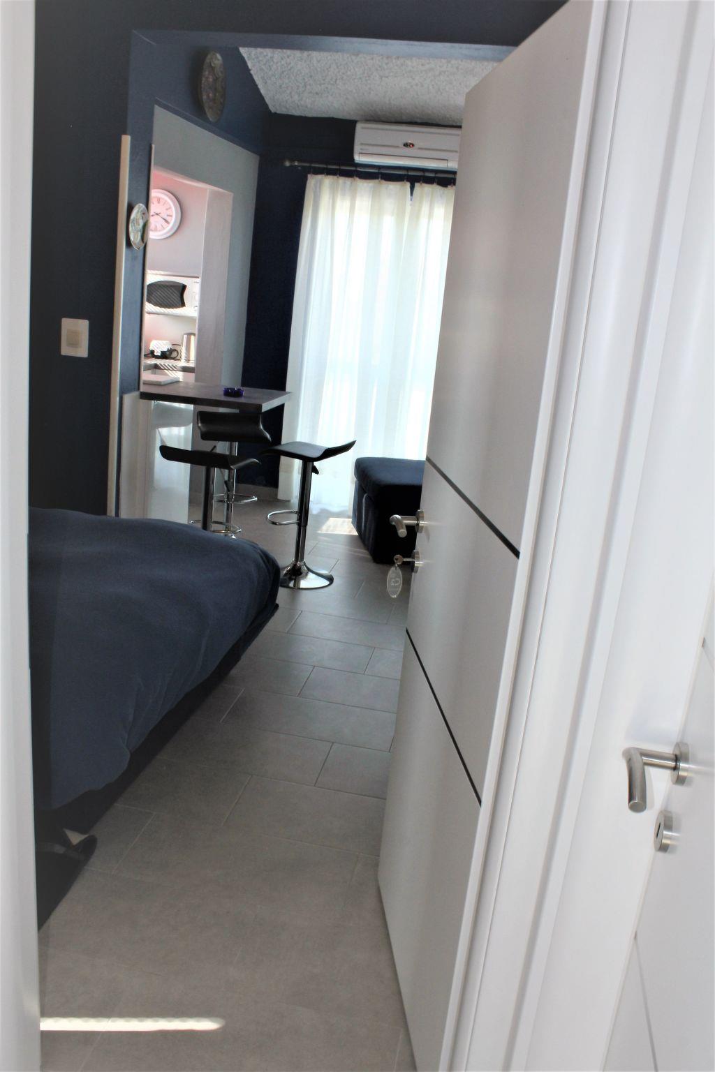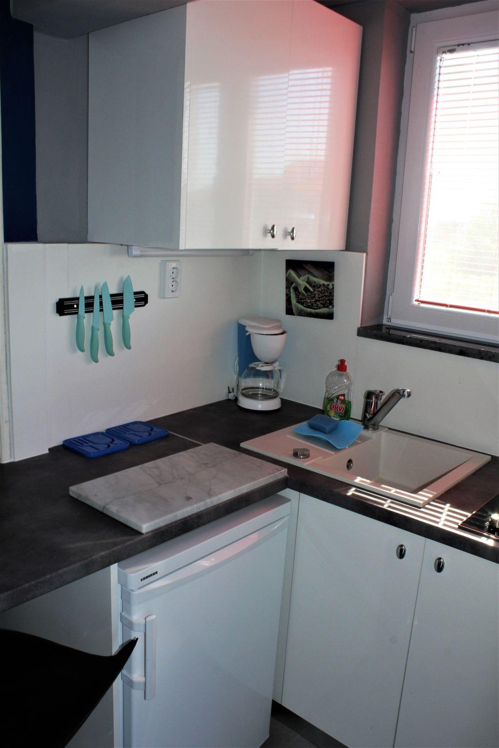 The studio apartment is on the first floor. There are two double beds in the living area. The kitchen has all necessary utensils, an oven, electric cooker hob, electric kettle, toaster, fridge-freezer, refrigerator for water. The bathroom is equipped with a shower. It is air conditioned, equipped with digital satellite system (approximately 2000 free channels), DVD player, and a 26 “LED TV. Internet access via WLAN. In the bathroom there is a washing machine which is used exclusively by guests of the apartments.