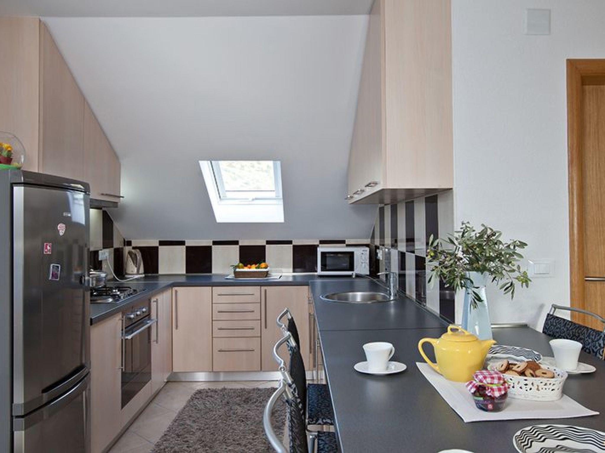 The apartment has 100m2 Is intended for 4 people and consist of 2 bed rooms with double bed, 2 bathrooms ( on with shower other only toilet ), open space living room and kitchen ( dish washer, owen, hob, coffe-machine, microwave, large frigo ) large balcony with table and chairs and sea view , air-condition,washing machine, SAT TV. outside grill.