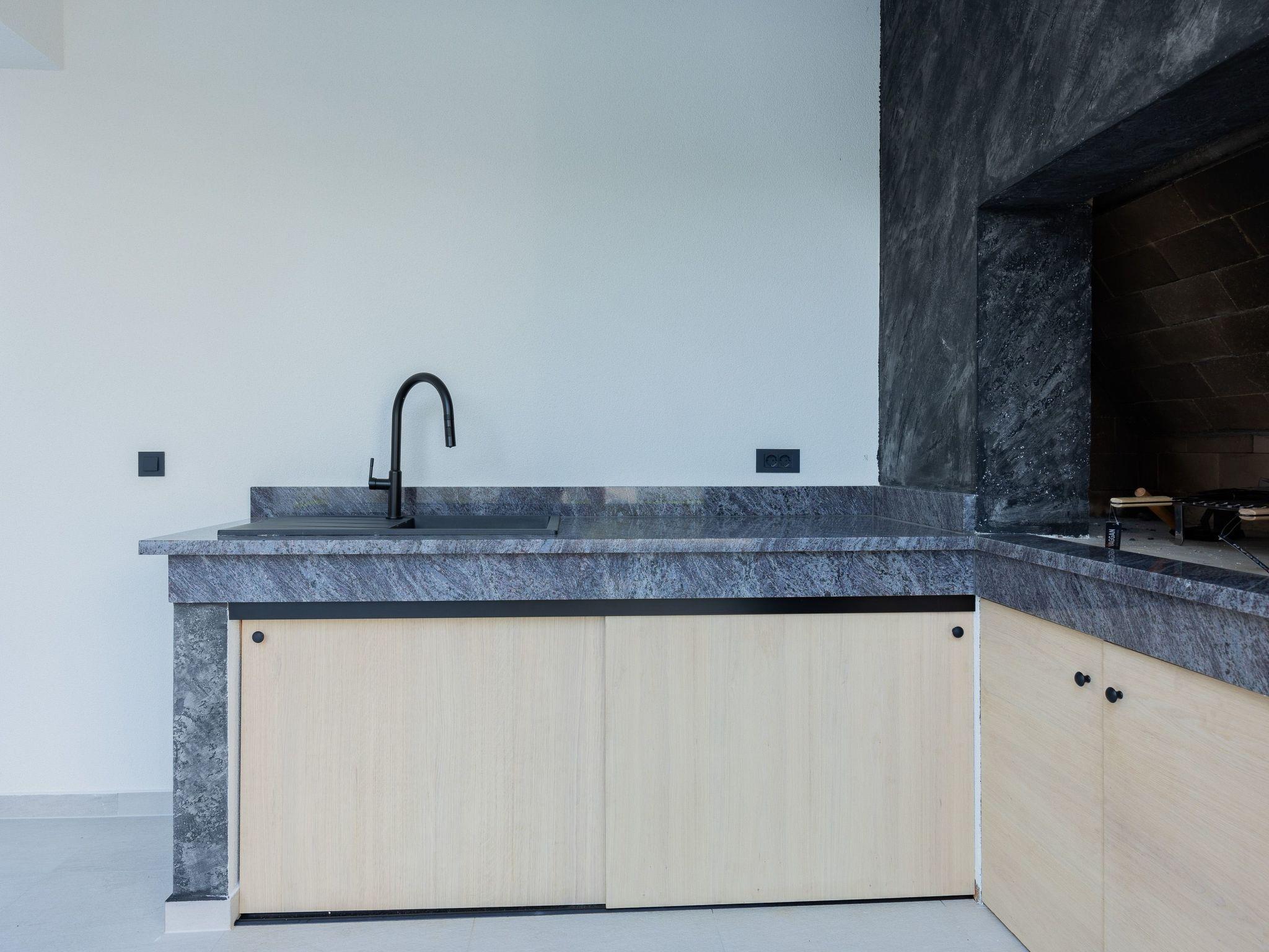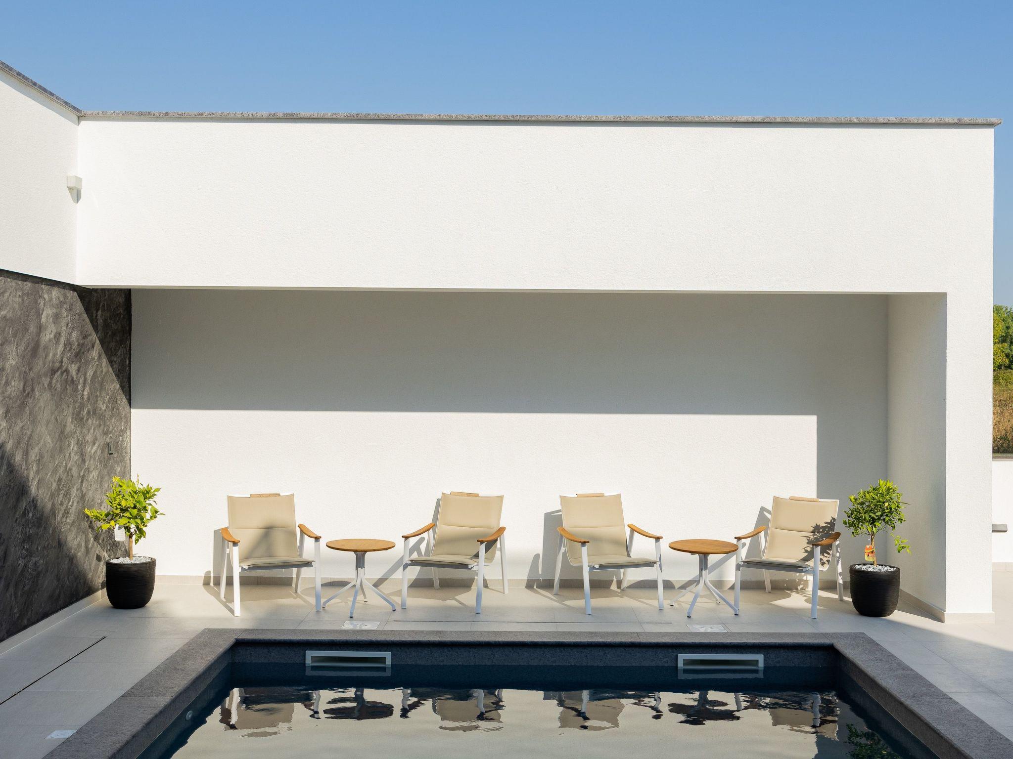 The 55 m² terrace on the ground floor includes a fully equipped outdoor kitchen, a barbecue, a dining room with a seating area for 10 people and access to a unique 8 metre heated swimming pool. Next to the pool there are sun loungers and an outdoor shower.