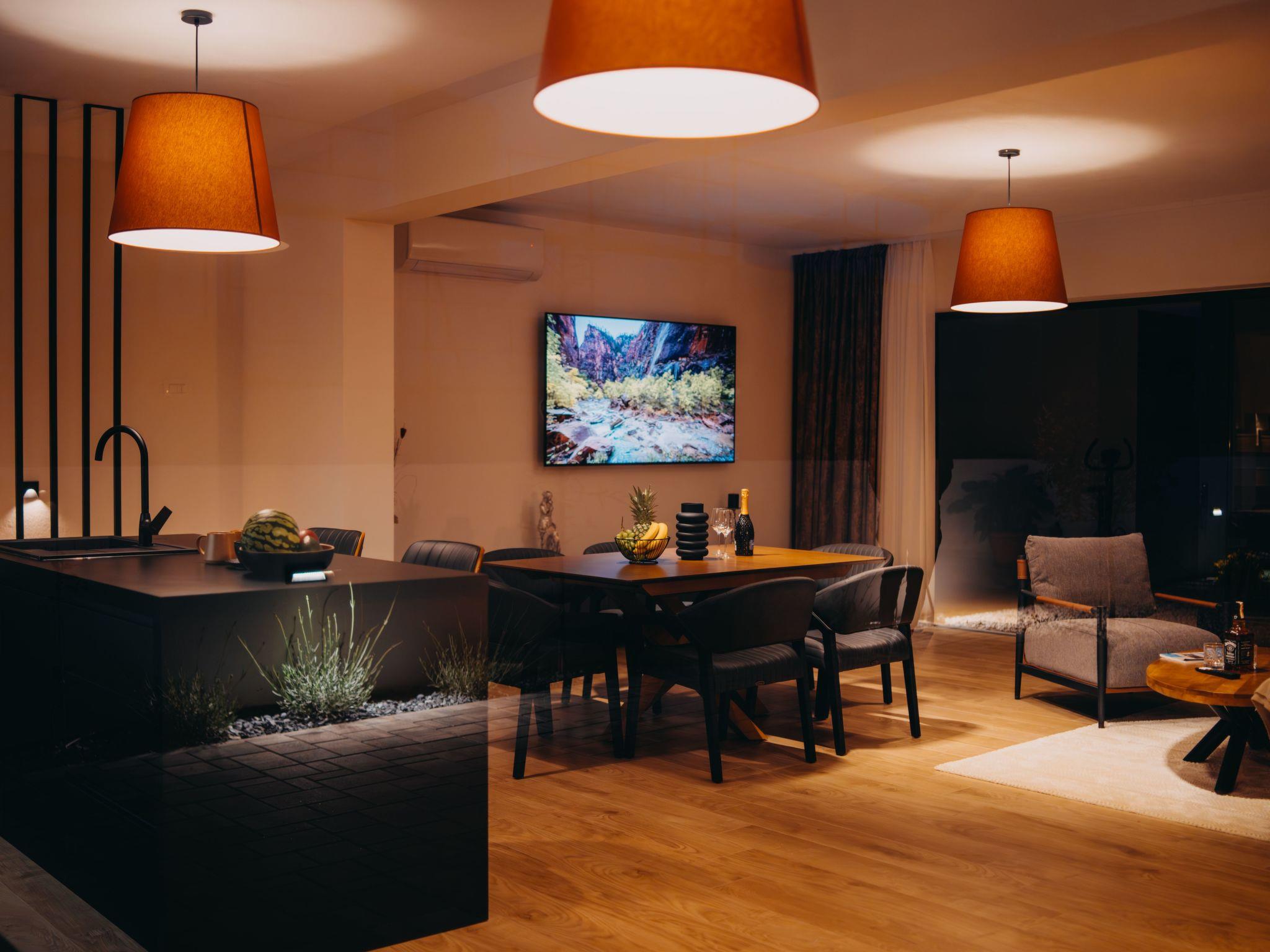 Inside, the house welcomes you with four elegantly furnished bedrooms, each featuring its own private bathroom equipped with a shower – promising privacy and convenience for all guests. The property prides itself on climate control, offering full air-conditioning and underfloor heating to guarantee a comfortable visit regardless of the season. The heart of the house, a modern kitchen, comes fully equipped with amenities including a dishwasher, a coffee machine for capsules/pods, and an electric kettle, catering to all your culinary desires. Additionally, a washing machine is available for your convenience, ensuring you can keep your wardrobe fresh throughout your stay.