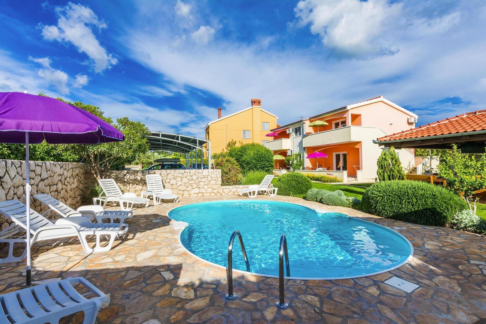 Lille feriekompleks med fælles pool, kun en kilometer fra stranden. Fem komfortabelt indrettede ferielejligheder er fordelt på første og anden sal, alle med WiFi og en møbleret terrasse eller balkon. I haven finder du en overdækket spiseplads og en grill til fælles brug. Her er også swimmingpoolen med havebruser, parasoller og liggestole. Selv morgenmad og aftensmad i form af en grill er tilgængelig på forespørgsel og mod betaling, hvis du ønsker at køkkenet i dit sommerhus skal holde sig koldt. Byen Nin ligger i en lavvandet lagune og er den ældste kroatiske kongeby med en smuk gammel bymidte. Oplev interessante udgravninger fra romertiden og kulturelle og historiske monumenter samt saltmuseet. Omkring tre kilometer øst for Nin finder du mange småstensbugter med områder til solbadning, restauranter og butikker, nogle sandstrande og en omfattende fyrreskov langs flodstien. Detaljer inclusive: WiFi, registreringsgebyr, Turistskat. Aktiviteter i nærheden: Mod et gebyr kan du også drage fordel af sports- og underholdningstilbuddene på Zaton Holiday Resort 1 km væk. En bred vifte af sports- og fritidsmuligheder venter på aktive feriegæster. Lokale udbydere tilbyder udflugter til Kornati-øgruppen offshore og andre interessante destinationer i området. Besøg metropolen Zadar og nationalparkerne Krka, Kornati og Paklenica. Mobility: Ikke egnet til personer med nedsat mobilitet.