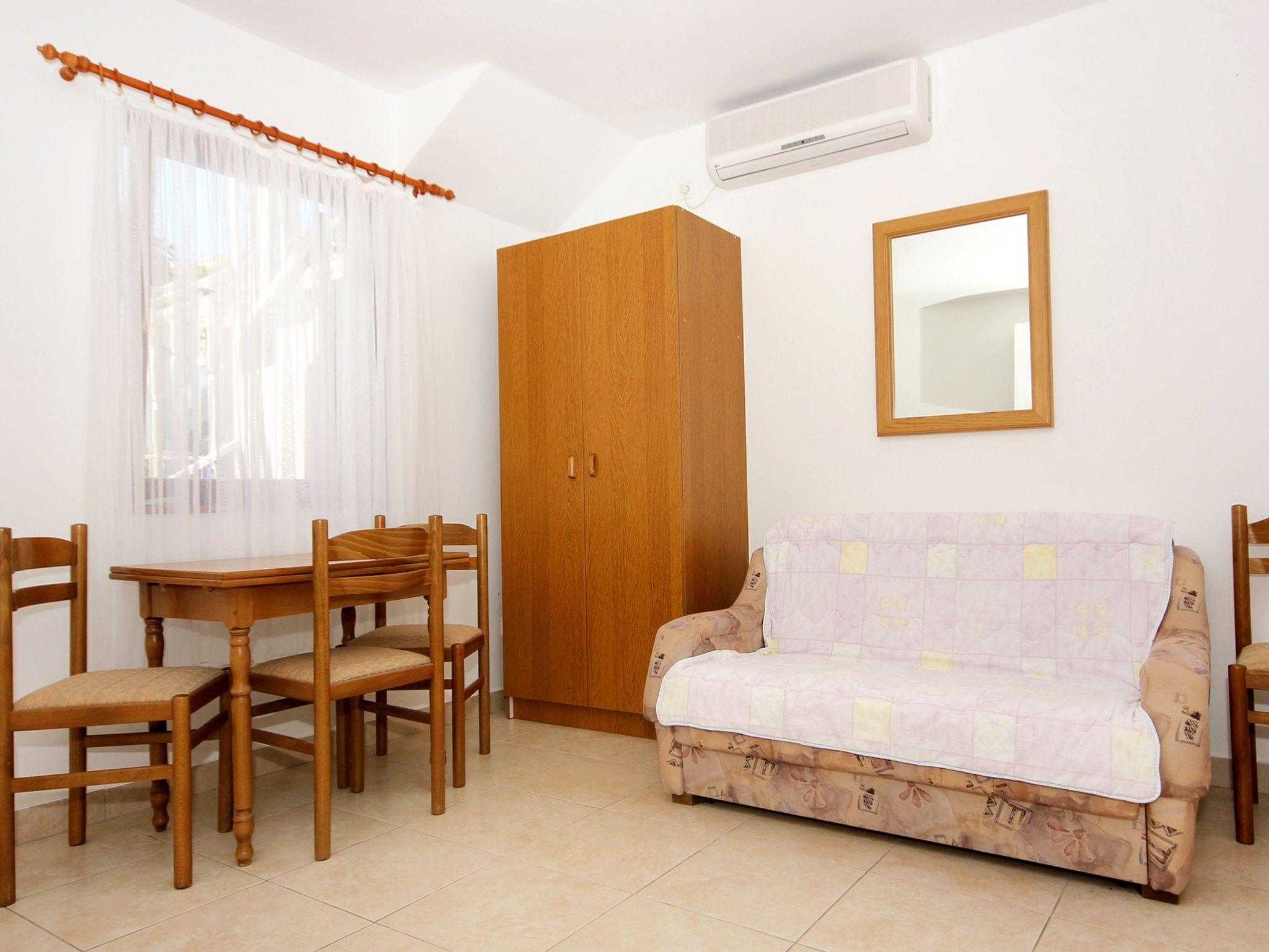 Studio bietet Platz für 3 Gäste. Die Betten sind in Schlafzimmern, die es 1 gibt, innerhalb einer Gesamtfläche von 24m2, angeordnet. Die Gäste haben eine eigene Terrasse zur Verfügung, auf der sie in warmen Sommernächten genießen können. Es ist erlaubt, Speisen auf dem Gemeinschafts-Grill vorzubereiten. Durch die Terrasse der gebuchten Unterkunftseinheit gehen auch andere Gäste oder Vermieter. IM PREIS INBEGRIFFEN: Kurtaxe, Endreinigung, Klimatisierung, Parkplatz, Internet, Bootsanlegeplatz, Zusatzbett. VERBINDLICHE ZUSÄTZLICHE KOSTEN: Aufzahlung für Kurzaufenthalte (prozentualer Zuschlag pro Nächtigungsanzahl: 30% - 1, 20% - 2, 10% - 3). Die Verfügbarkeit zusätzlicher Dienstleistungen in Ihrem reservierten Termin und die Preise derselben (falls nicht aufgeführt) müssen im Voraus überprüft werden. Zusätzliche Dienstleistungen die in der Zahlungsaufforderung nicht aufgeführt sind werden direkt beim Vermieter bezahlt, angenommen der Gast nutzt auch diese.