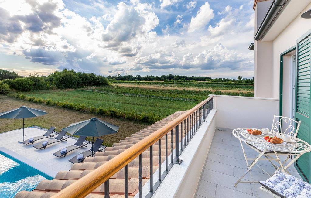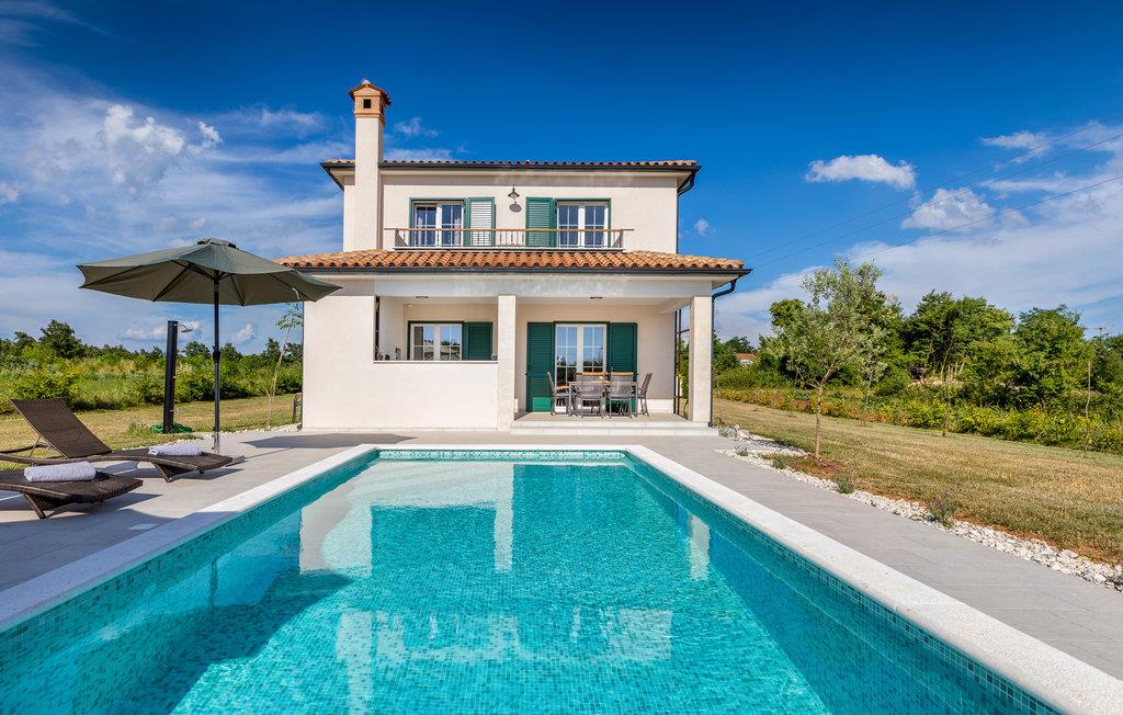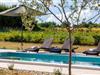 Feriehus med pool, omgivet af natur.