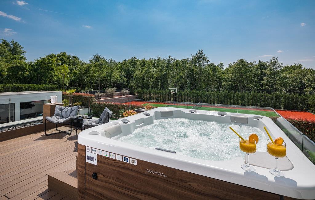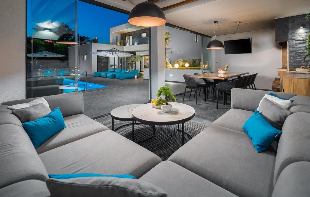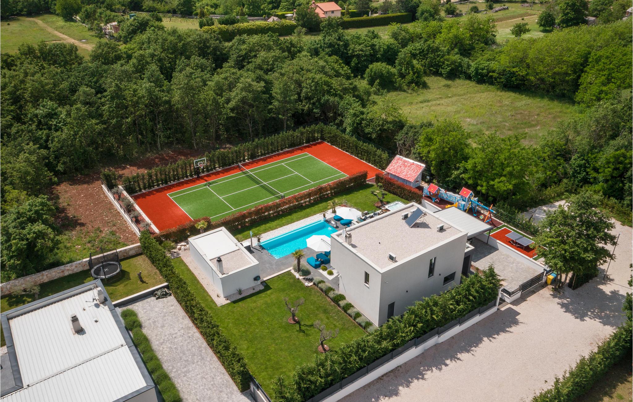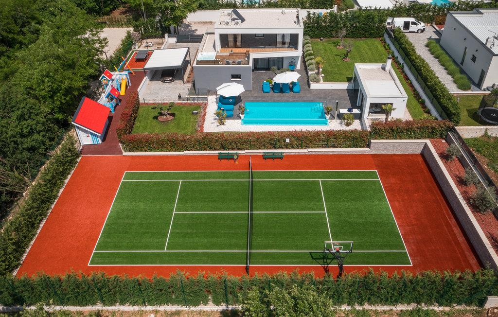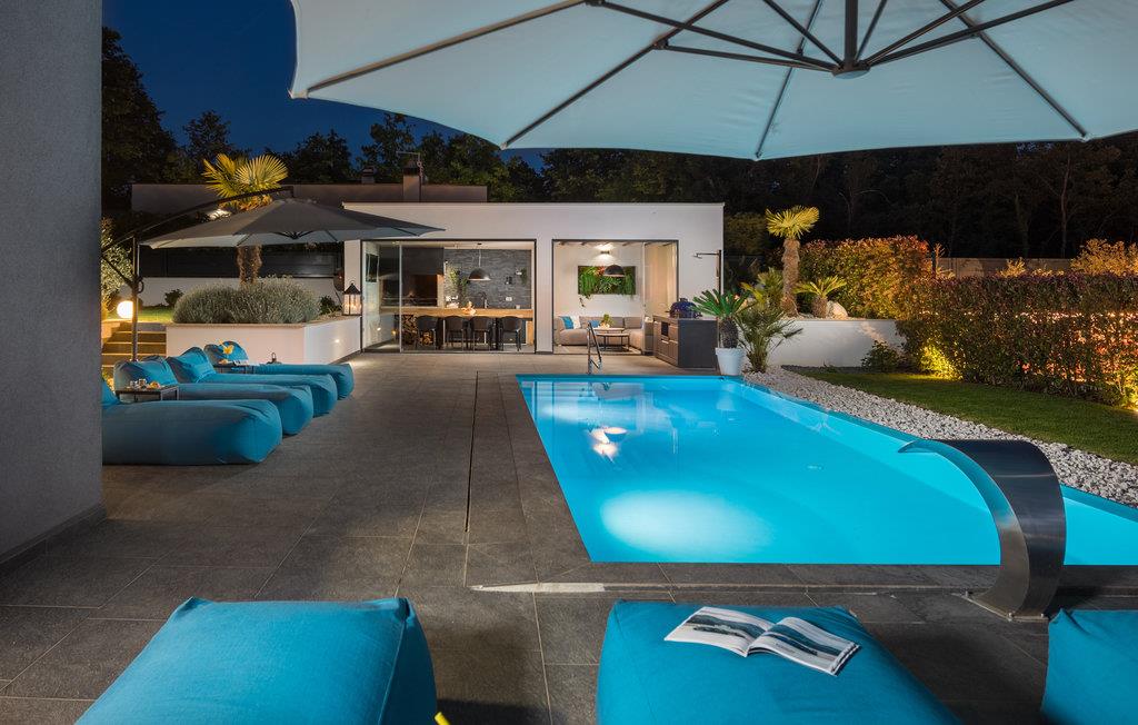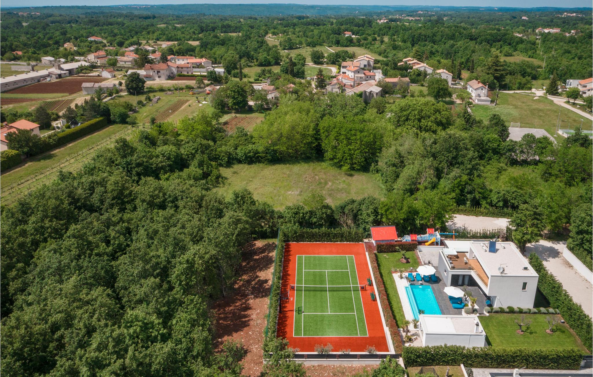 Den imponerende ferievilla er moderne designet til en komfortabel ferie. Denne smukke villa er ikke kun visuelt tiltalende, men også indrettet med alle former for komfort. Den ligger i det indre Istrien, omgivet af grønne områder, på en ca. 1000 m² stor og indhegnet grund, med en høj grad af fred og privatliv. Interiøret strækker sig over stueetagen og første sal. Det store lyse indre består af en stor stue med pejs, køkken og spiseplads, mens hvert soveværelse har eget badeværelse med aircondition og fjernsyn. Kæmpe glasflader oversvømmer værelserne med lys og giver direkte adgang til terrasserne, der vender ud mod haven og poolområdet. I haven finder ligger den forfriskende pool med område til solbad og der er et udendørs køkken ved siden af en hyggelig lounge. Selv de små gæster vil ikke kede sig i dette drømmehus, er mange muligheder for leg og sjov.