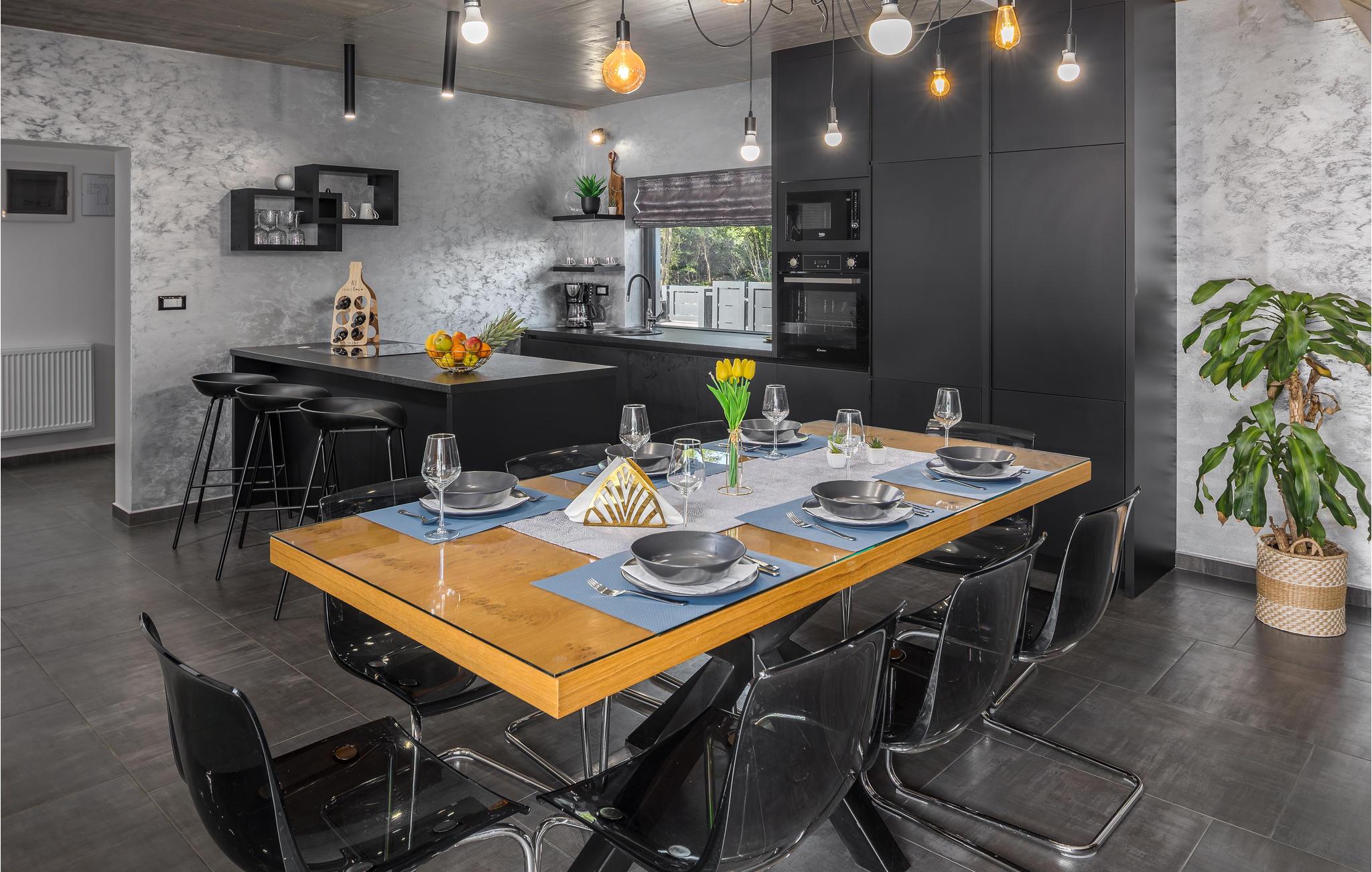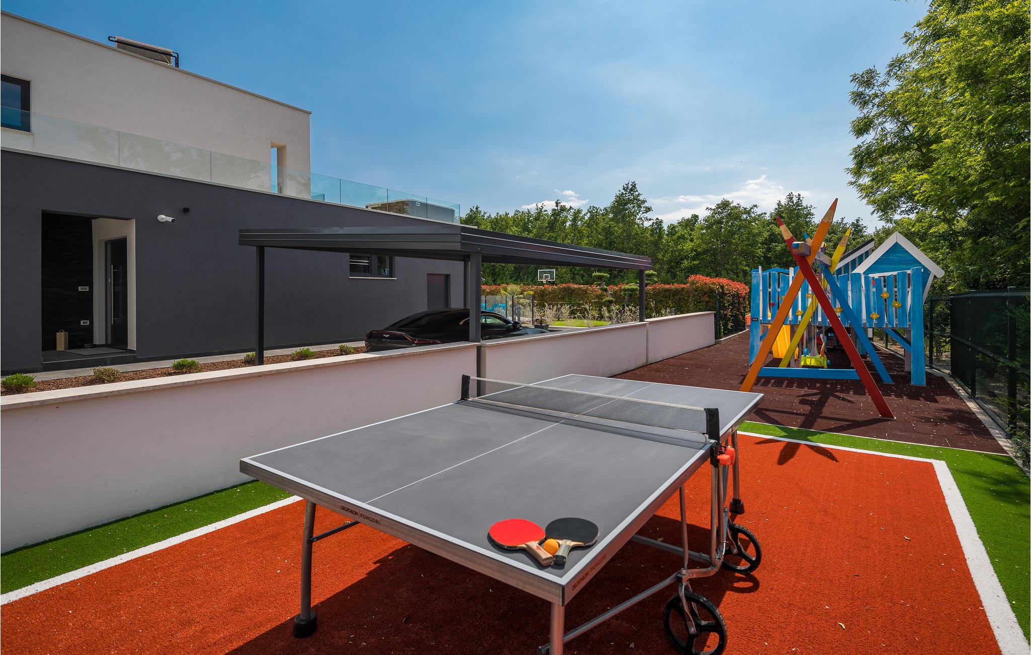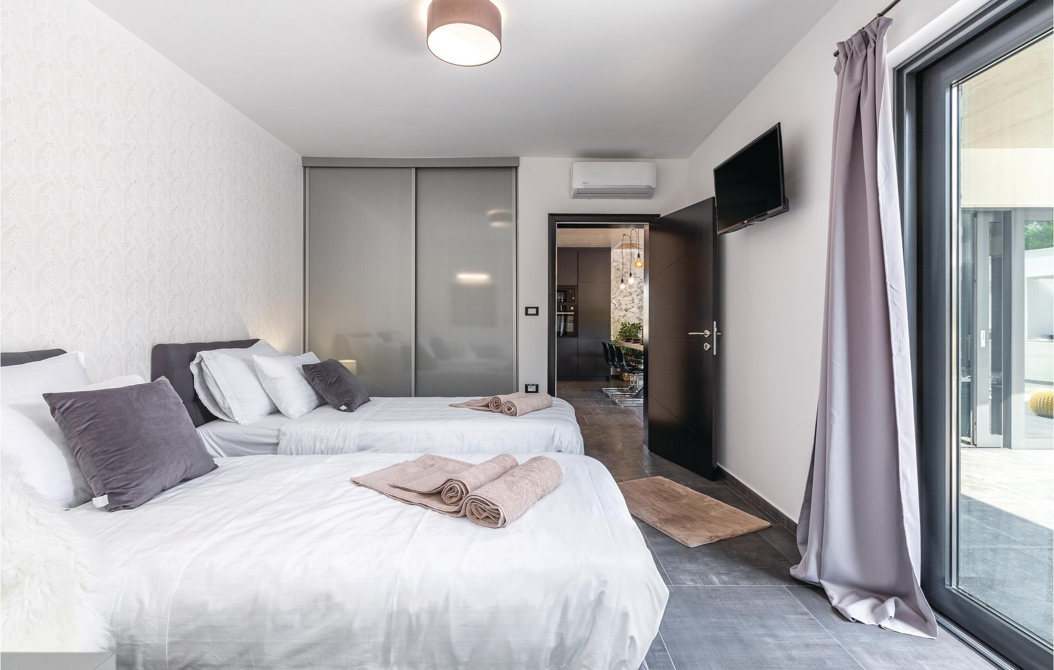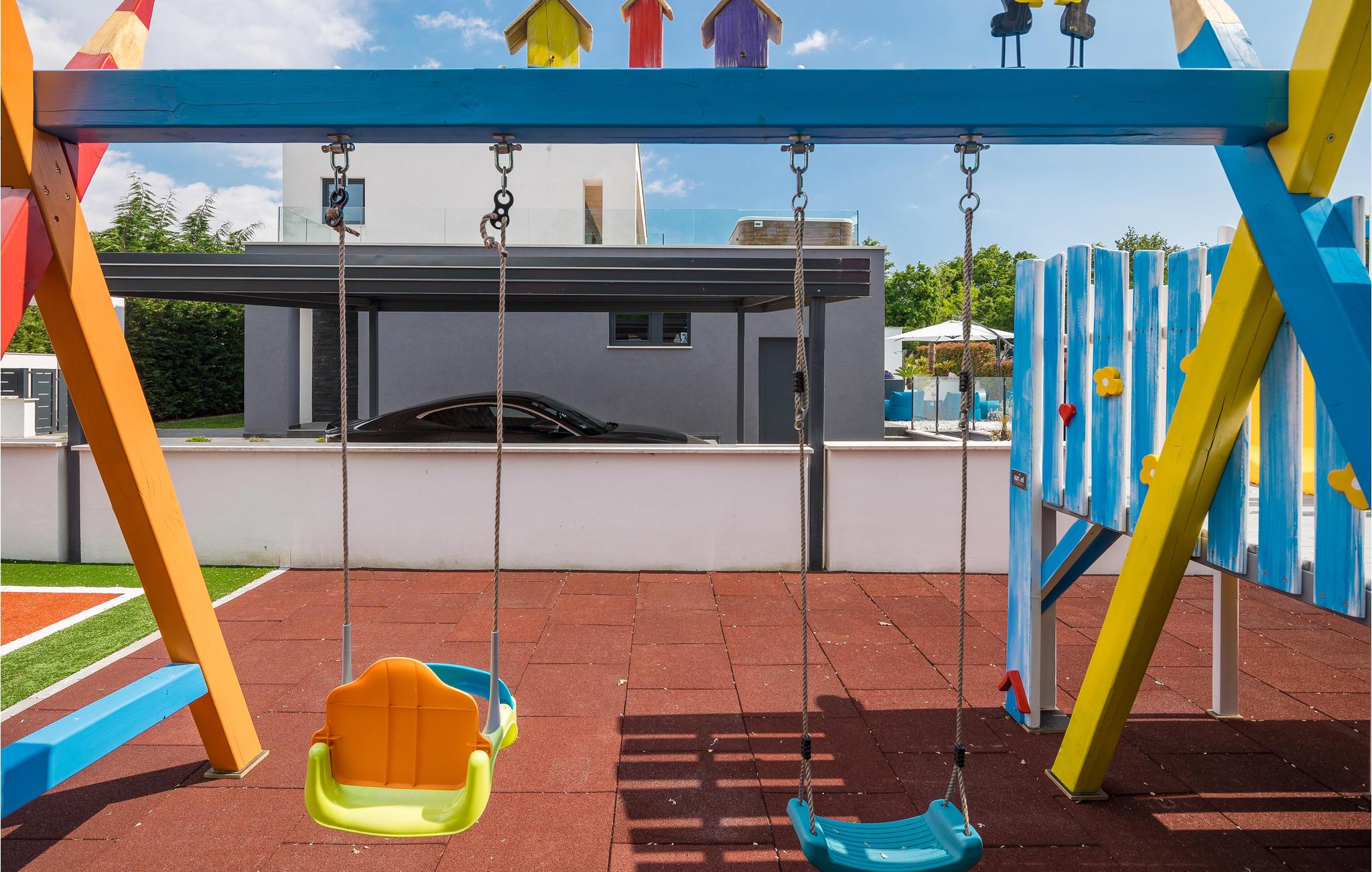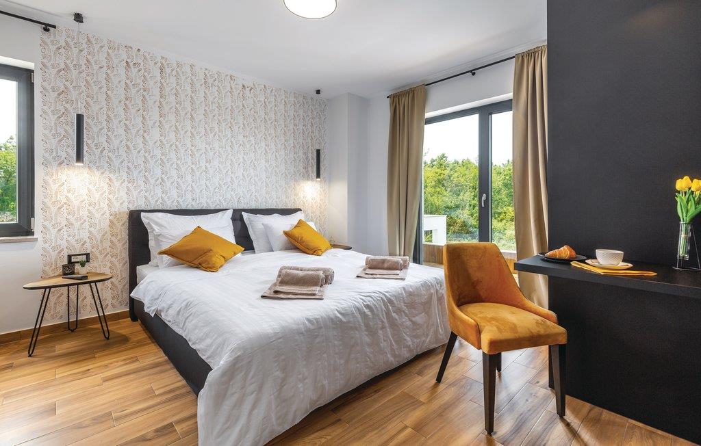 Den imponerende ferievilla er moderne designet til en komfortabel ferie. Denne smukke villa er ikke kun visuelt tiltalende, men også indrettet med alle former for komfort. Den ligger i det indre Istrien, omgivet af grønne områder, på en ca. 1000 m² stor og indhegnet grund, med en høj grad af fred og privatliv. Interiøret strækker sig over stueetagen og første sal. Det store lyse indre består af en stor stue med pejs, køkken og spiseplads, mens hvert soveværelse har eget badeværelse med aircondition og fjernsyn. Kæmpe glasflader oversvømmer værelserne med lys og giver direkte adgang til terrasserne, der vender ud mod haven og poolområdet. I haven finder ligger den forfriskende pool med område til solbad og der er et udendørs køkken ved siden af en hyggelig lounge. Selv de små gæster vil ikke kede sig i dette drømmehus, er mange muligheder for leg og sjov.