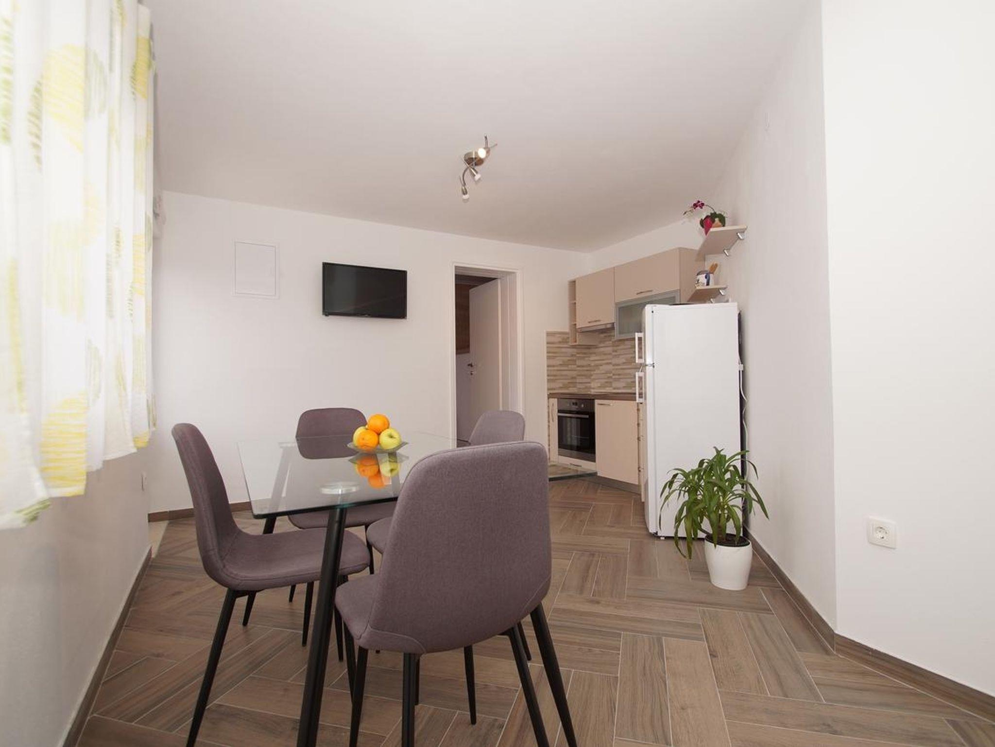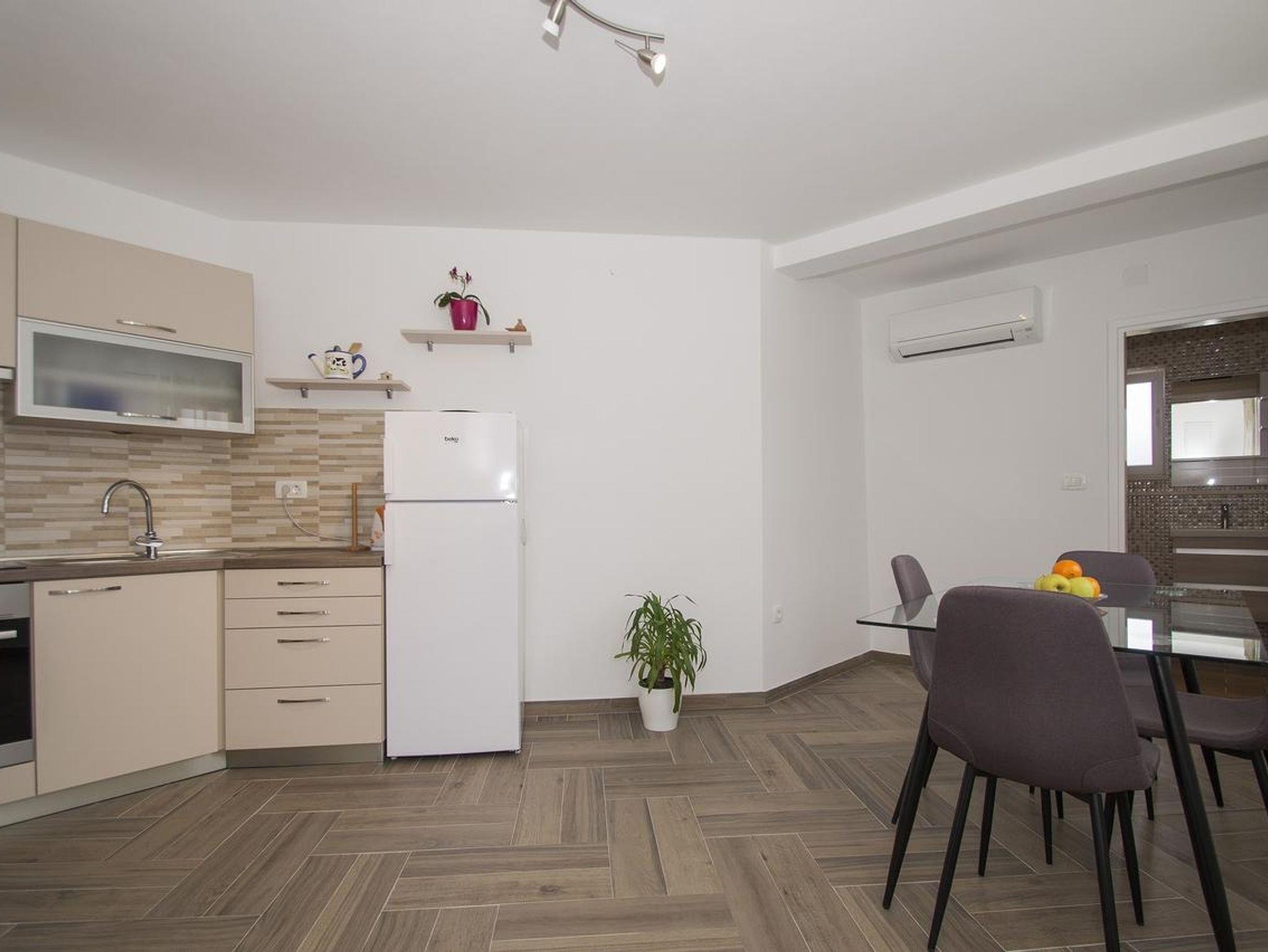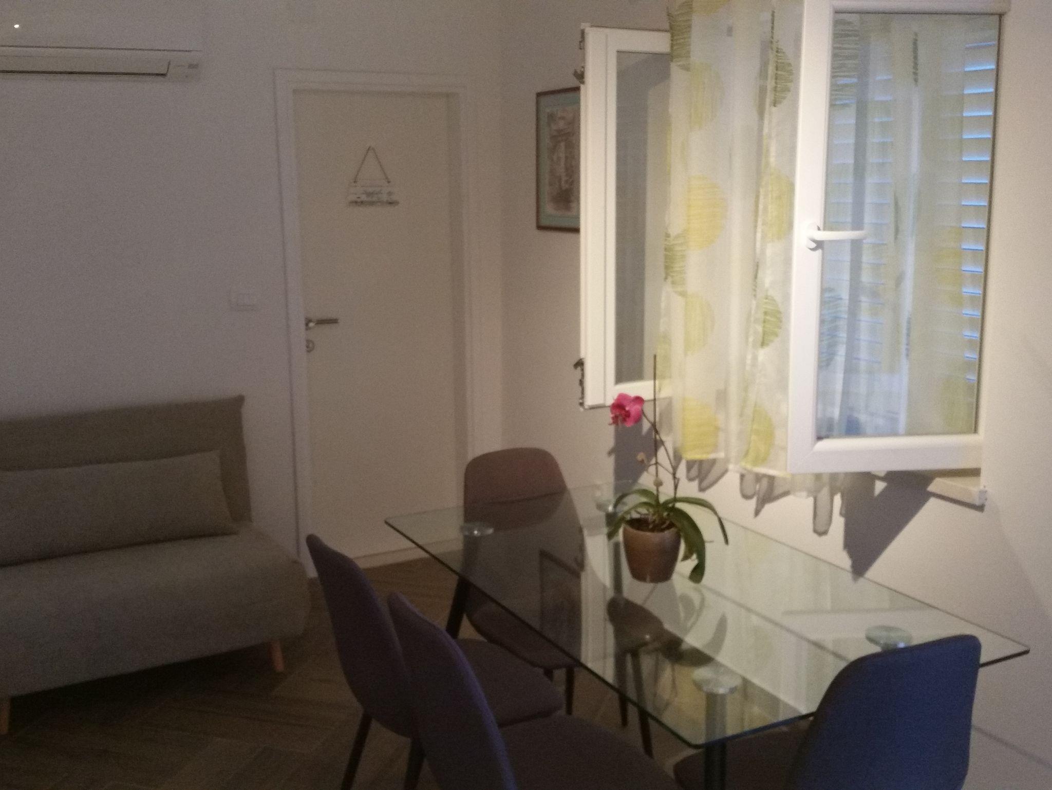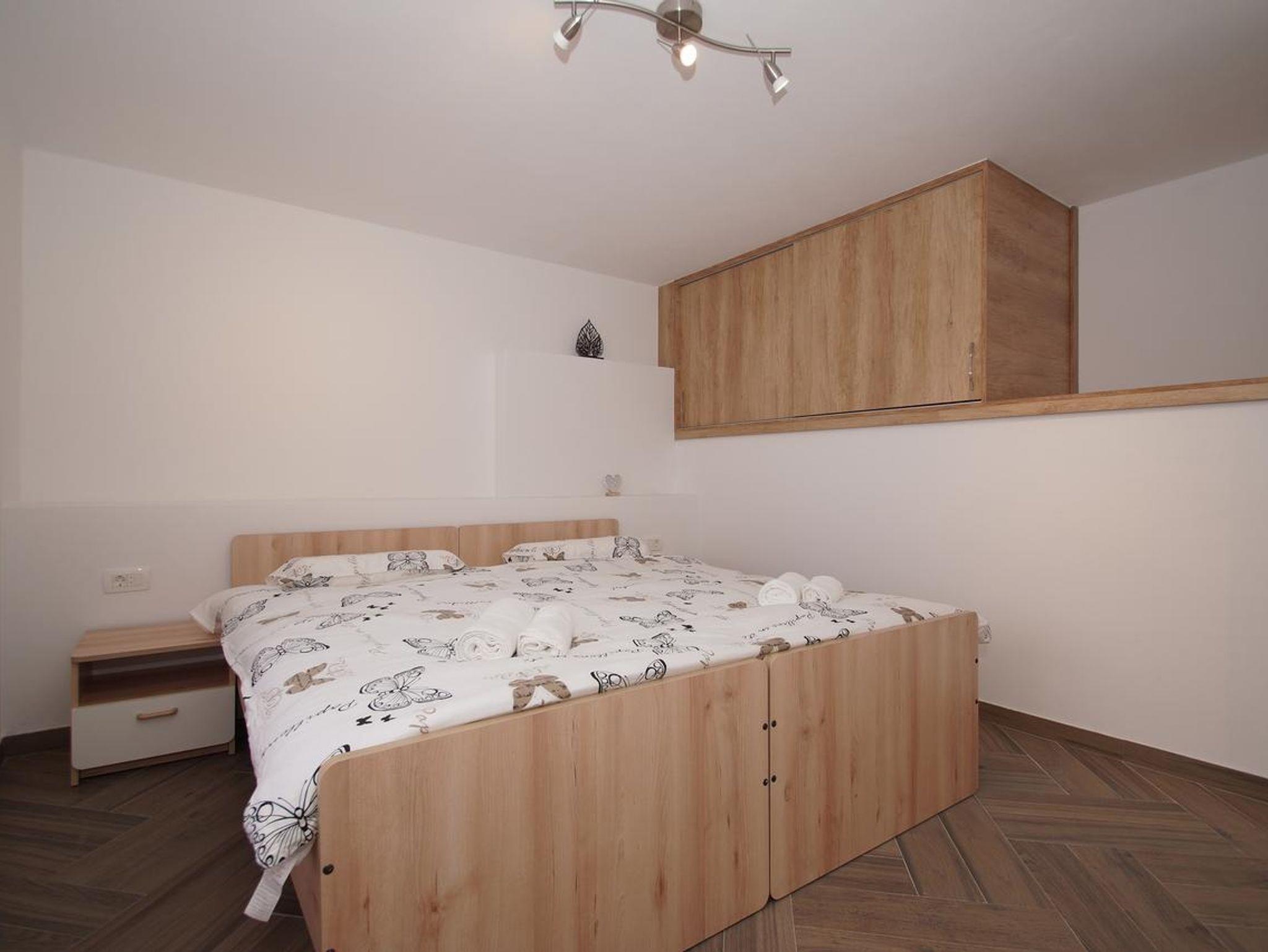 Ferienwohnung bietet Platz für 3 Gäste. Die Betten sind in Schlafzimmern, die es 1 gibt, und in Esszimmer, innerhalb einer Gesamtfläche von 28m2, angeordnet. Die Gäste haben eine eigene Terrasse zur Verfügung, auf der sie in warmen Sommernächten genießen können. Das Apartment bietet Meerblick. Es ist erlaubt, Speisen auf dem Gemeinschafts-Grill vorzubereiten. IM PREIS INBEGRIFFEN: Kurtaxe, Endreinigung, Klimatisierung, Parkplatz, Internet, Kinderbett, Föhn, tragbarer Grill. VERBINDLICHE ZUSÄTZLICHE KOSTEN: Aufzahlung für Kurzaufenthalte (prozentualer Zuschlag pro Nächtigungsanzahl: 30% - 1, 20% - 2, 10% - 3). Die Verfügbarkeit zusätzlicher Dienstleistungen in Ihrem reservierten Termin und die Preise derselben (falls nicht aufgeführt) müssen im Voraus überprüft werden. Zusätzliche Dienstleistungen die in der Zahlungsaufforderung nicht aufgeführt sind werden direkt beim Vermieter bezahlt, angenommen der Gast nutzt auch diese.