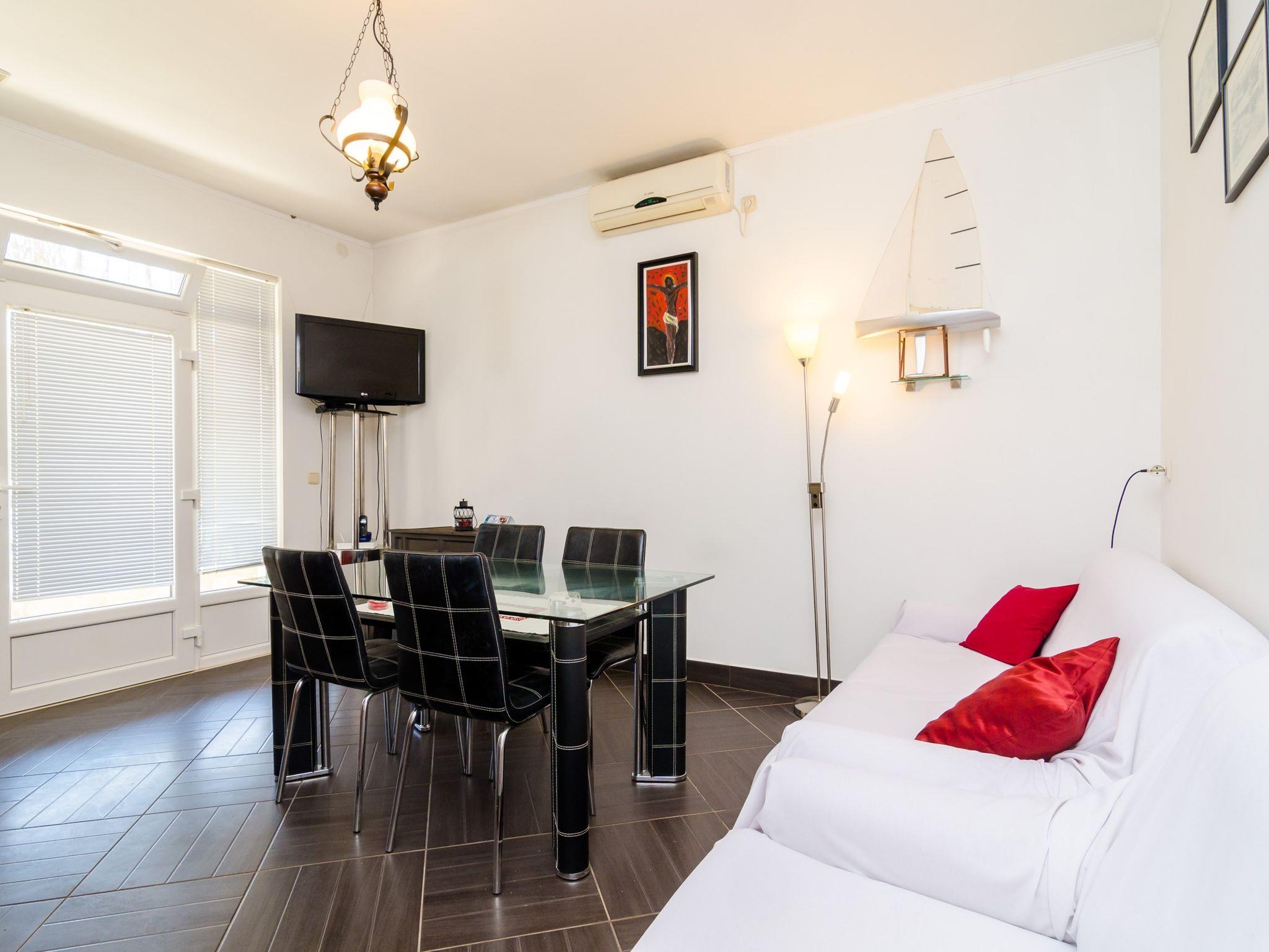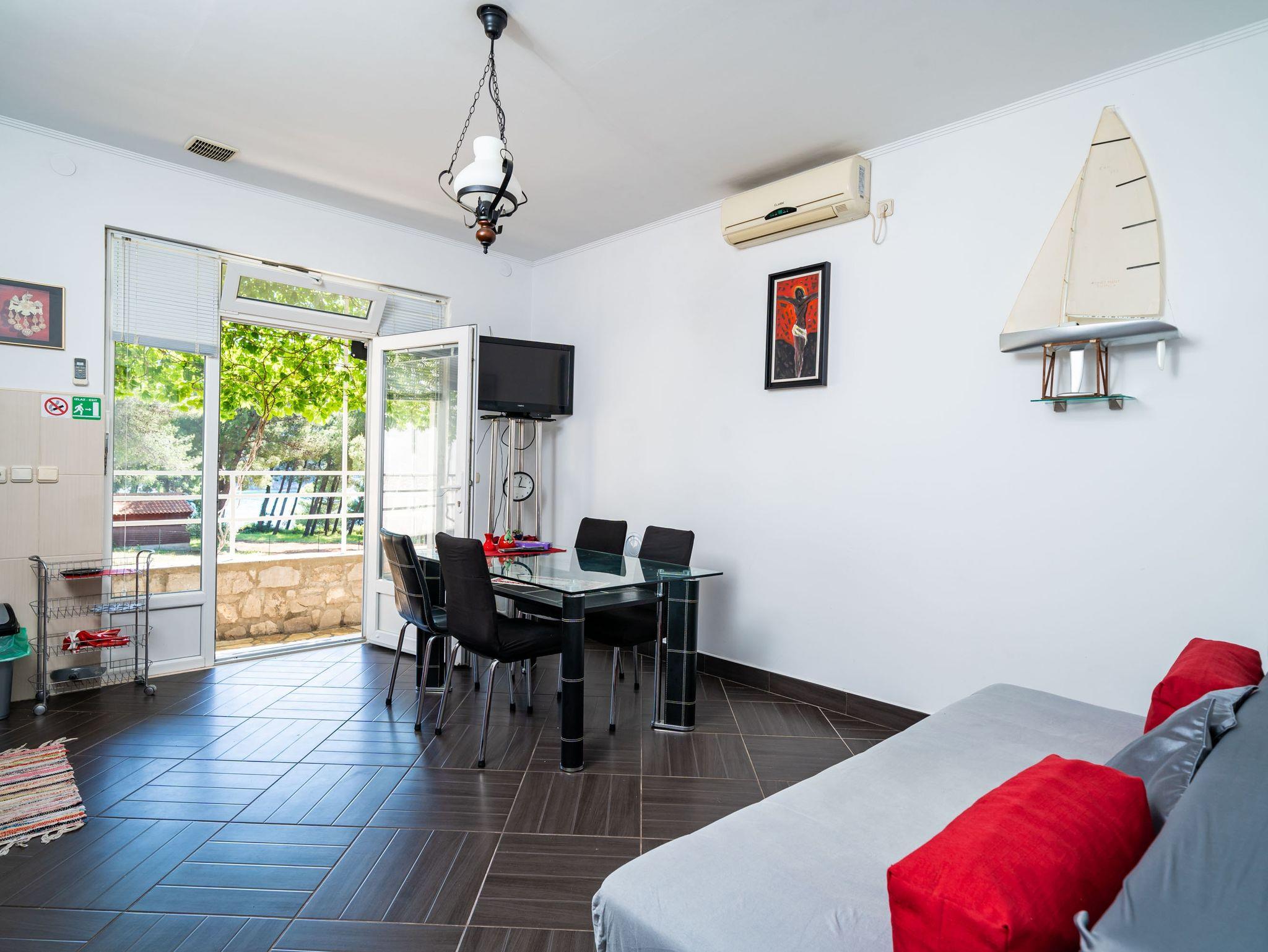 Ferienwohnung bietet Platz für 4 Gäste. Die Betten sind in Schlafzimmern, die es 1 gibt, und in Wohnzimmer, innerhalb einer Gesamtfläche von 35m2, angeordnet. Die Gäste haben eine eigene Terrasse zur Verfügung, auf der sie in warmen Sommernächten genießen können. Das Apartment bietet Meerblick. Es ist erlaubt, Speisen auf dem Gemeinschafts-Grill vorzubereiten. IM PREIS INBEGRIFFEN: Kurtaxe, Endreinigung, Klimatisierung, Parkplatz, Internet, Bootsanlegeplatz, Föhn. Die Verfügbarkeit zusätzlicher Dienstleistungen in Ihrem reservierten Termin und die Preise derselben (falls nicht aufgeführt) müssen im Voraus überprüft werden. Zusätzliche Dienstleistungen die in der Zahlungsaufforderung nicht aufgeführt sind werden direkt beim Vermieter bezahlt, angenommen der Gast nutzt auch diese.