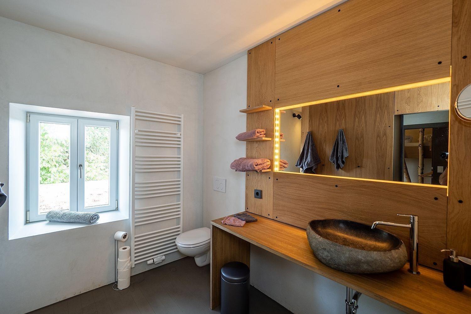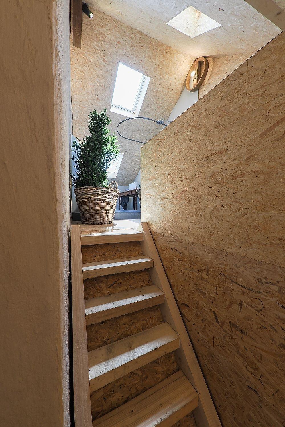 Die für diesen atypischen Raum verwendeten Materialien sind roher Beton, Massivholz und traditionelle Kalkfarbe. Diese Komposition hat ein rustikales und sauberes Design, das ein "männliches und maskulines" Gefühl vermittelt.