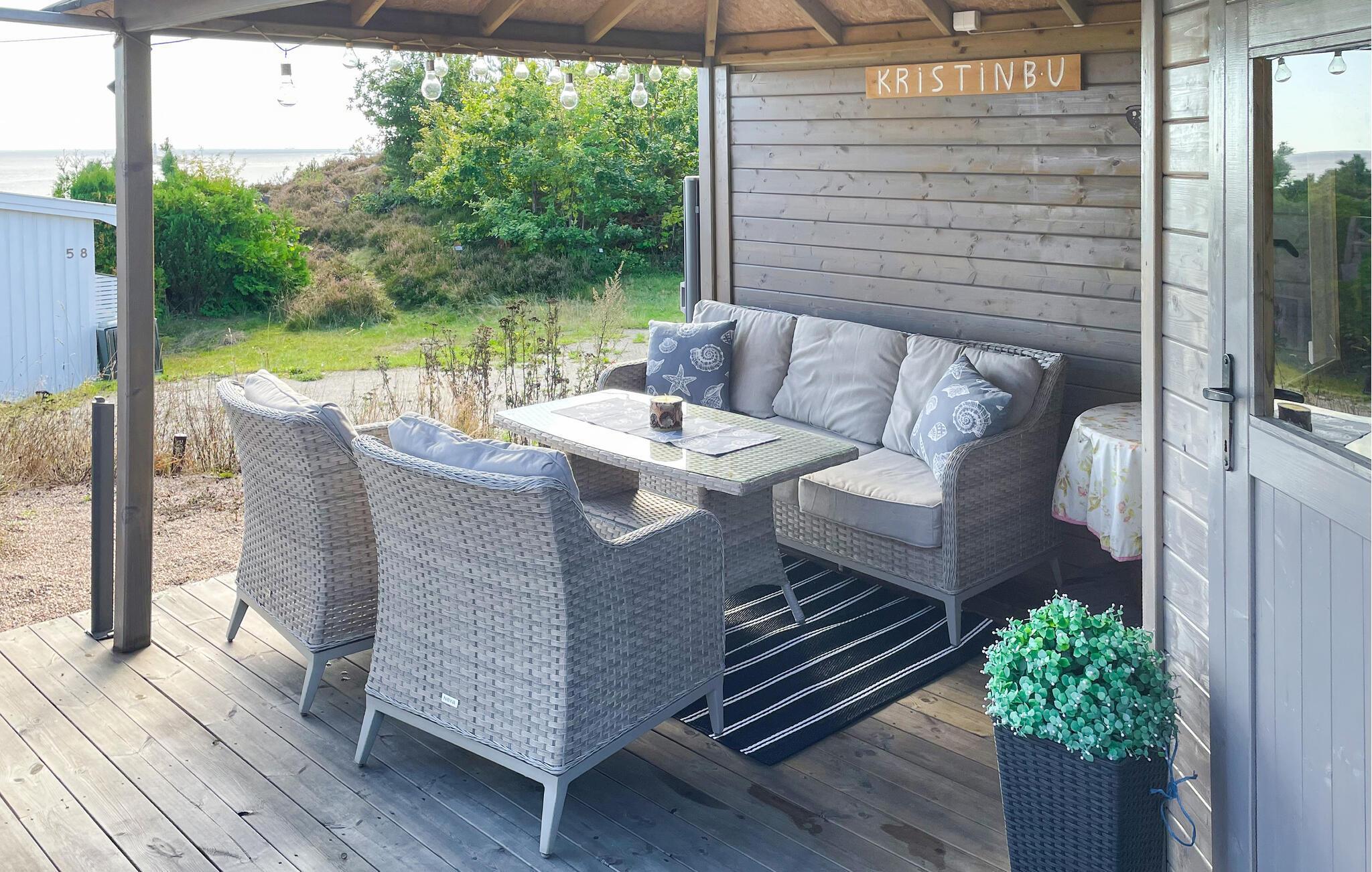 Slap af når som helst på den overdækkede terrasse og nyd den friske luft. Det store siddeområde lægger op til at nyde måltider sammen eller et glas vin om aftenen. Selv på kølige dage er dette sted en skøn oase, hvor I kan kombinere nærhed til naturen med komforten i en stue.