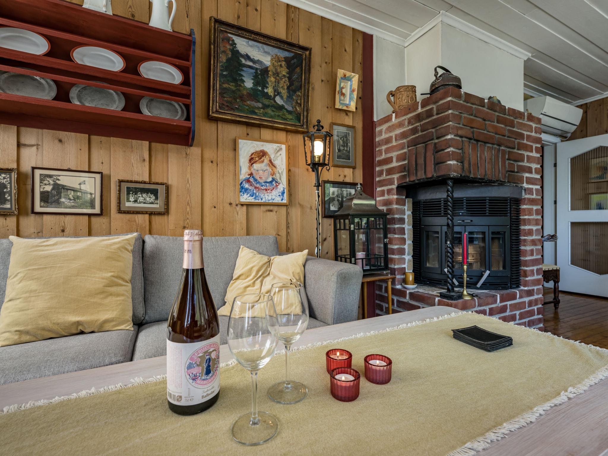 "Eseviki", 4-room house 90 m2 on 2 levels. Renovated in 2011, tasteful and cosy furnishings: living/dining room with open-hearth fireplace, dining table and TV. Exit to the terrace. 1 room with 2 beds. Open kitchen (4 hot plates, oven, toaster, kettle, microwave, freezer, electric coffee machine). Shower/WC. Upper floor: 2 rooms, each room with 2 beds. Electric heating, underfloor heating. Wooden floors. Terrace. Terrace furniture, barbecue. Marvellous view of the sea, the countryside and fjord. Facilities: washing machine. Internet (WiFi, free). Please note: non-smokers only. Smoke alarm, fire extinguisher. Freezer approx. 40 l. 924531169